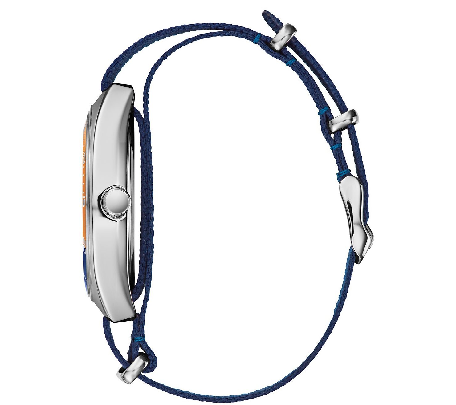 • Striped orange and navy NATO nylon strap with silvertone sliding clasp and buckle closure