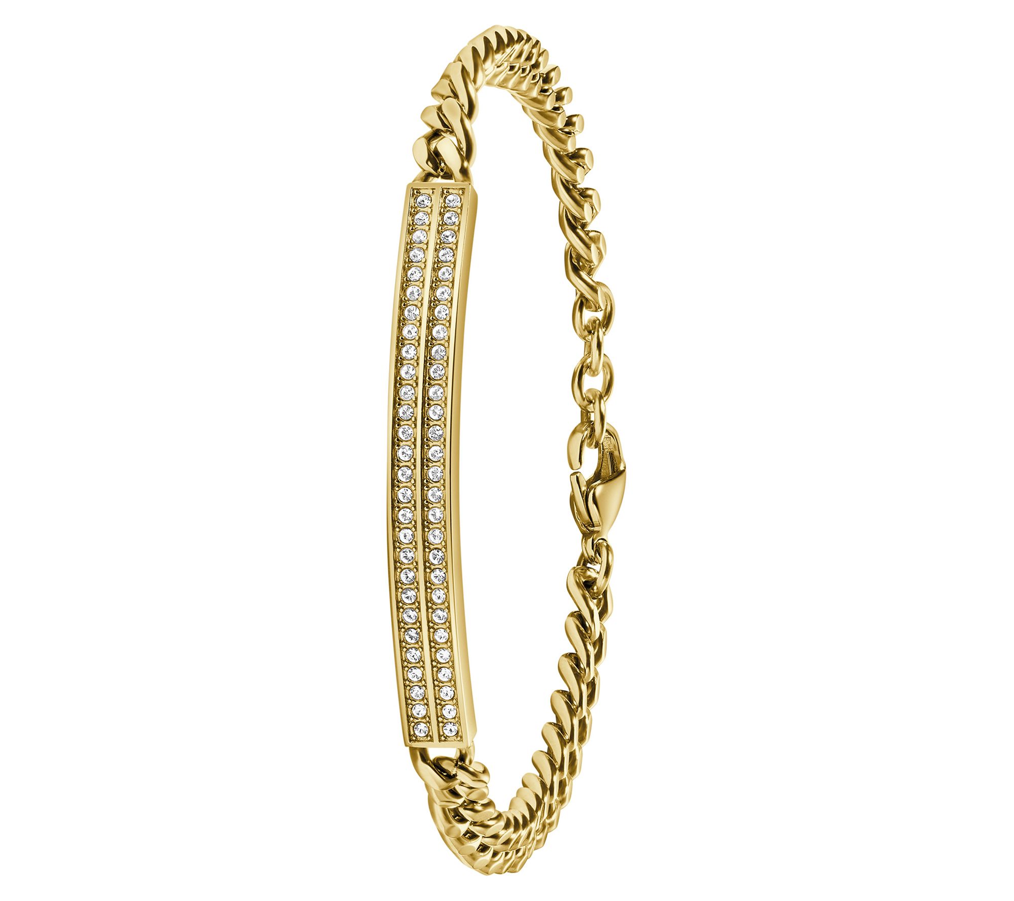 • Bracelet: polished link chain; center plate with round, pave-set crystals; lobster claw clasp