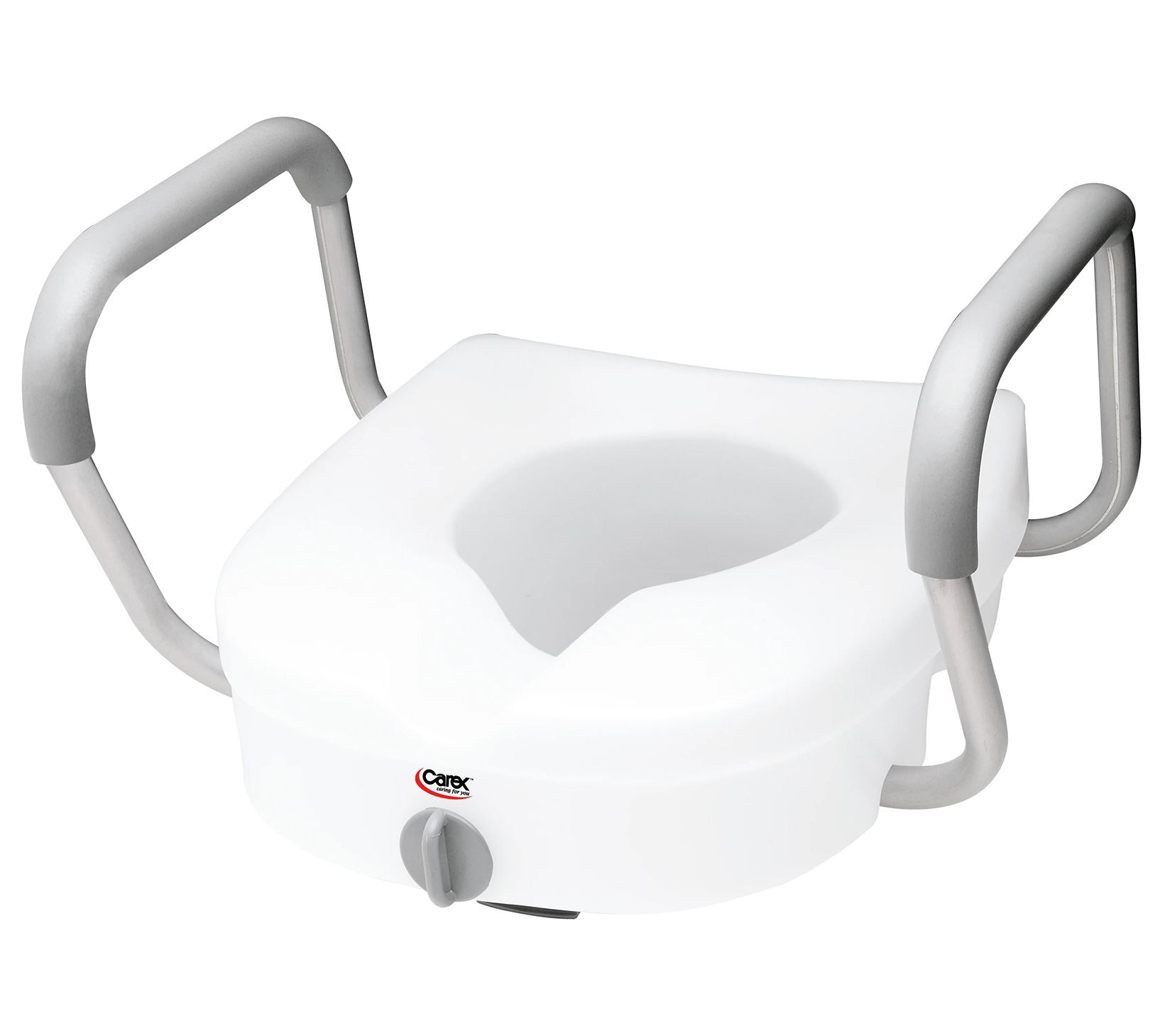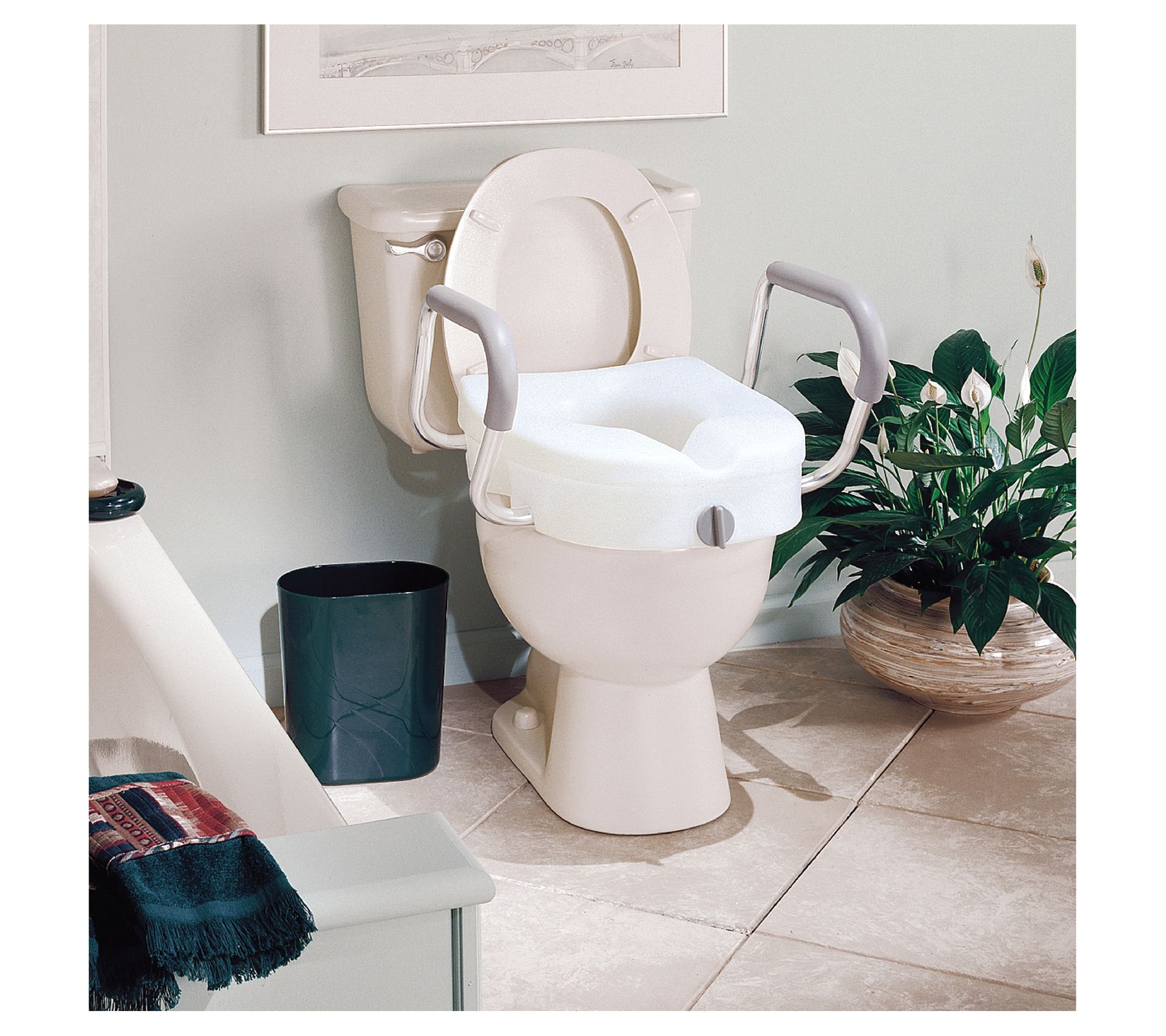 Make bathroom visits easier and safer with the Carex E-Z Lock Raised Toilet Seat with Adjustable Armrests. Adding 5"H, it assists those with bending or sitting difficulties. The adjustable, padded armrests provide added support and comfort. From Carex.