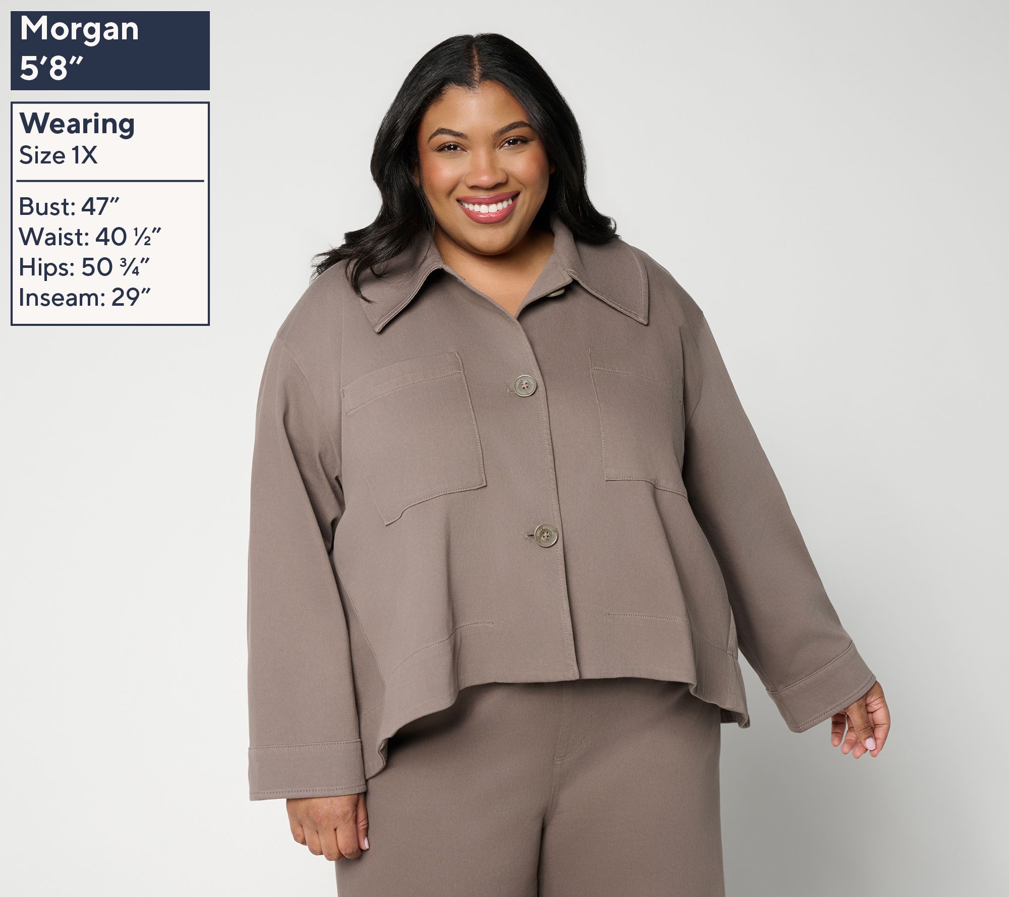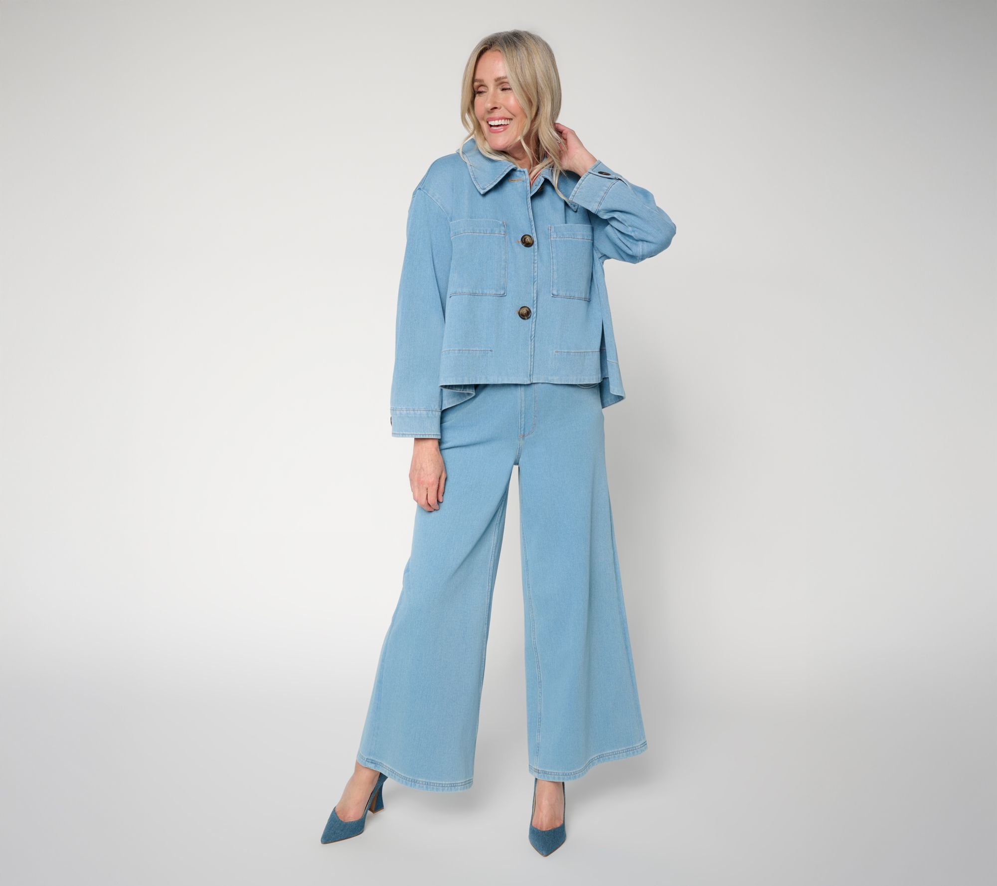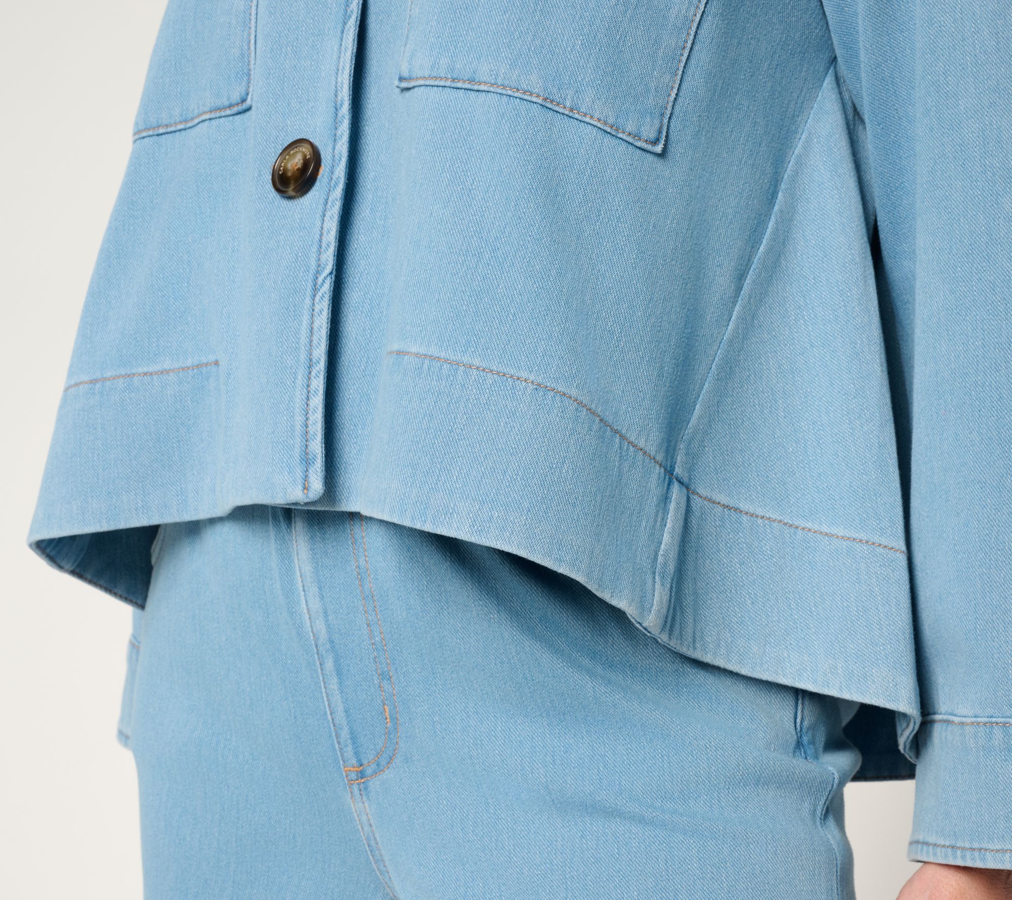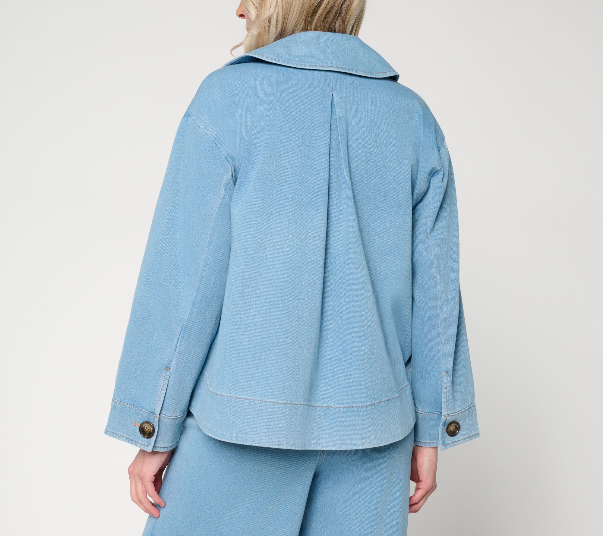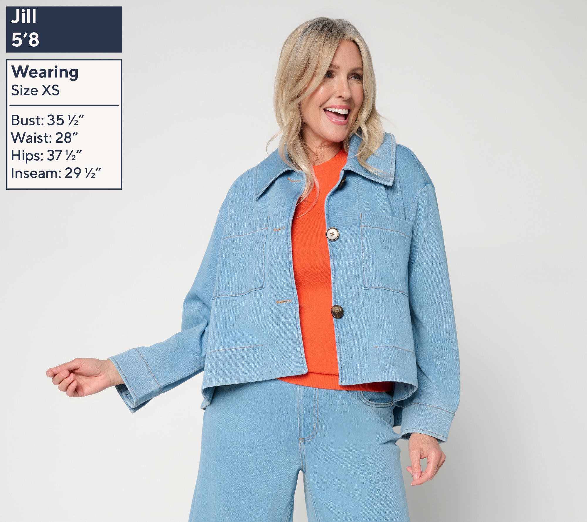 Day or night, this ombre swing jacket adds edge to your favorite jeans or flowy skirts. Soft denim construction (it's a knit), a flattering hi-low hem, and easy drop-shoulders make it comfy and on-point for everyday appointments, social gatherings, and creative workspaces. From Carla Rockmore Collection.