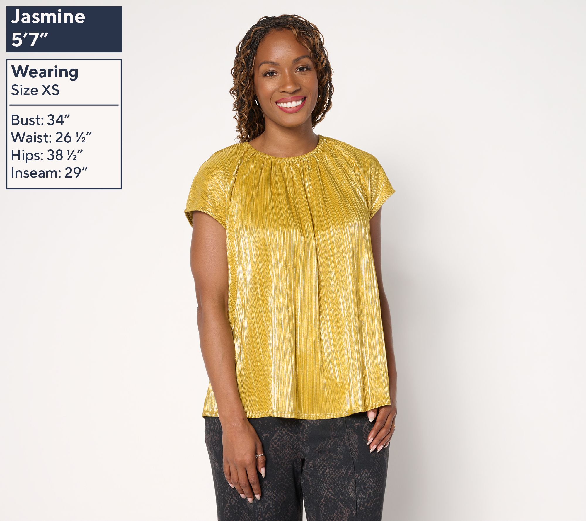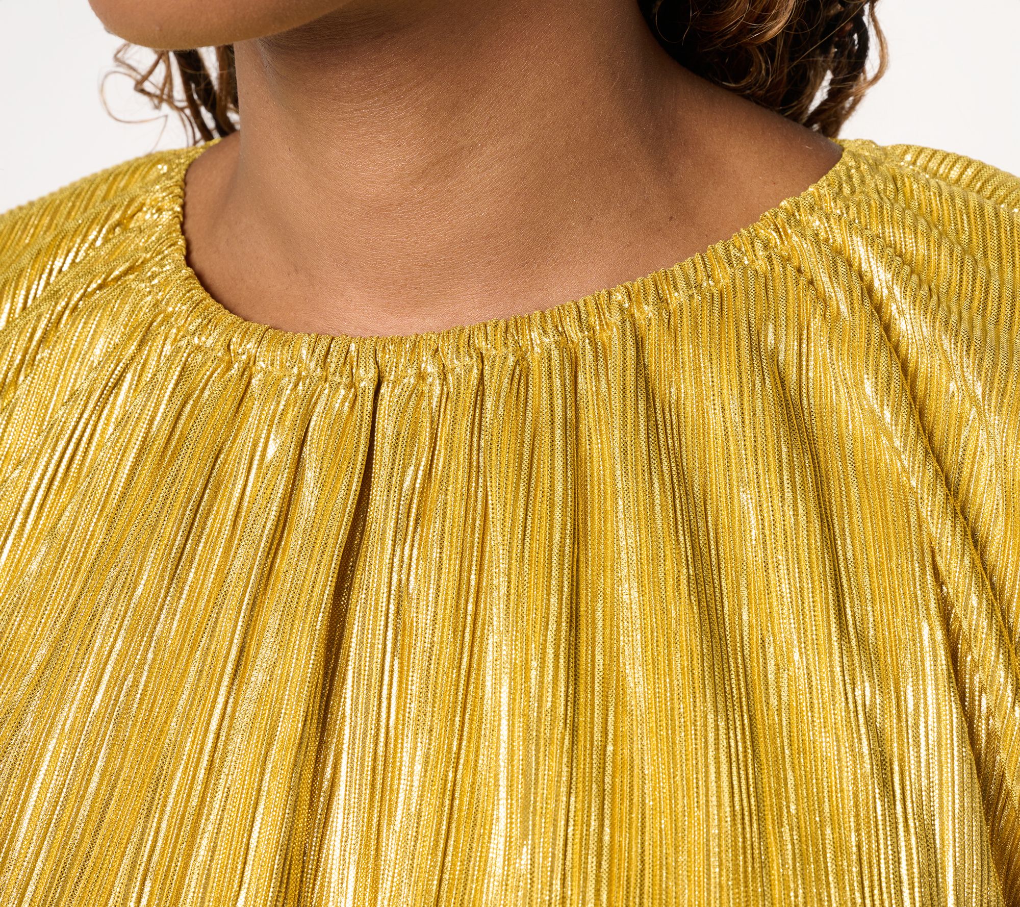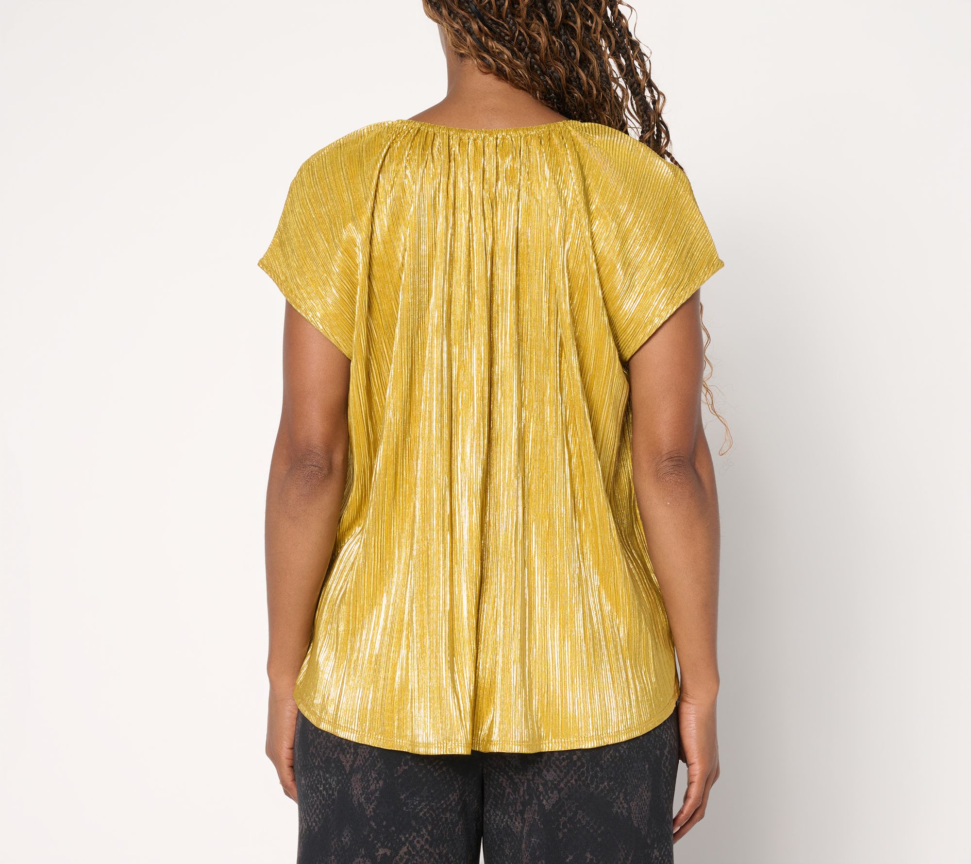 Lit from within -- that's the vibe of this multi-functional metallic foil top. You'll appreciate its sophisticated sparkle, which pairs beautifully with your best jewelry, anytime you're in a crowd or need to make an impression -- while mixing and mingling, hosting, or presenting. From the Carla Rockmore Collection.