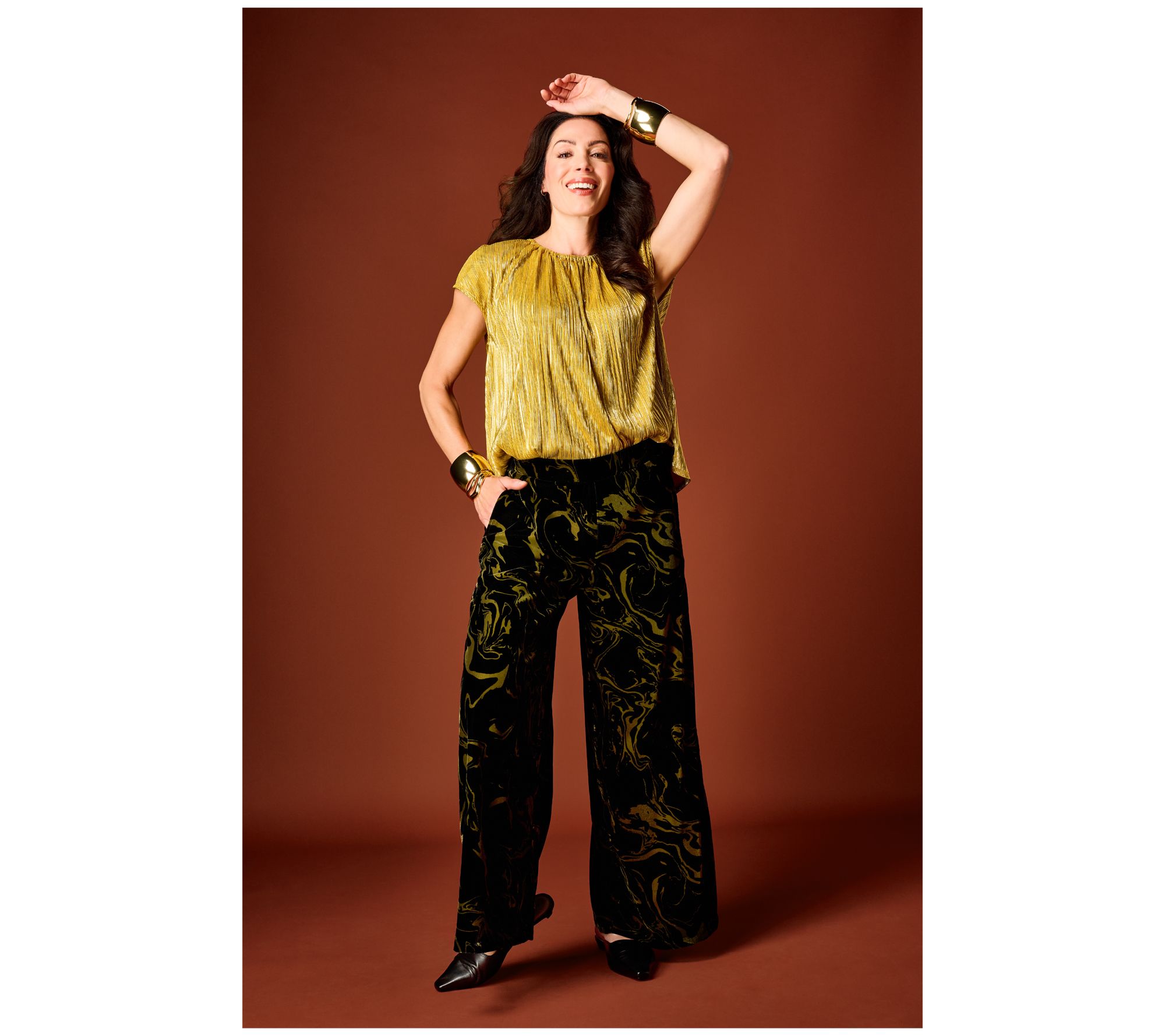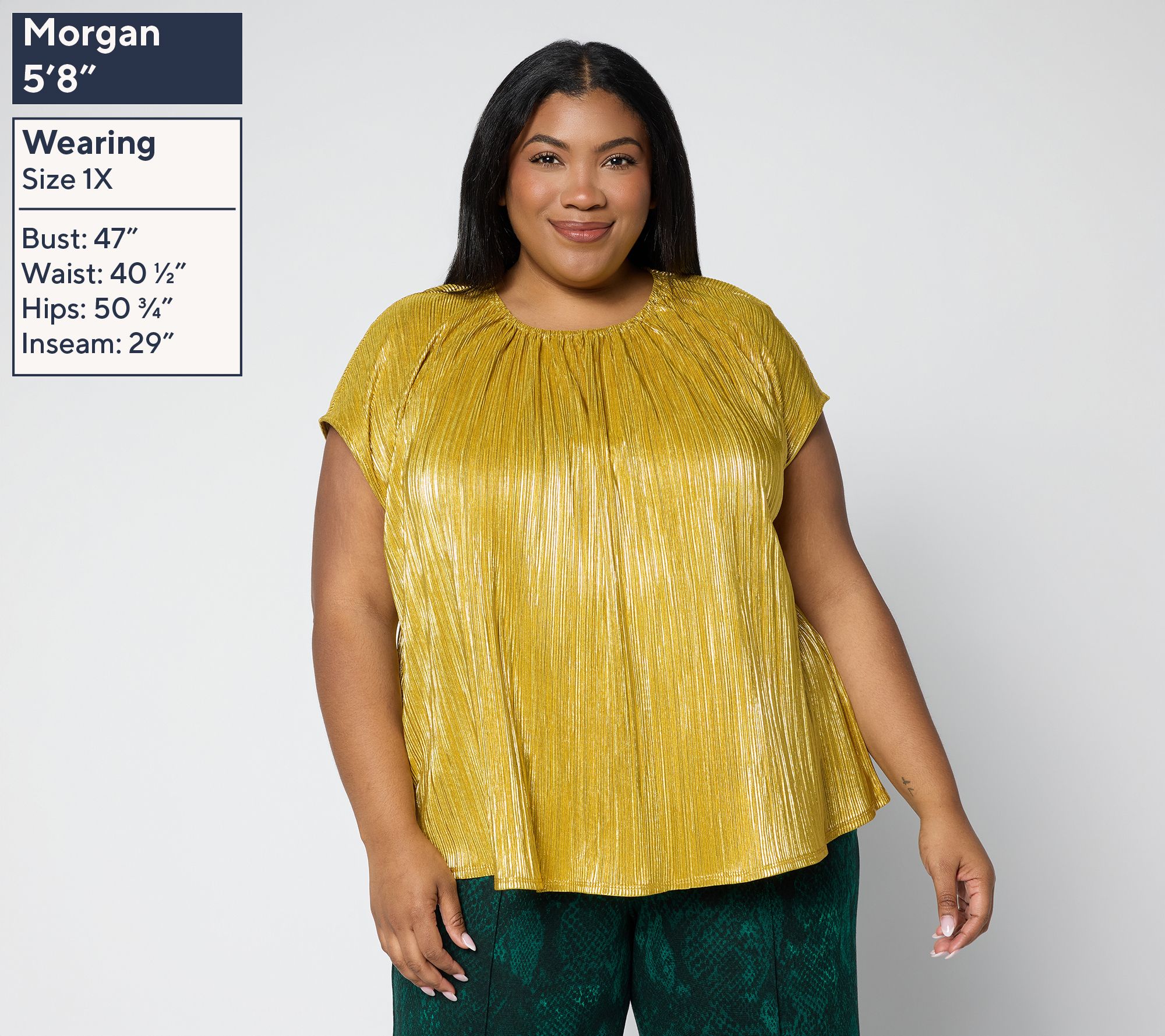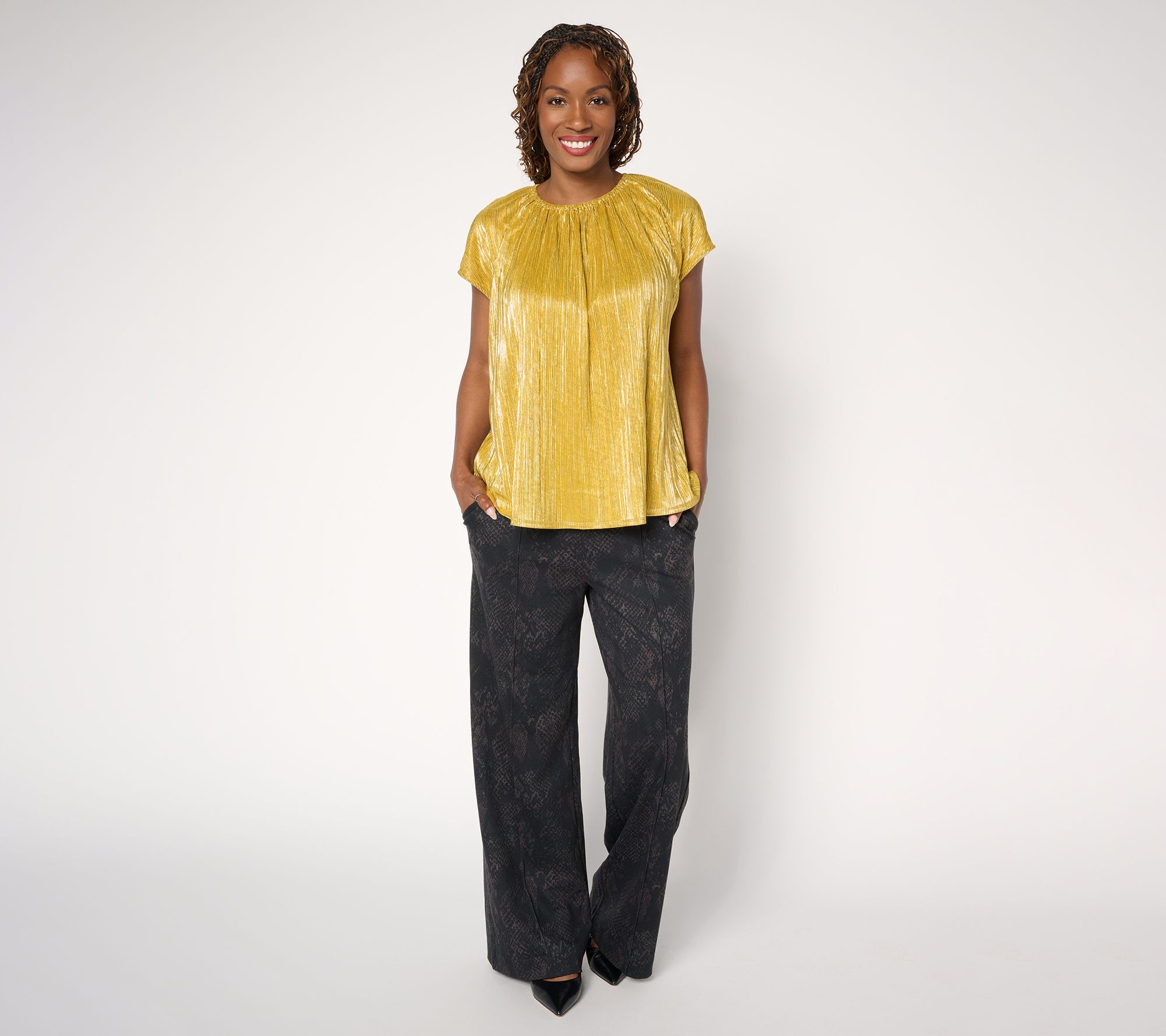 Lit from within -- that's the vibe of this multi-functional metallic foil top. You'll appreciate its sophisticated sparkle, which pairs beautifully with your best jewelry, anytime you're in a crowd or need to make an impression -- while mixing and mingling, hosting, or presenting. From the Carla Rockmore Collection.
