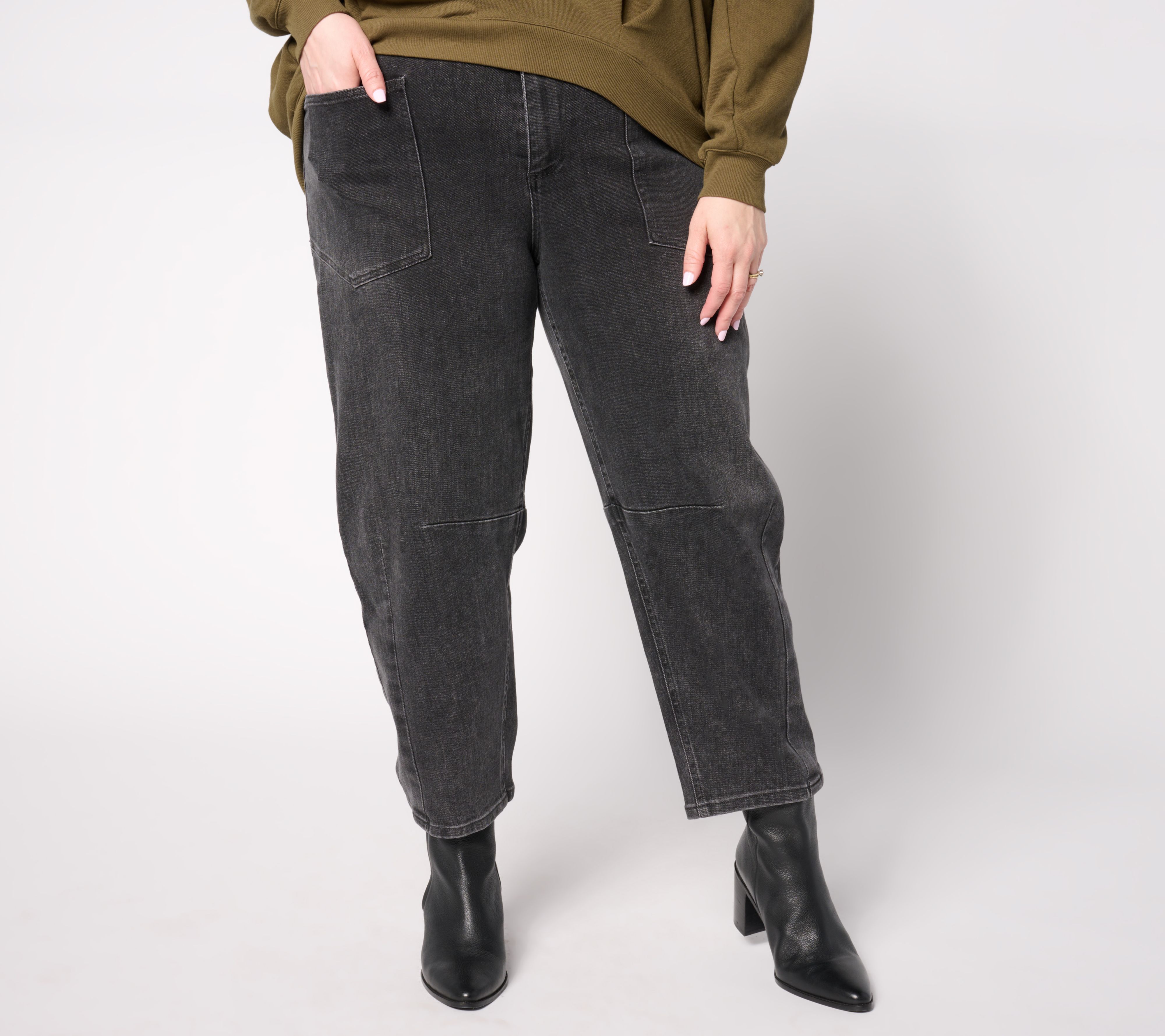 Borrowed from the runway -- but better! Carla Rockmore freshens the barrel-leg look hitting our socials with jeans that jump from the catwalk to the sidewalk! These jeans are trendy, comfortable, and relaxed in a way that fits our lifestyles. Whether you're brunching with friends or exploring the city, enjoy the flattering fit and curvy shape these jeans bring to your look. From the Carla Rockmore Collection