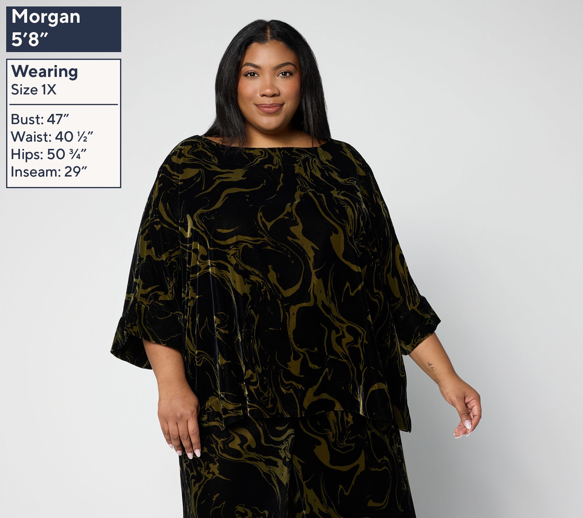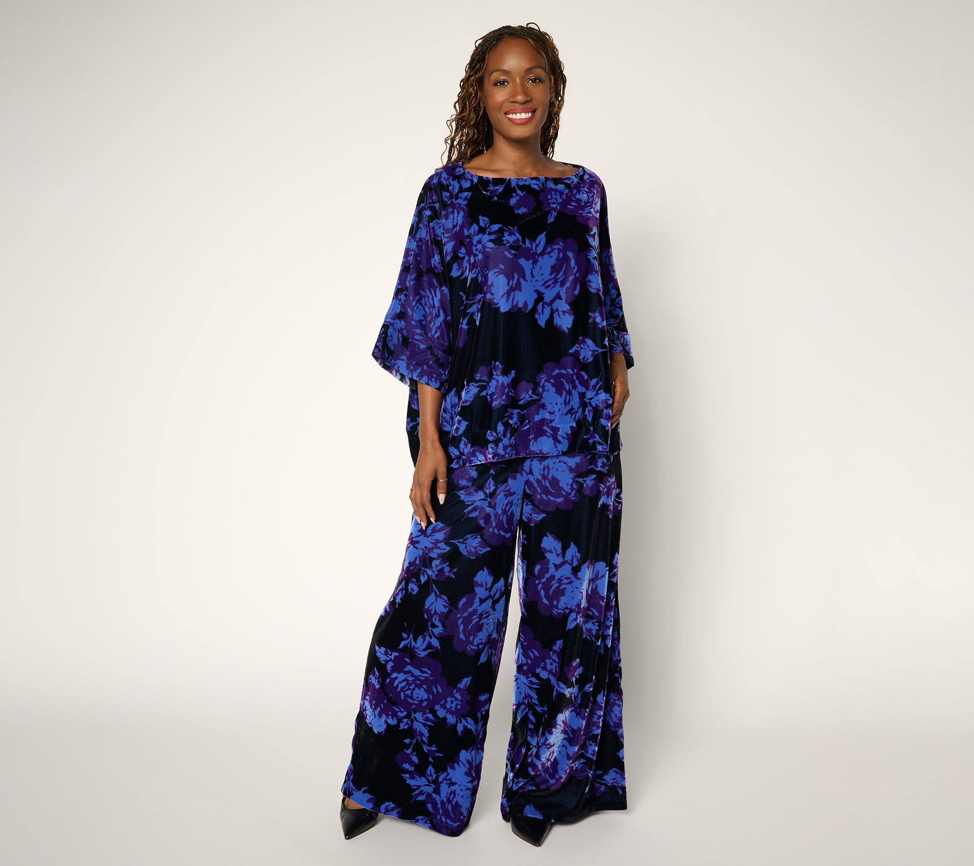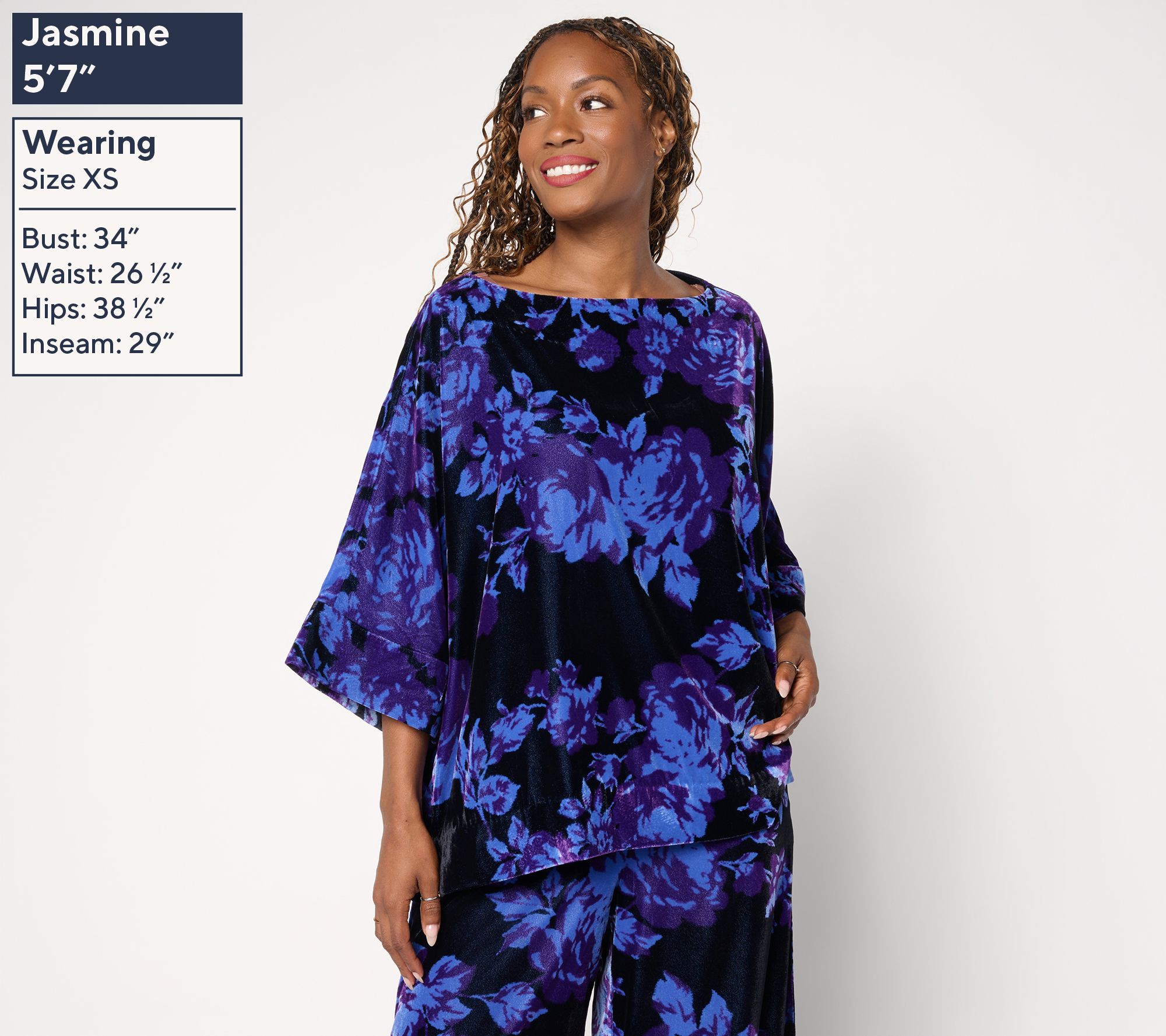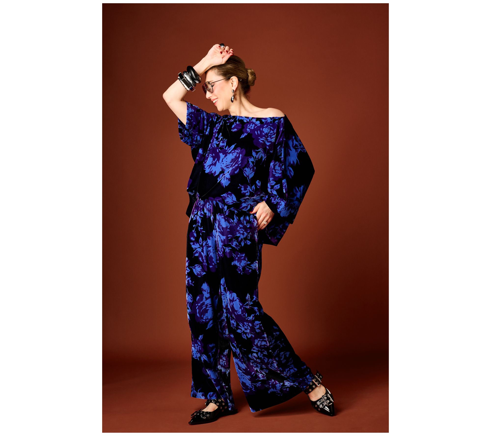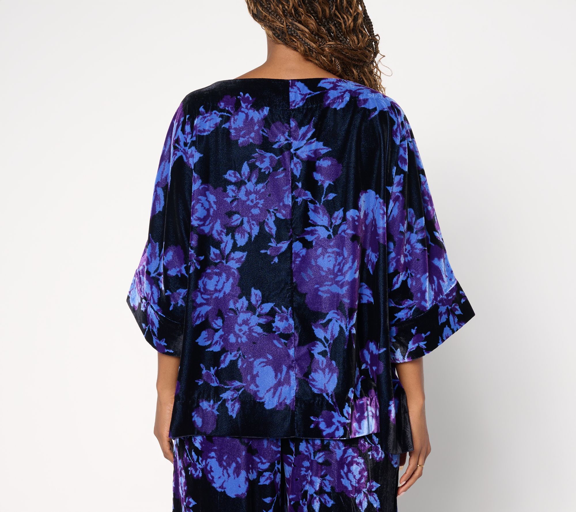 Brace yourself for the compliments. A bold print and plush velvet bring striking elegance to this boatneck top, easily transitioning from stylish office wear to evenings out. Elbow-length dolman sleeves offer a modern vibe, while the relaxed fit provides day-long comfort. From the Carla Rockmore Collection.