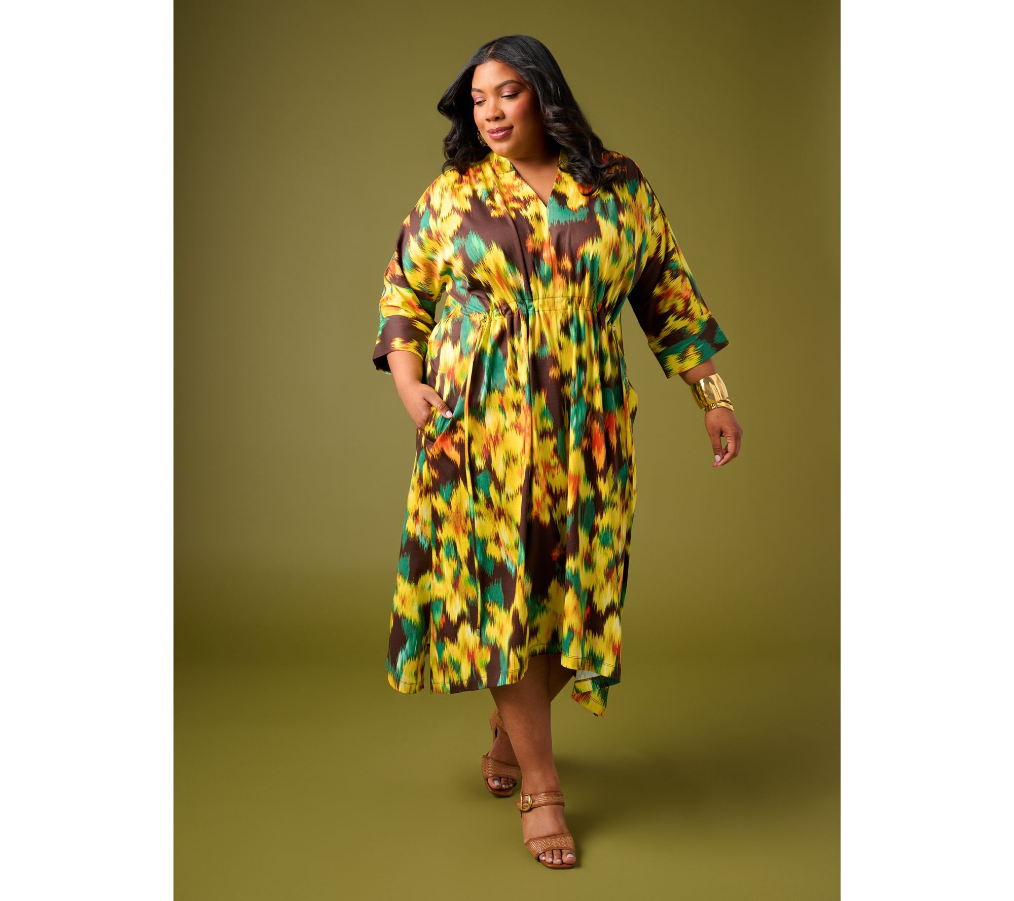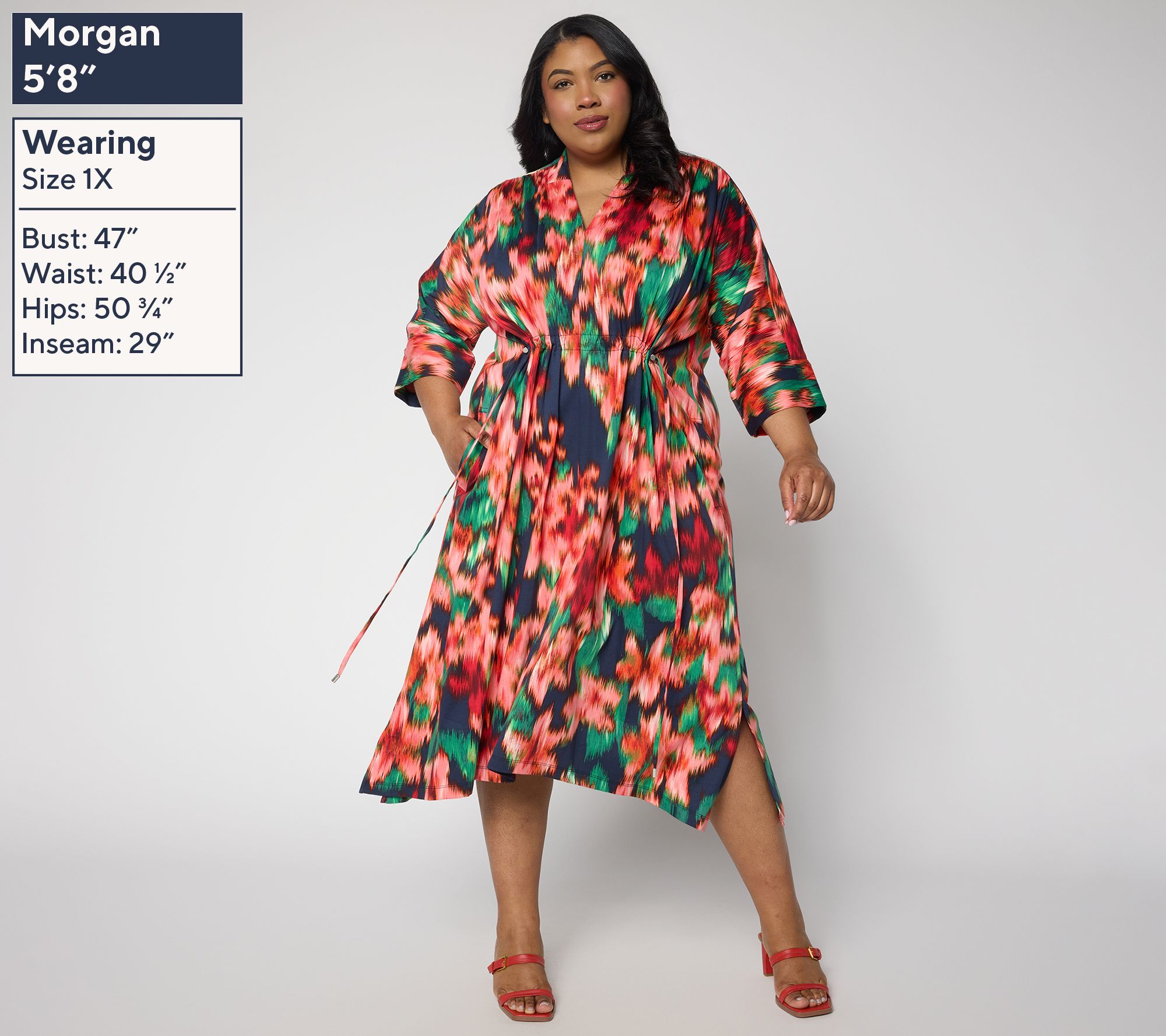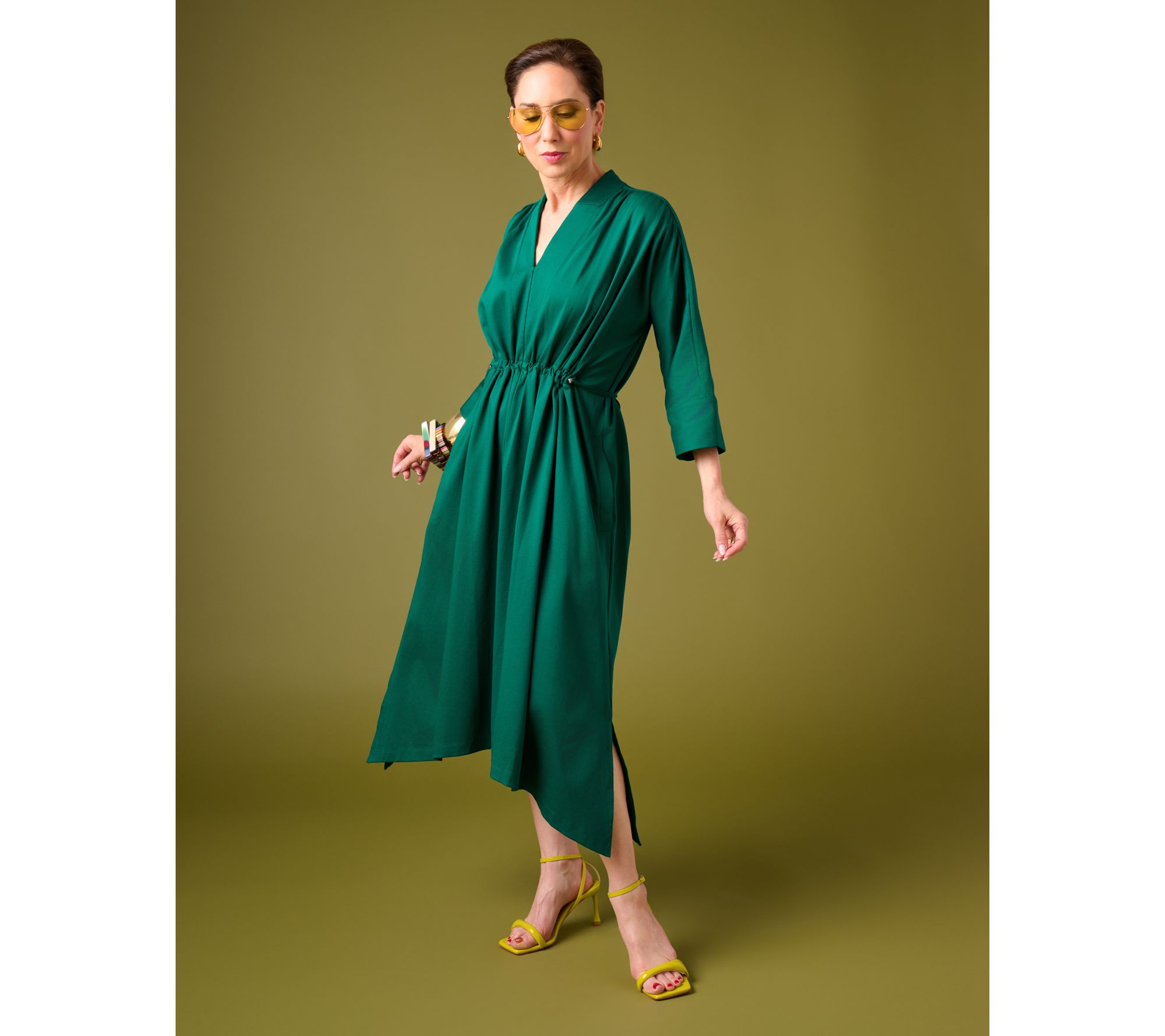 Slip into this jersey midi dress when your schedule spans from busy mornings to social afternoons. Defined by its cinched waistline and soft shirring at the shoulders, this cotton dress effortlessly fuses style and comfort -- side pockets keep essentials close, while the chic sharkbite hem adds interest for coffee runs or get-togethers. From the Carla Rockmore Collection.