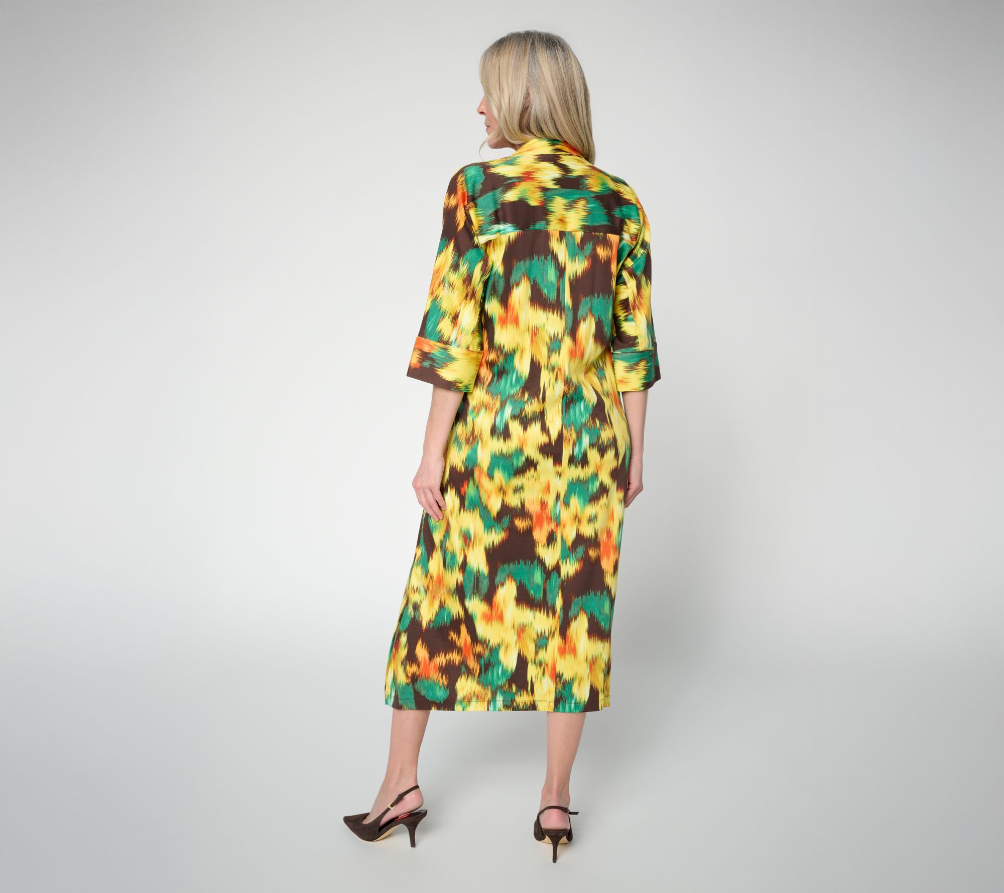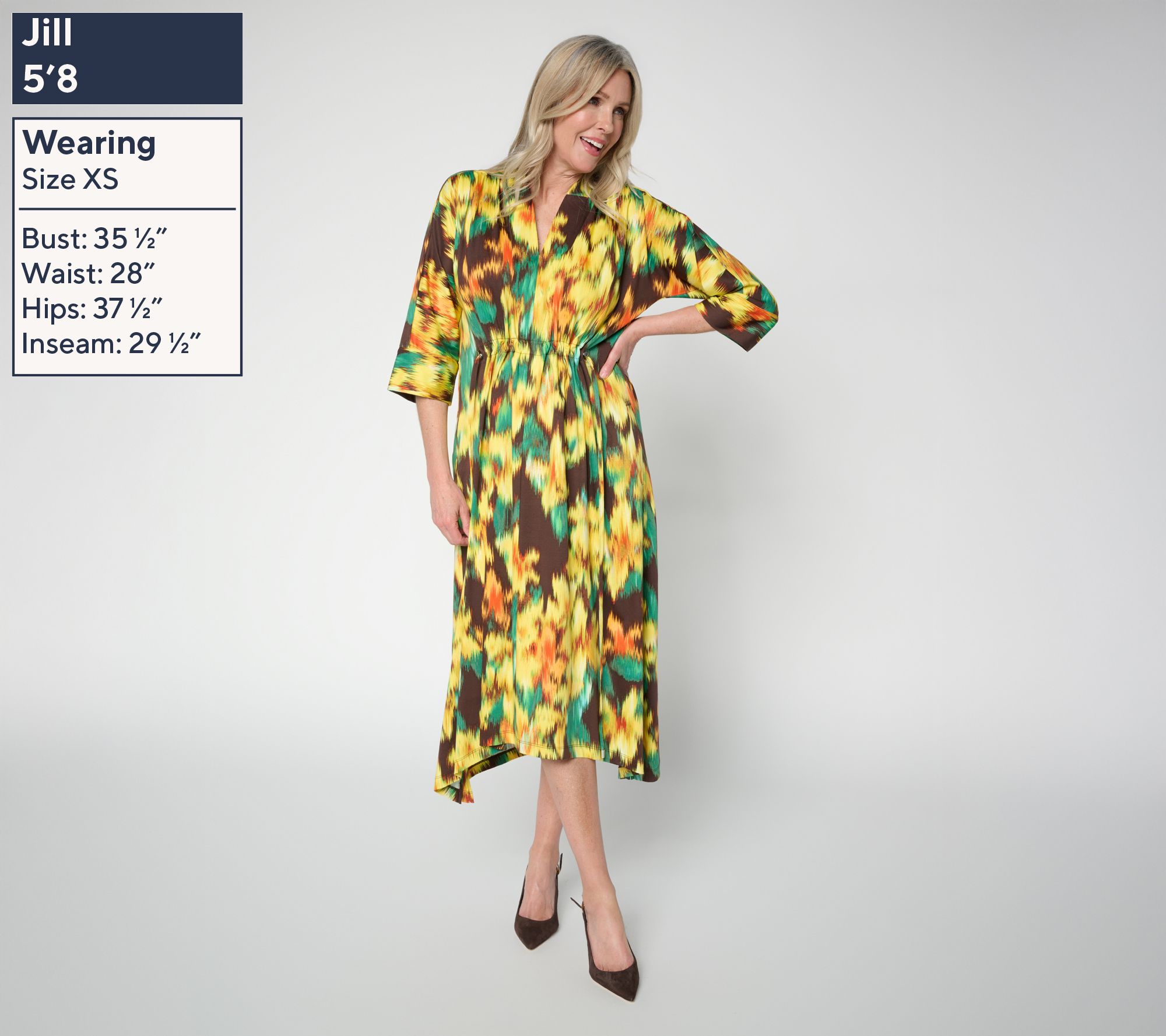 Features: V-neckline, shirred cinched waist and shoulder seams, back yoke, sleeve cuffs, on-seam side pockets, side slits, sharkbite hem
