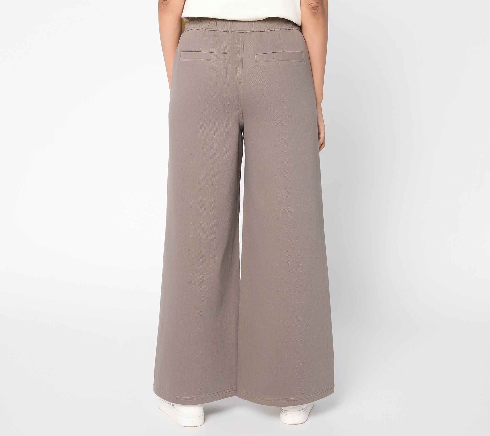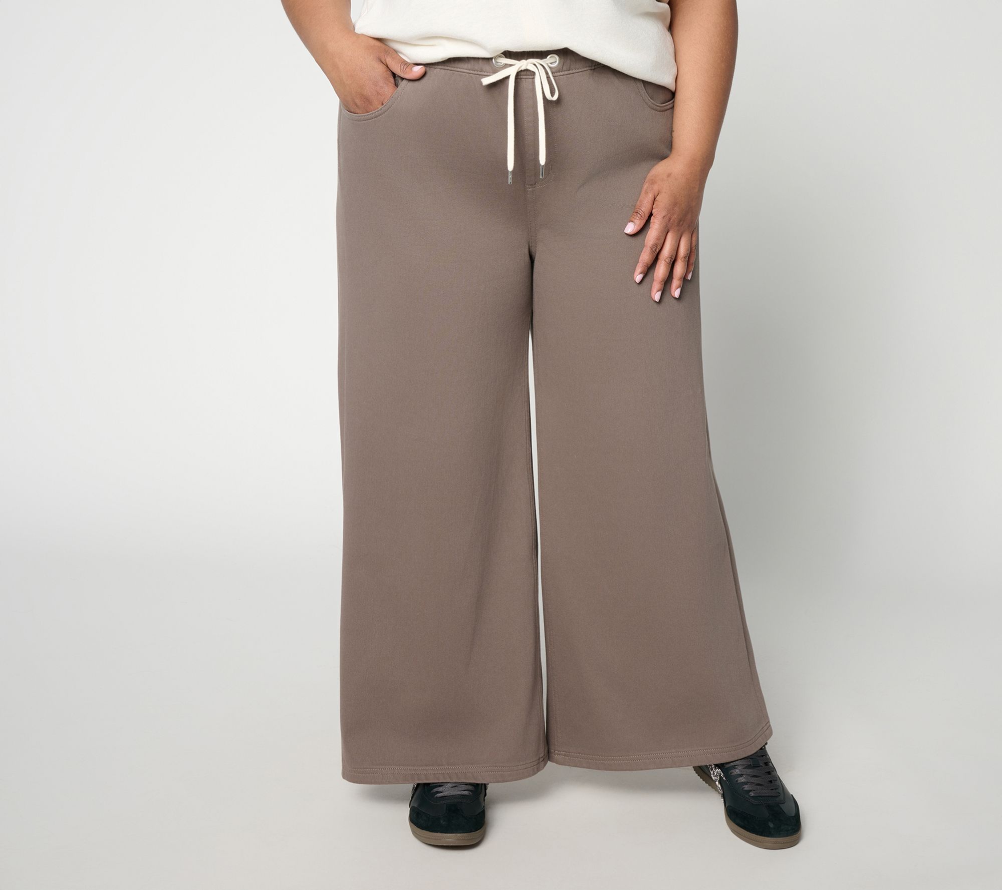 If gallery strolls or girls' getaways are on the agenda, how happy you'll be when you've got Carla Rockmore's pull-on jeans waiting in the wings. Soft stretch fabric, a polished wide-leg cut, and the subtle edge of grommet details make these pants a comfortable choice for relaxed weekends or on-the-go afternoons. (And only you'll know they're actually a comfy knit). From the Carla Rockmore Collection.