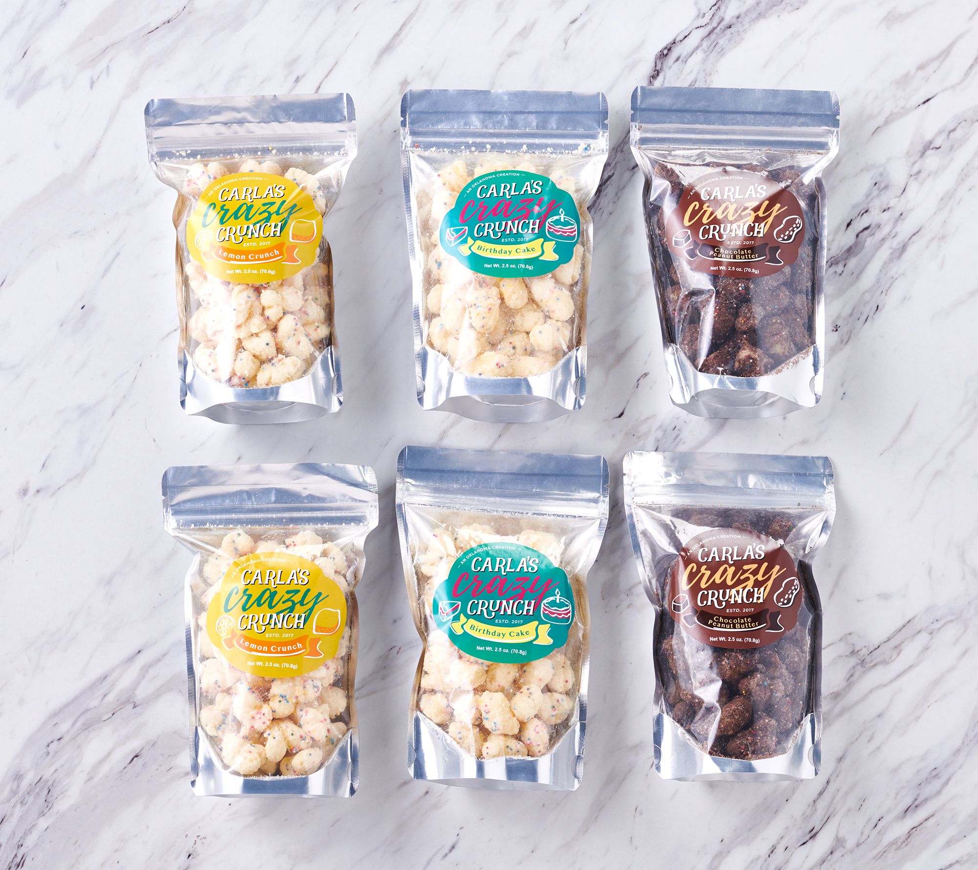• Includes six 2.5-oz sealable bags of puffed corn snacks: two each of chocolate peanut butter, birthday cake, and lemon