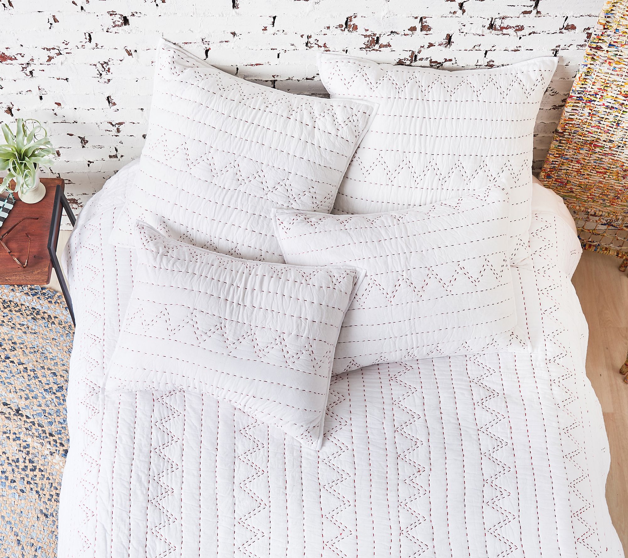 • Red and white geometric stitched pattern