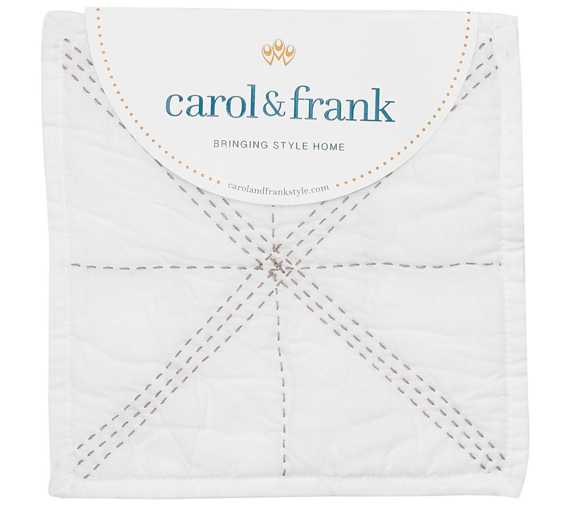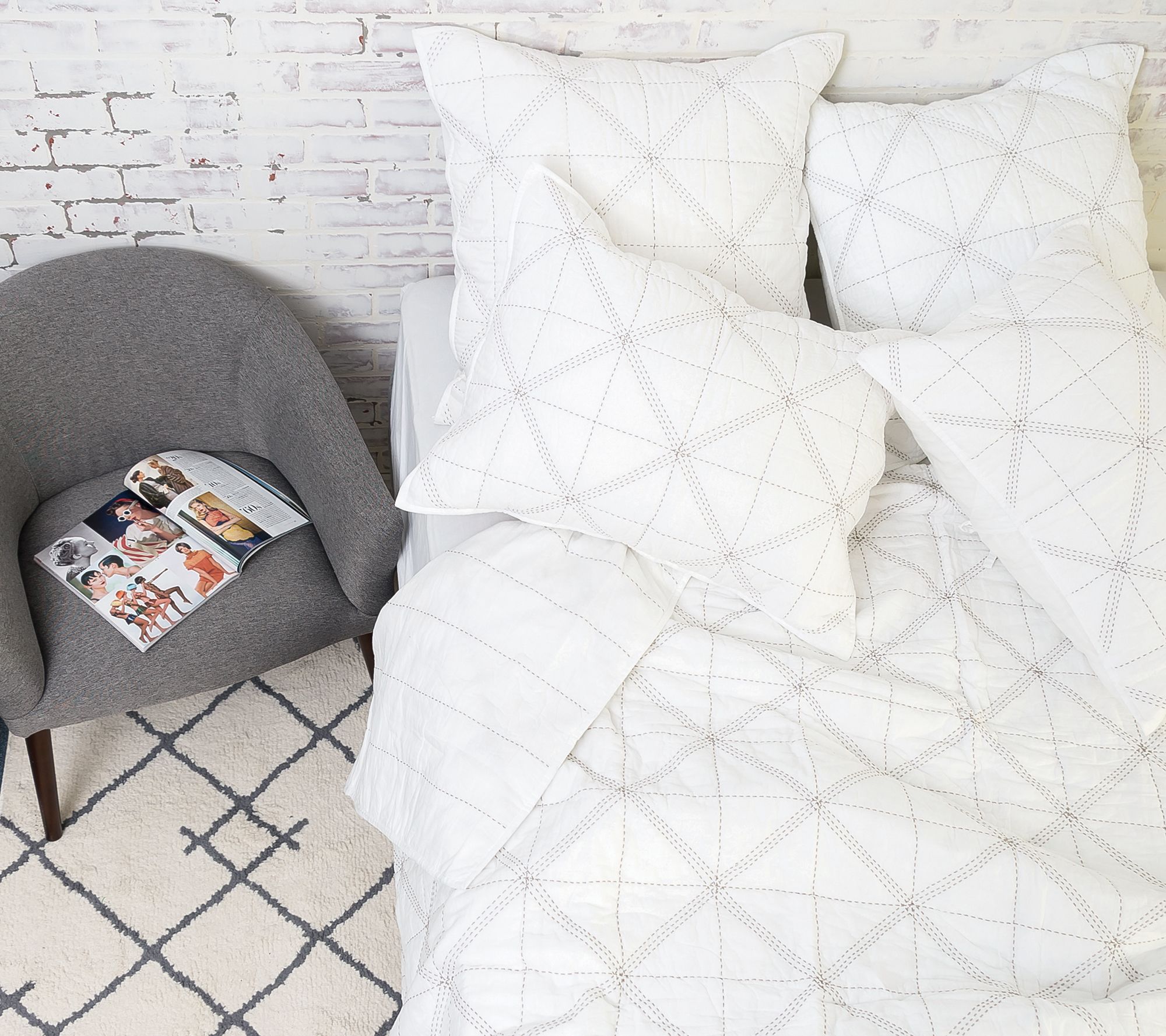 Preppy, polished, and perfect for layering, the Harper quilt is crafted of white cotton voile with a neutral geometric stitched pattern. From Carol & Frank.