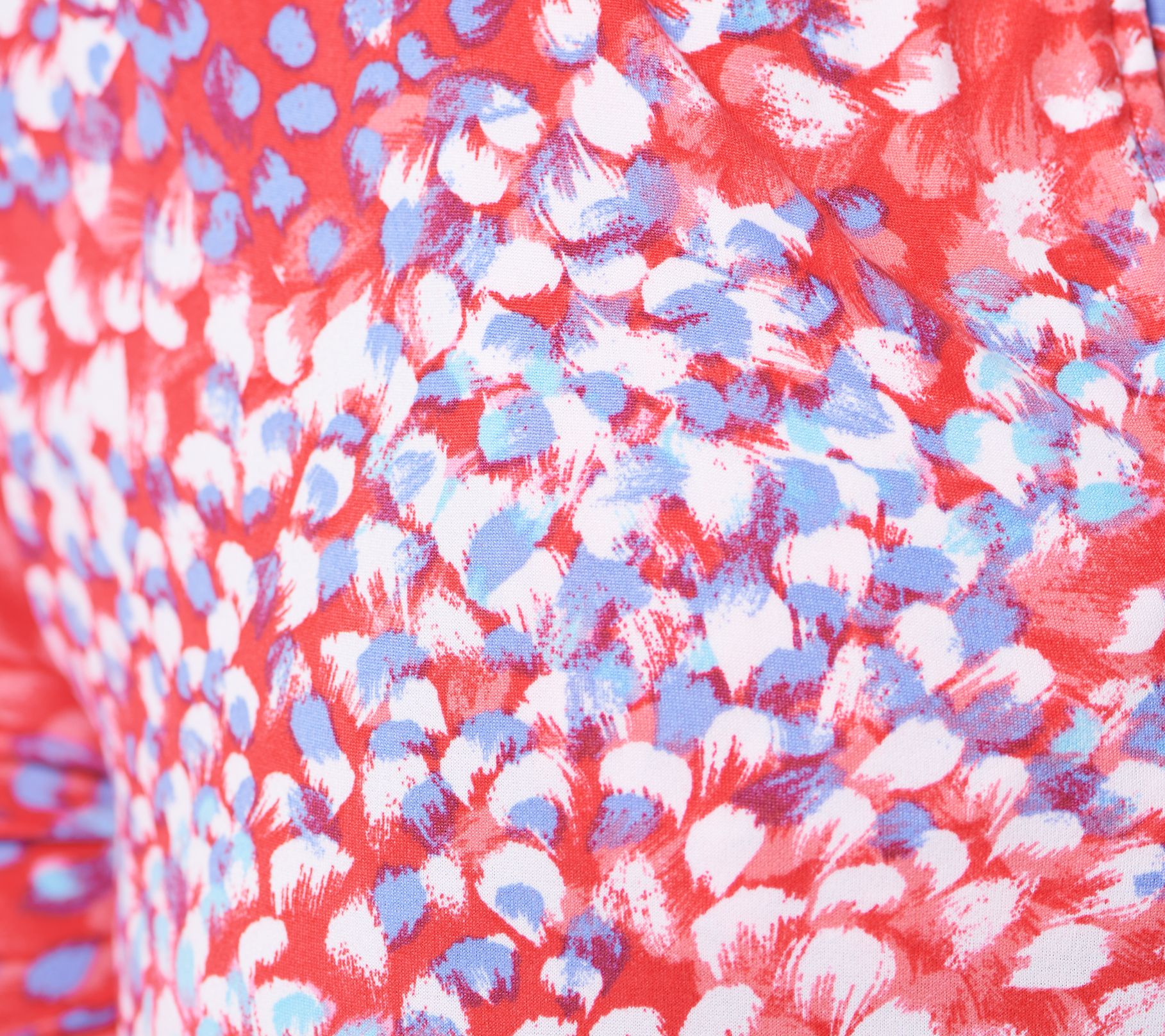 Top Features: coordinated print neckband with pants, solid color body, flutter sleeves, shirttail hemline