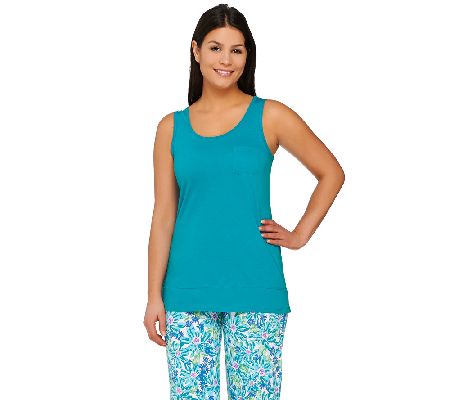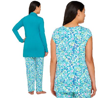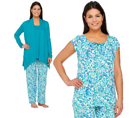 Mix and match the layers depending on how toasty you want to get. The solid tank balances the printed pant and is great for layering under the printed cap-sleeved top and solid cardigan. The spring bloom print adds a fun, feminine touch to loungewear that you can feel confident in around the house or on vacation. From Carole Hochman.