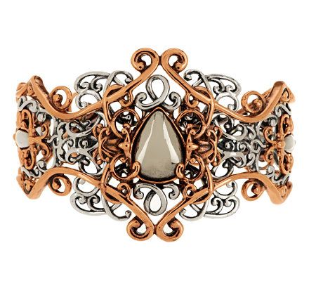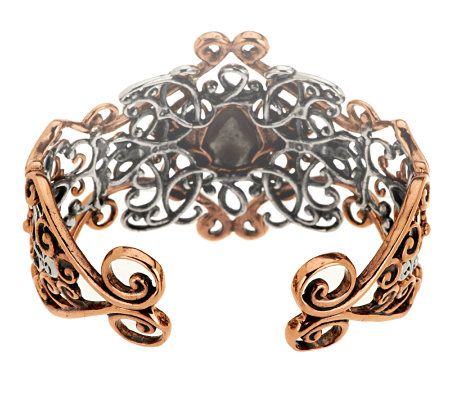 A bold, pear-shaped brass design radiates at the center of this openwork filigree cuff, which is done in brass and sterling silver for a sensational two-tone look. As the cuff tapers toward the back, it's punctuated with two oval-shaped sterling stations on either side. From Carolyn Pollack Sterling Jewelry.