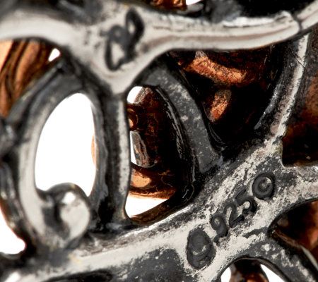 Brass pear shape at center surrounded by intricate openwork brass and sterling silver tapering to back; two oval sterling silver stations on either side nested in brass border; oxidized finish; highly polished
