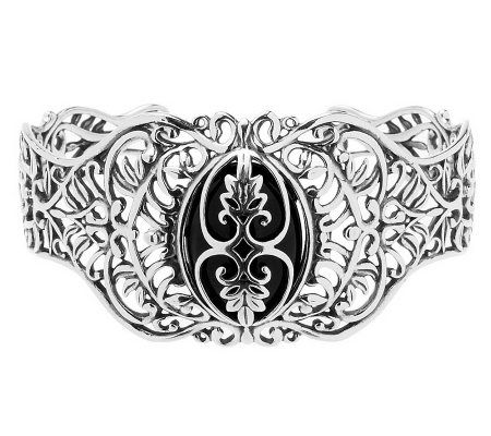 Ornate openwork design; interchangeable oval cabochon at center of cuff; push sterling silver bead to release cabochon; highly polished; oxidized finish