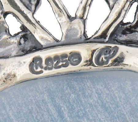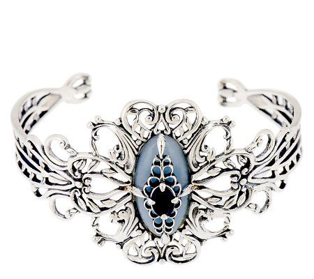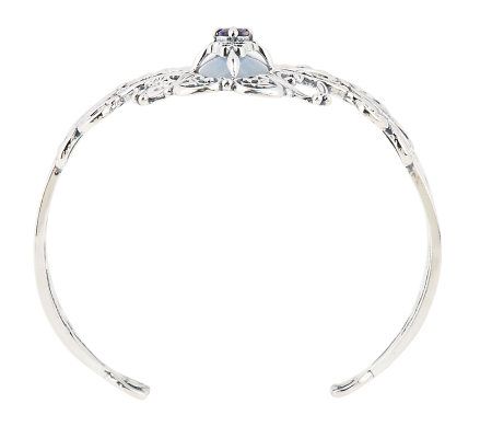 Desert dazzle. This gemstones of this sterling silver cuff evoke the colors of a magical Southwestern nighttime sky. An elongated oval, blue-gray anhydrite cabochon is surrounded by a simply stunning openwork design. A faceted, oval iolite is prong set at the center of a filigree overlay for a bold burst of dark color. From Carolyn Pollack Sterling Jewelry.