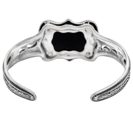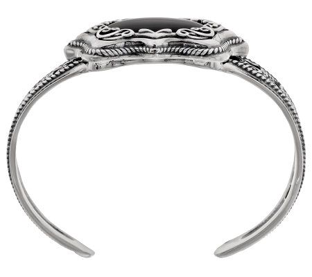 When you want to wrangle up a fabulous look, this sterling silver rodeo cuff is the perfect choice. Set within a quatrefoil shape that boasts a rope border and dimensional swirls is a gleaming oval onyx cabochon. It's an ideal look for every day. From Carolyn Pollack Sterling Jewelry.