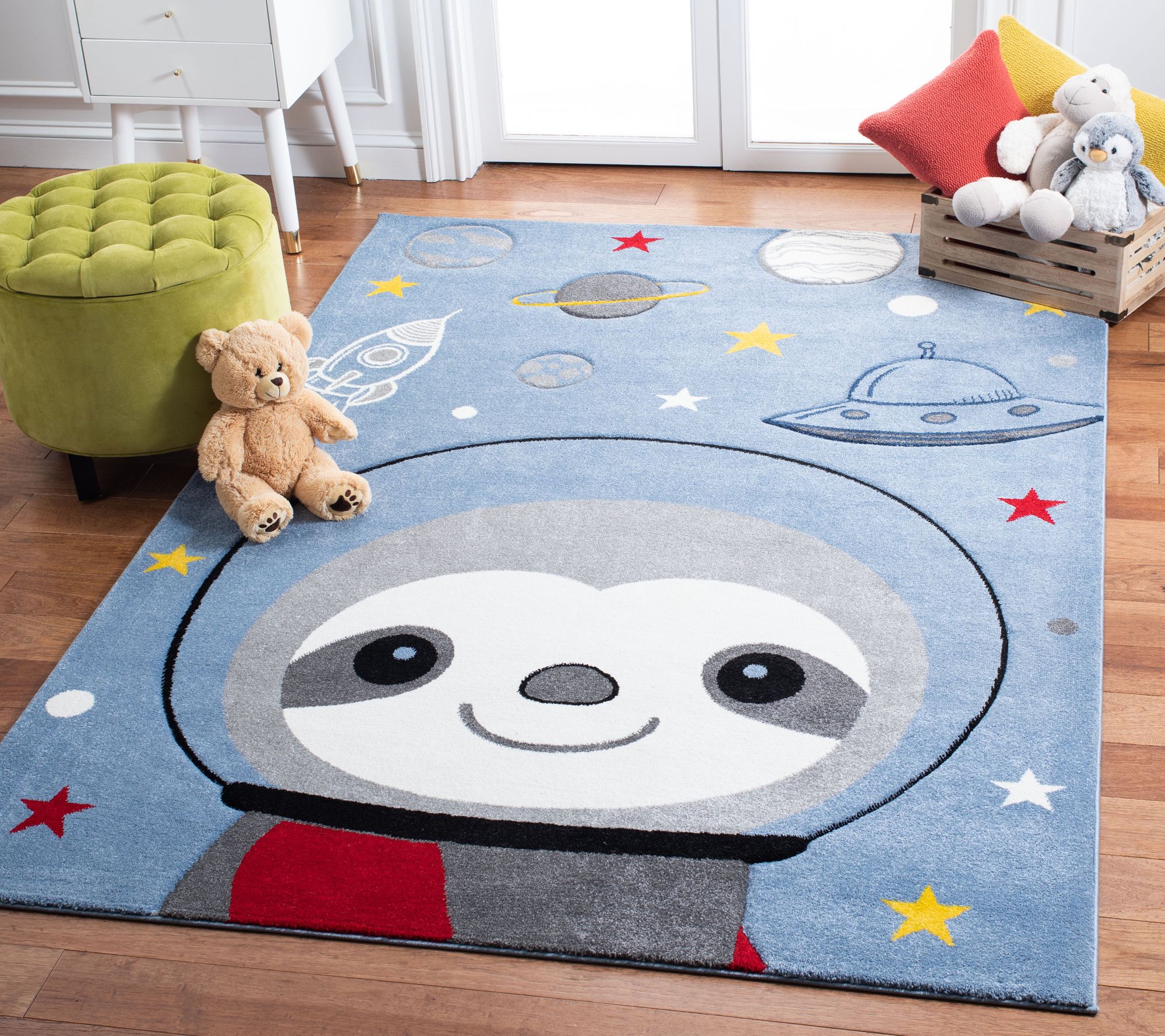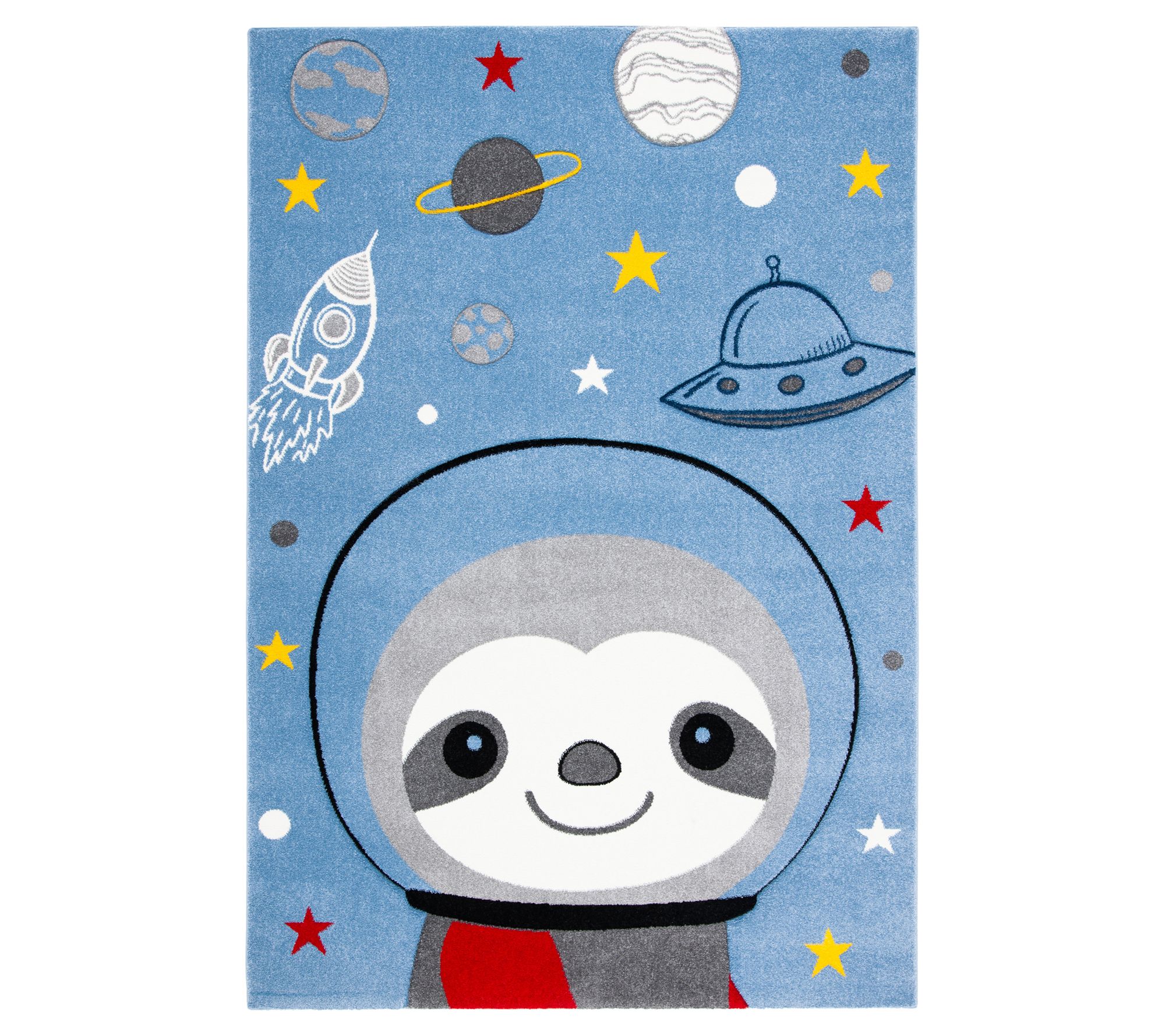 Fanciful and fun, this Carousel Kids storybook rug features a playfully etched astronaut and space scene in pleasing blue and gray hues with ivory, red, and yellow accents. Crafted from soft yet durable synthetic yarns, this adorable, power-loomed rug makes a treasured addition to your child's room. From Carousel Kids.