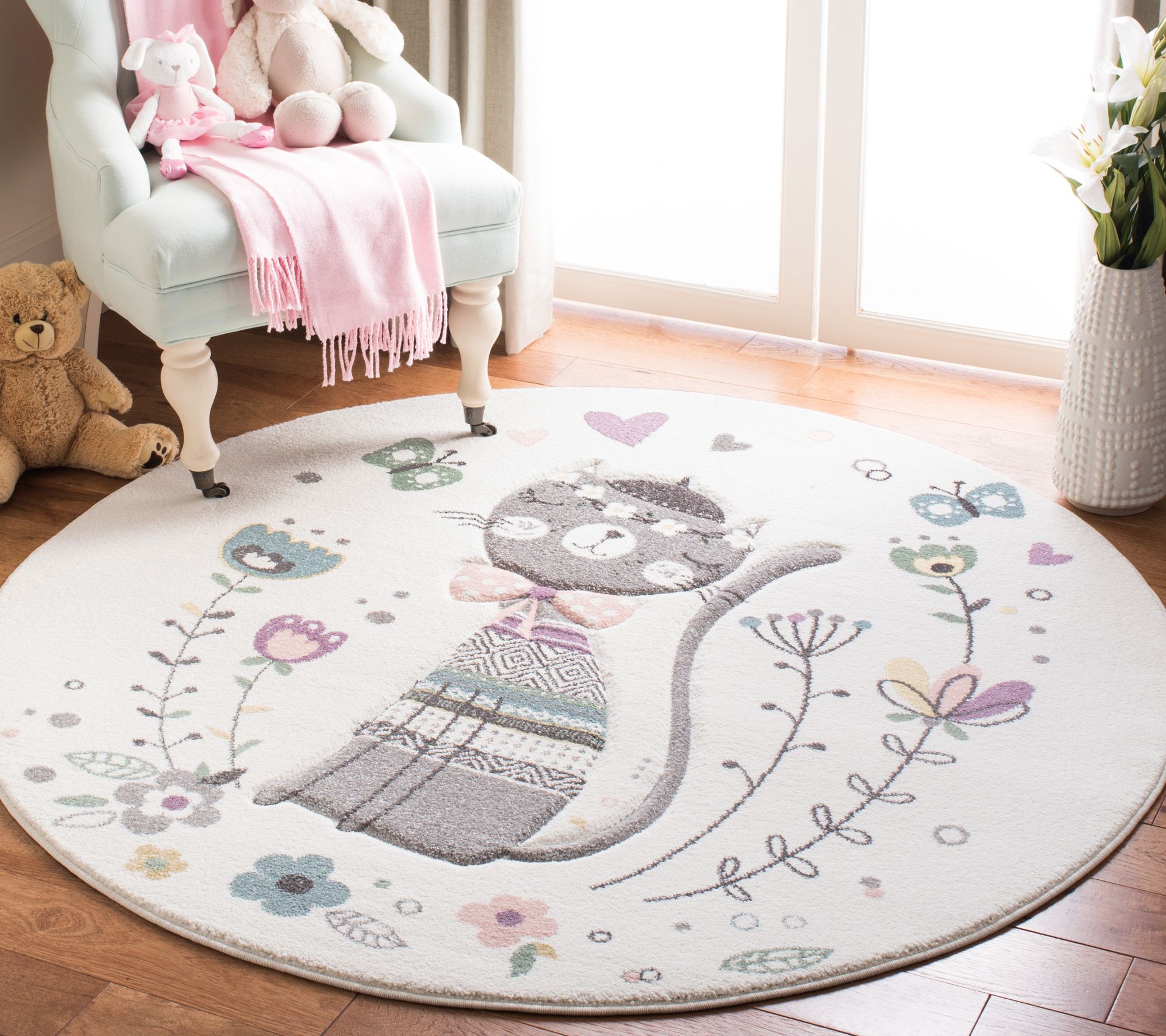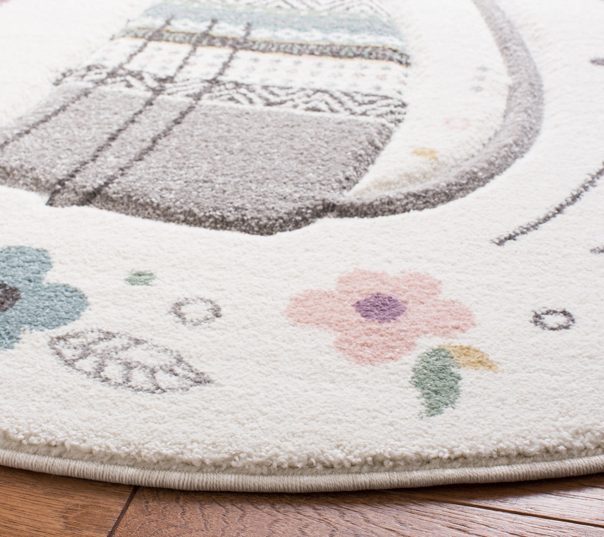 Playful patterns, charming colors, and etched designs turn the childhood motifs of this power-loomed rug into a flooring focal point, while also providing a soft landing for busy little feet. From Carousel Kids.
