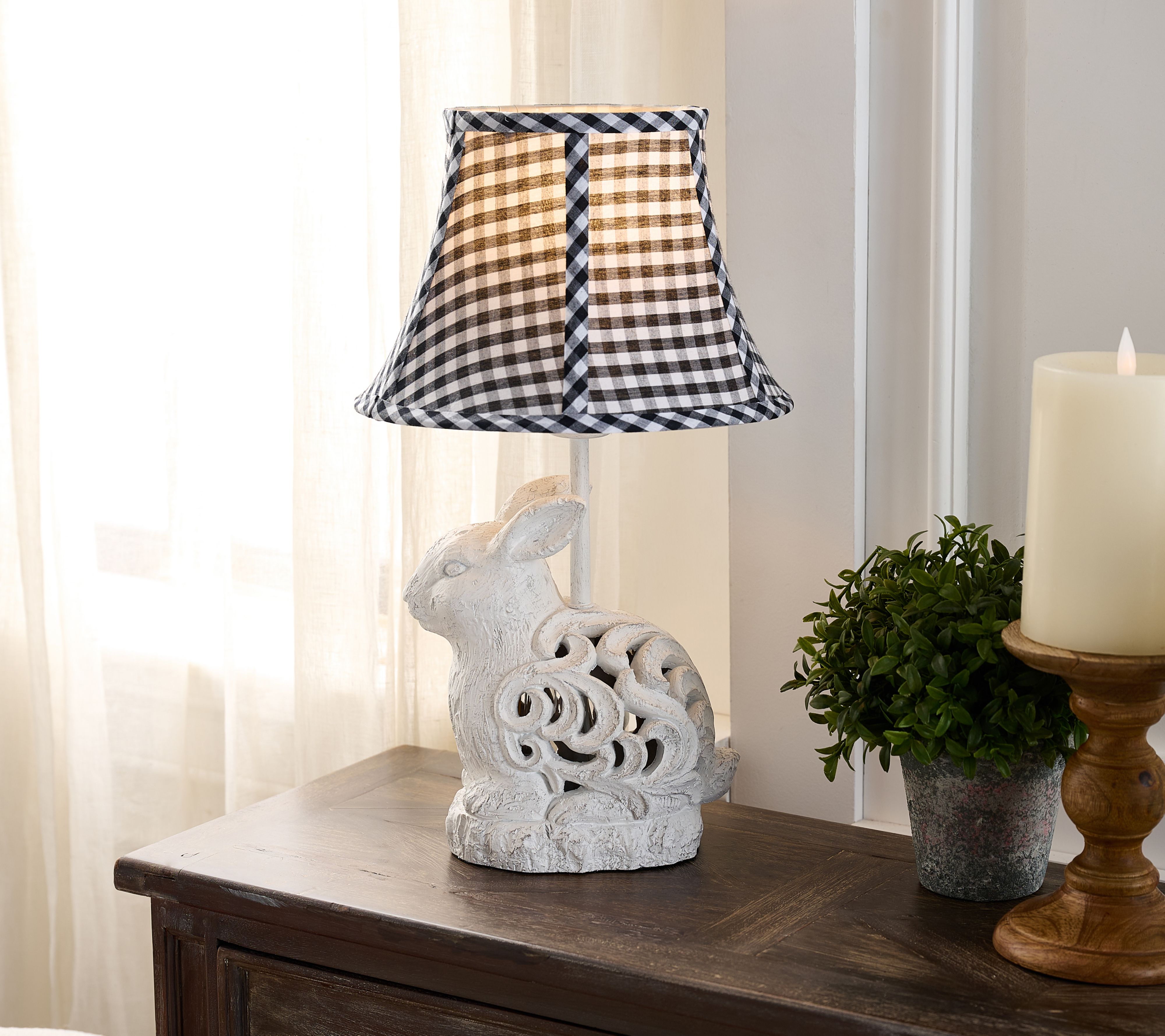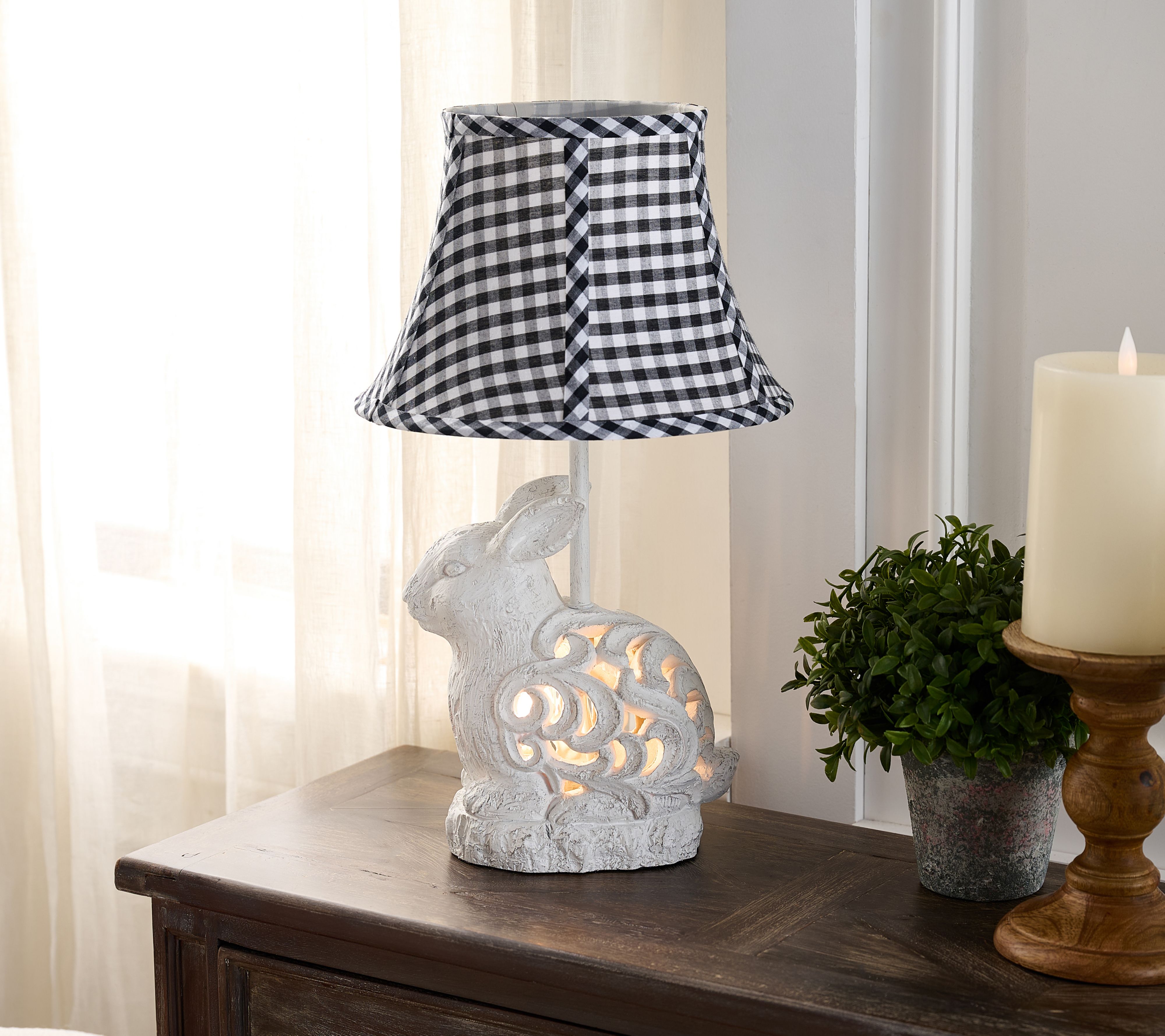 Create a cozy reading nook or brighten up any dark corner with this charming carved bunny lamp. Topped with a fabric checked shade, the delightful design not only illuminates from the top but also features a softly glowing base to produce a warm and inviting ambiance. From The Valerie Parr Hill Collection.