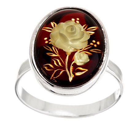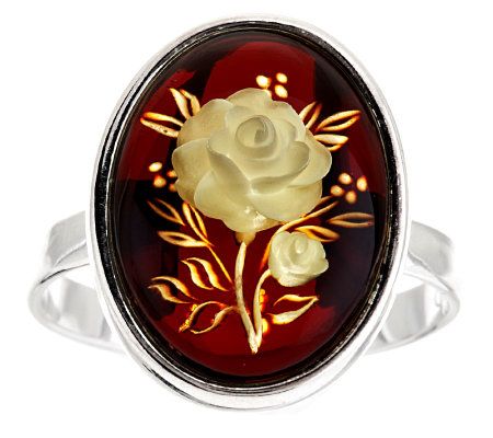 • Oval, Baltic amber cabochon in a bezel style setting; carved flower in the center of the cabochon; highly polished shank