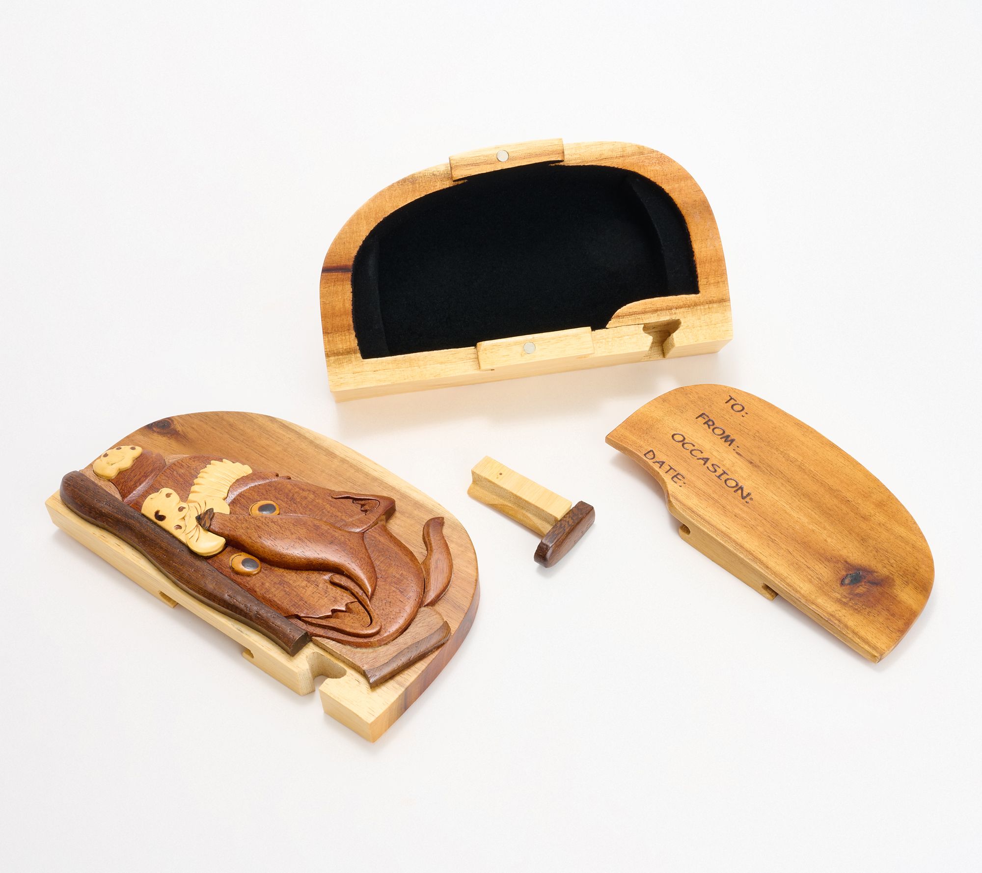 A clever way to give someone a gift card, money, or small item (no need to wrap!), this puzzle box can be reused by the recipient to tuck away trinkets, tiny treasures, jewelry, and whatever keepsakes they want to keep safe. The intricate design is beautifully crafted from hardwoods and features a hidden storage area with a magnetic closure. From Carver Dan.