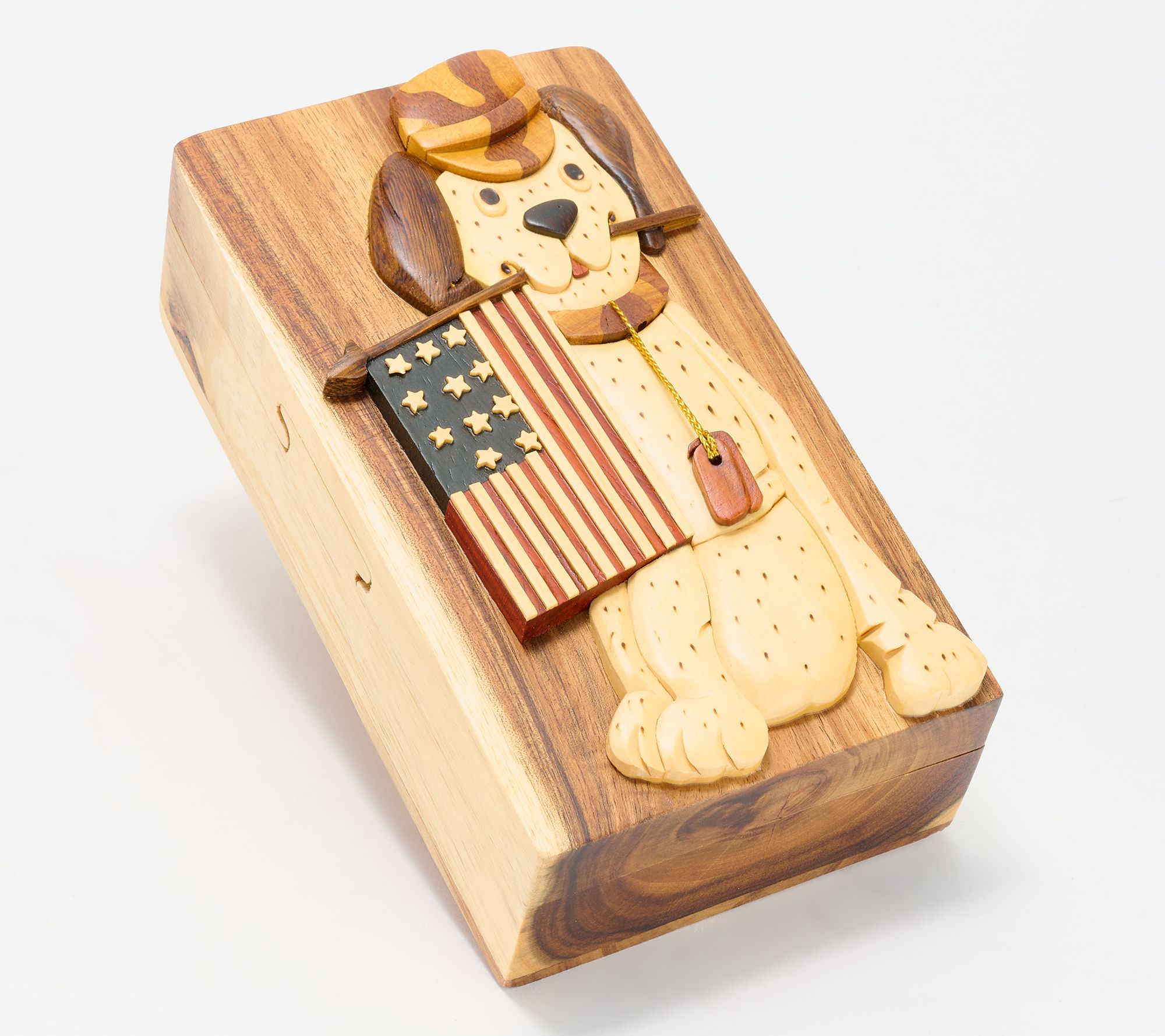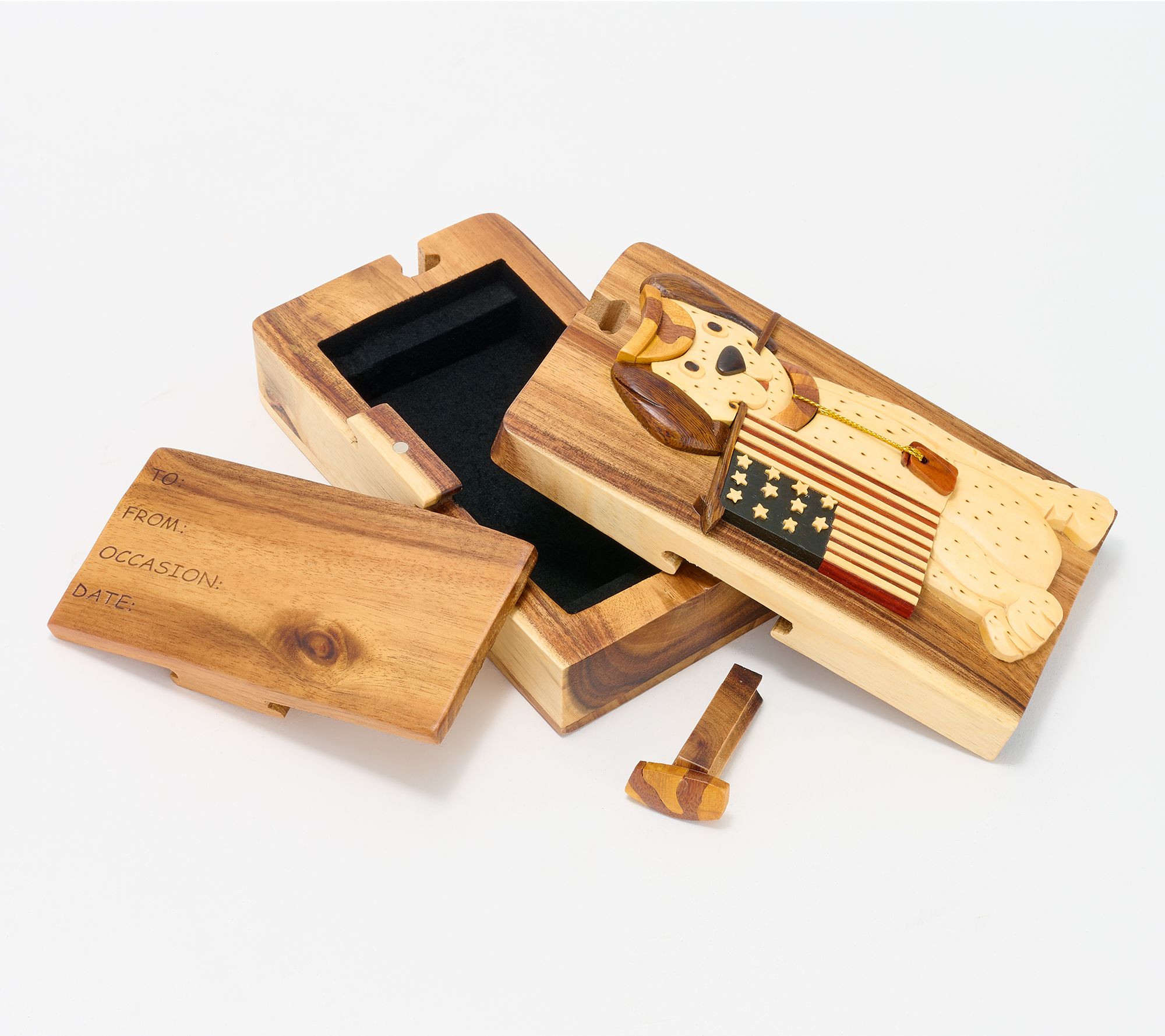 Make them work for it! This handcrafted hardwood puzzle box includes a secret compartment nestled inside to hide cleverly tucked away trinkets, money, jewelry, and so many other gifts or personal keepsakes. The dog tag design makes a thoughtful gift for those who've served or their family members. From Carver Dan's.