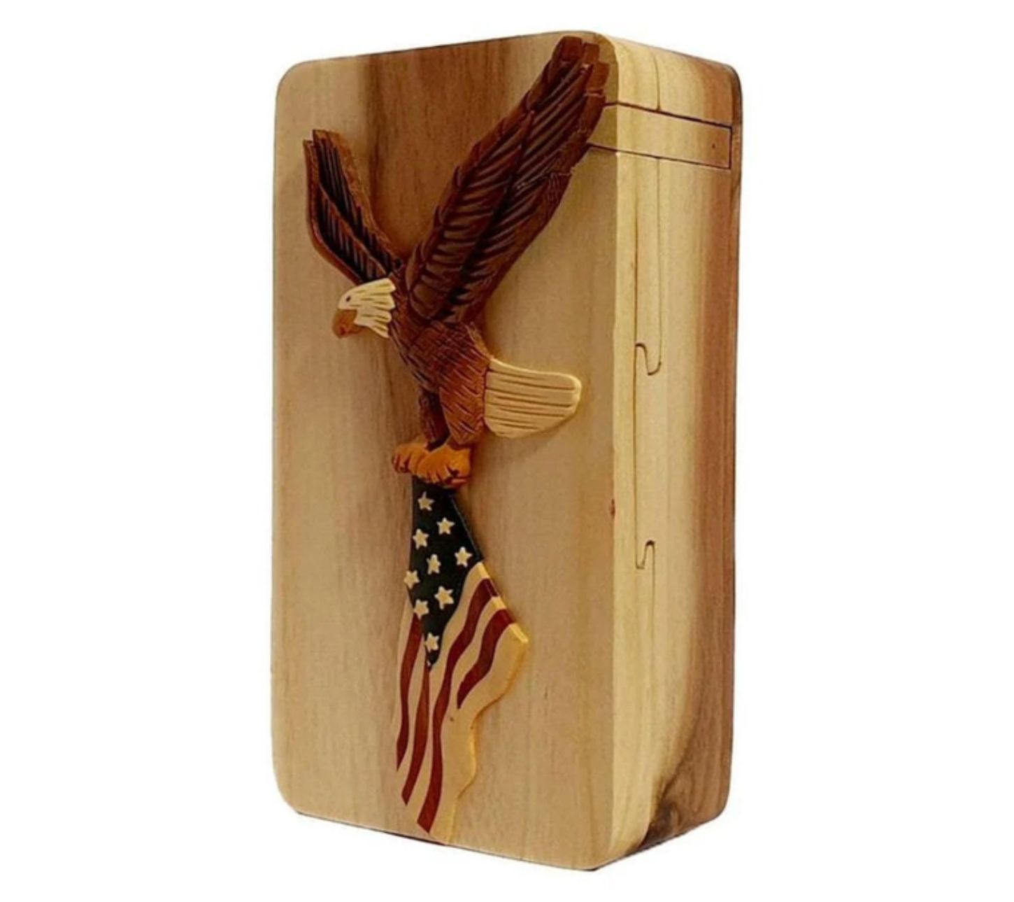 A patriotic puzzle and secret hide-away all in one! This puzzle box is a clever way to give someone a gift card, money, or small item (no need to wrap!), and can be reused by the recipient to store cherished items. Inside, there's a place to customize a message under the lid if you wish your present to be more personalized. The beautifully carved eagle-and-flag design is carefully crafted from hardwoods and features a hidden storage area with a magnetic closure. From From Carver Dan's.