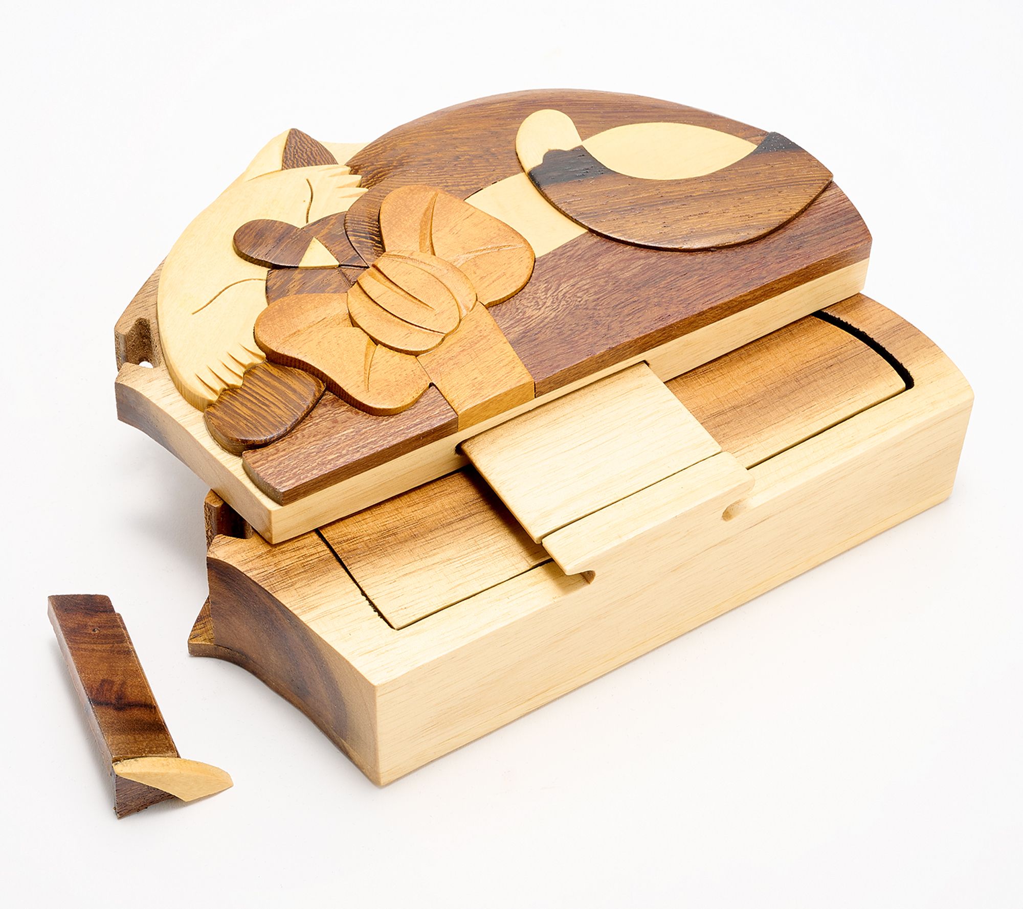 Carver Dan's Handcrafted Cat with Bow Puzzle Box