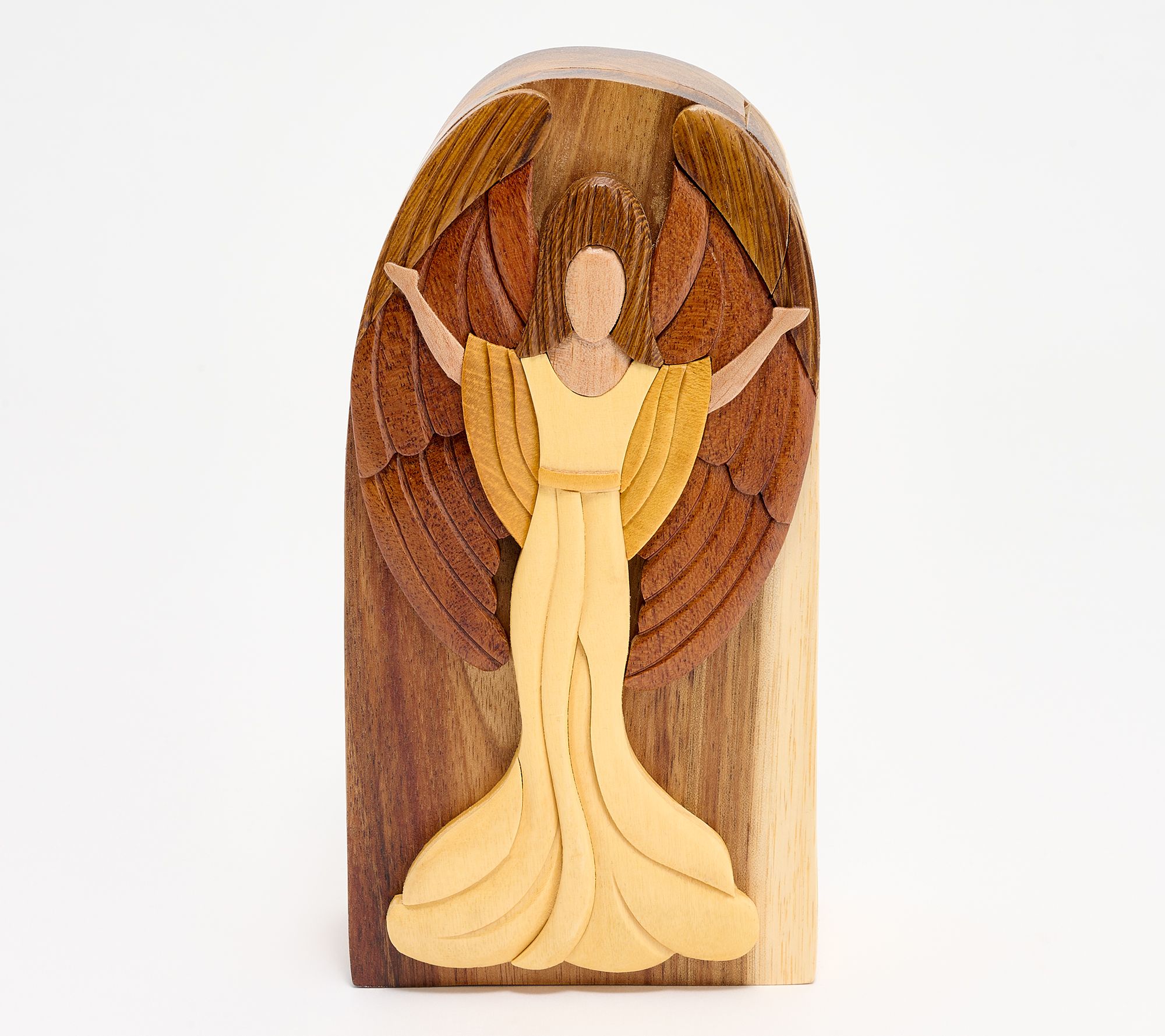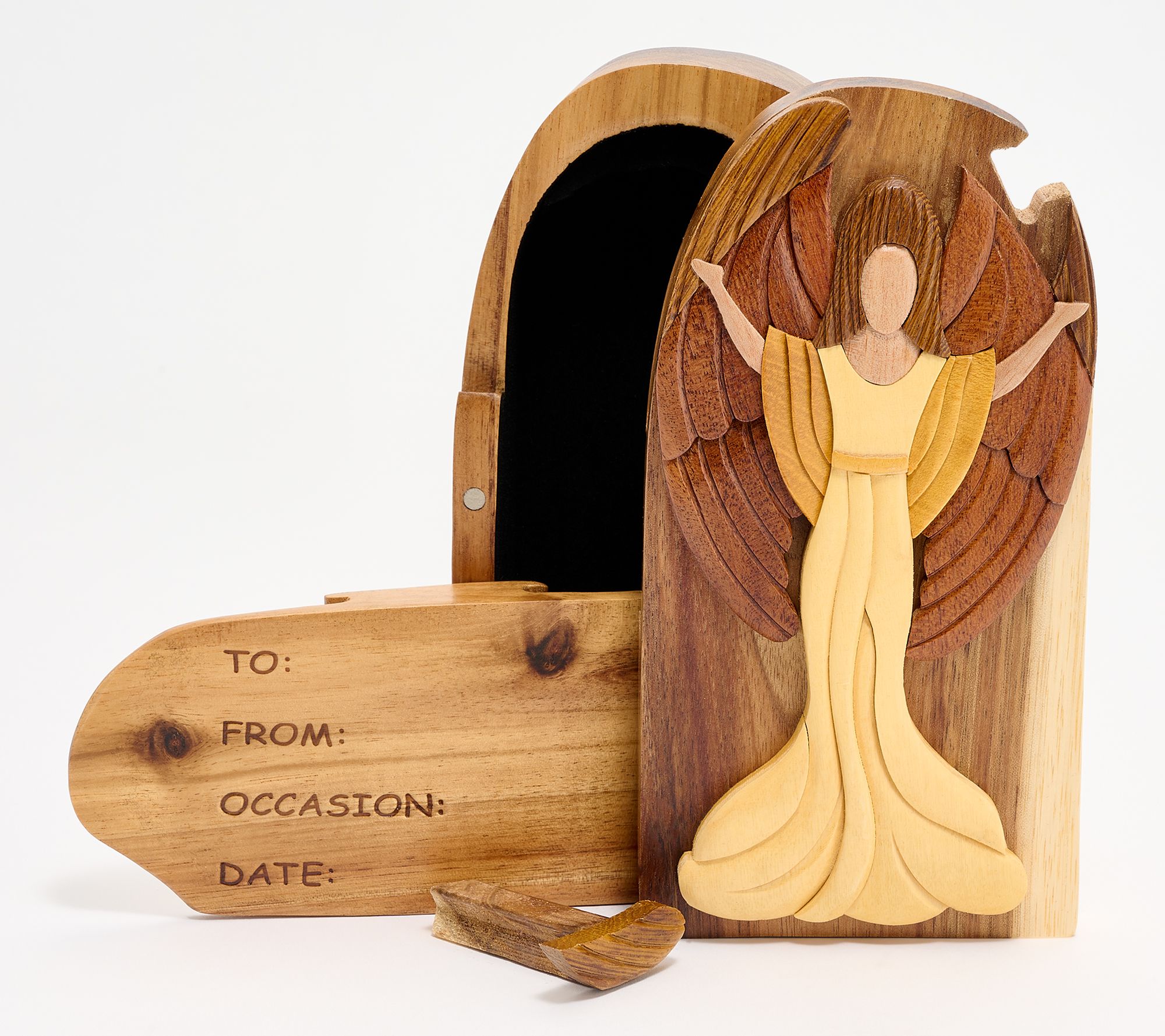 A clever way to give someone a gift card, money, or small item (no need to wrap!), this puzzle box can be reused by the recipient to tuck away trinkets, tiny treasures, jewelry, and whatever keepsakes they want to keep safe. The intricate angel design is beautifully crafted from hardwoods and features a hidden storage area with a magnetic closure. From Carver Dan.