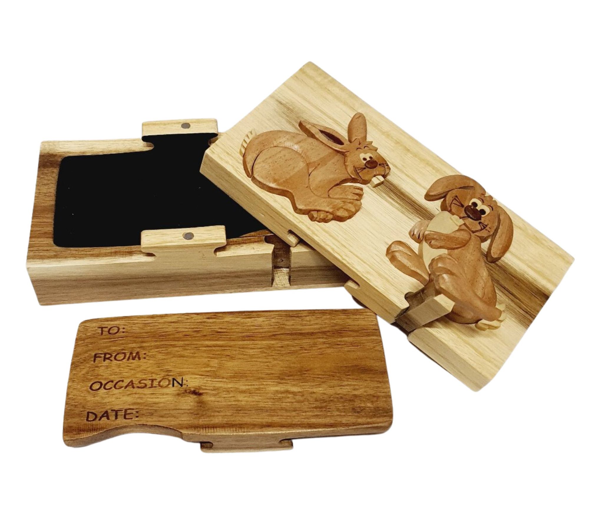 • To, From, Date, and Occasion: burned into inside lid cover to be filled in