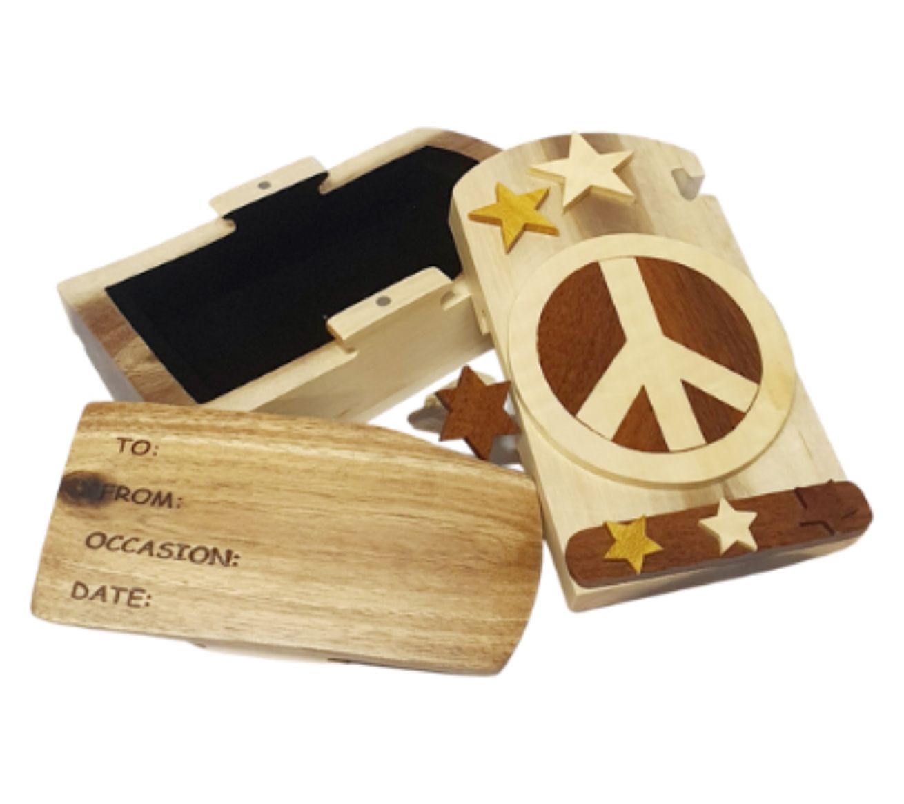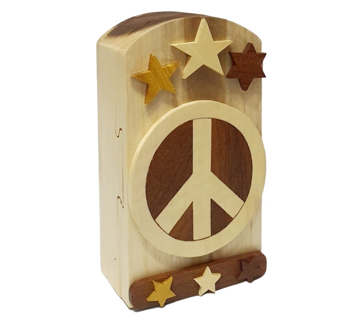 Puzzled about what to give this year? This Carver Dan's peace sign puzzle box pieces together the perfect gift. Handcrafted from the finest hardwoods, it offers hidden storage that can hold a second surprise inside. From Carver Dan's.