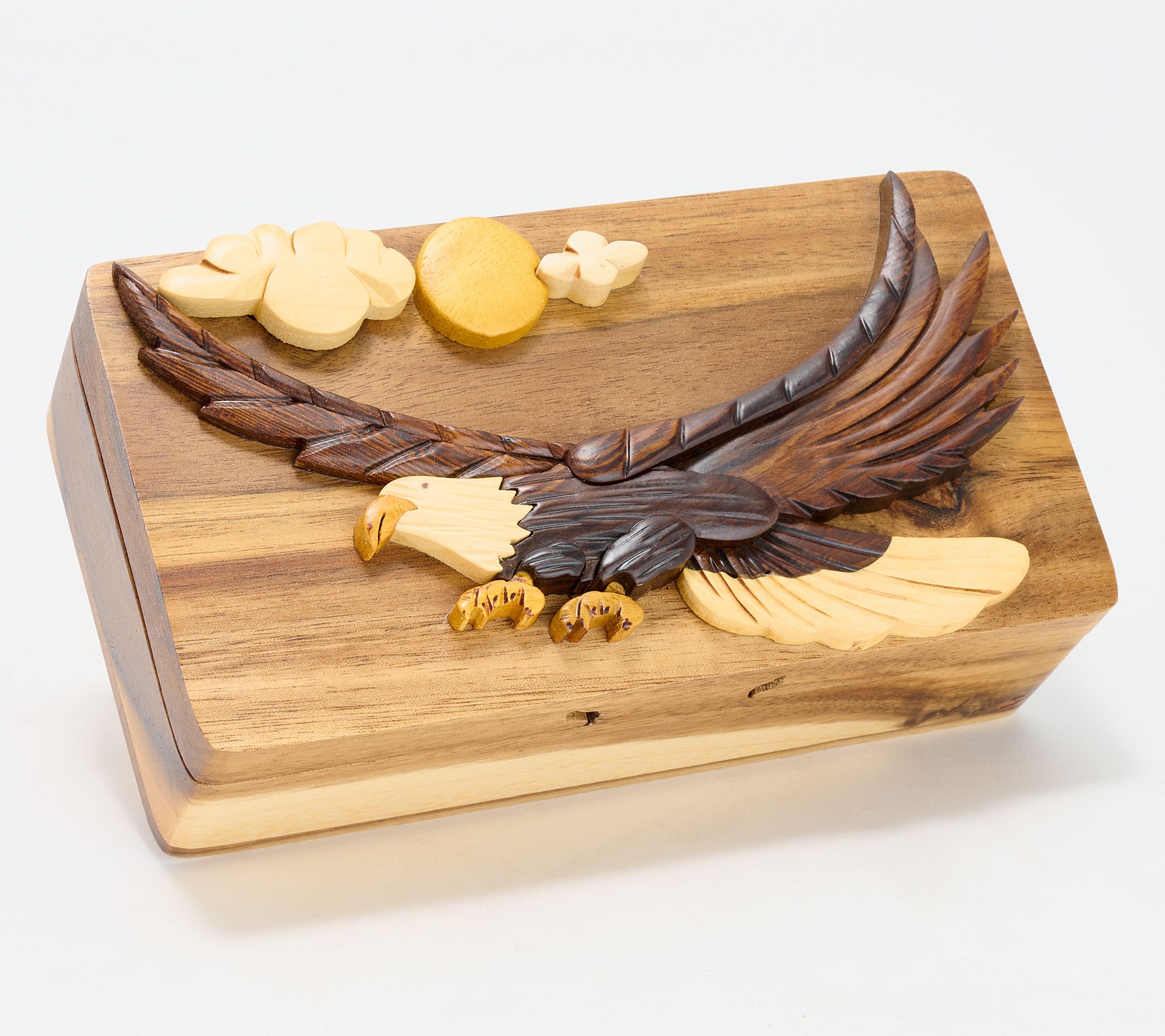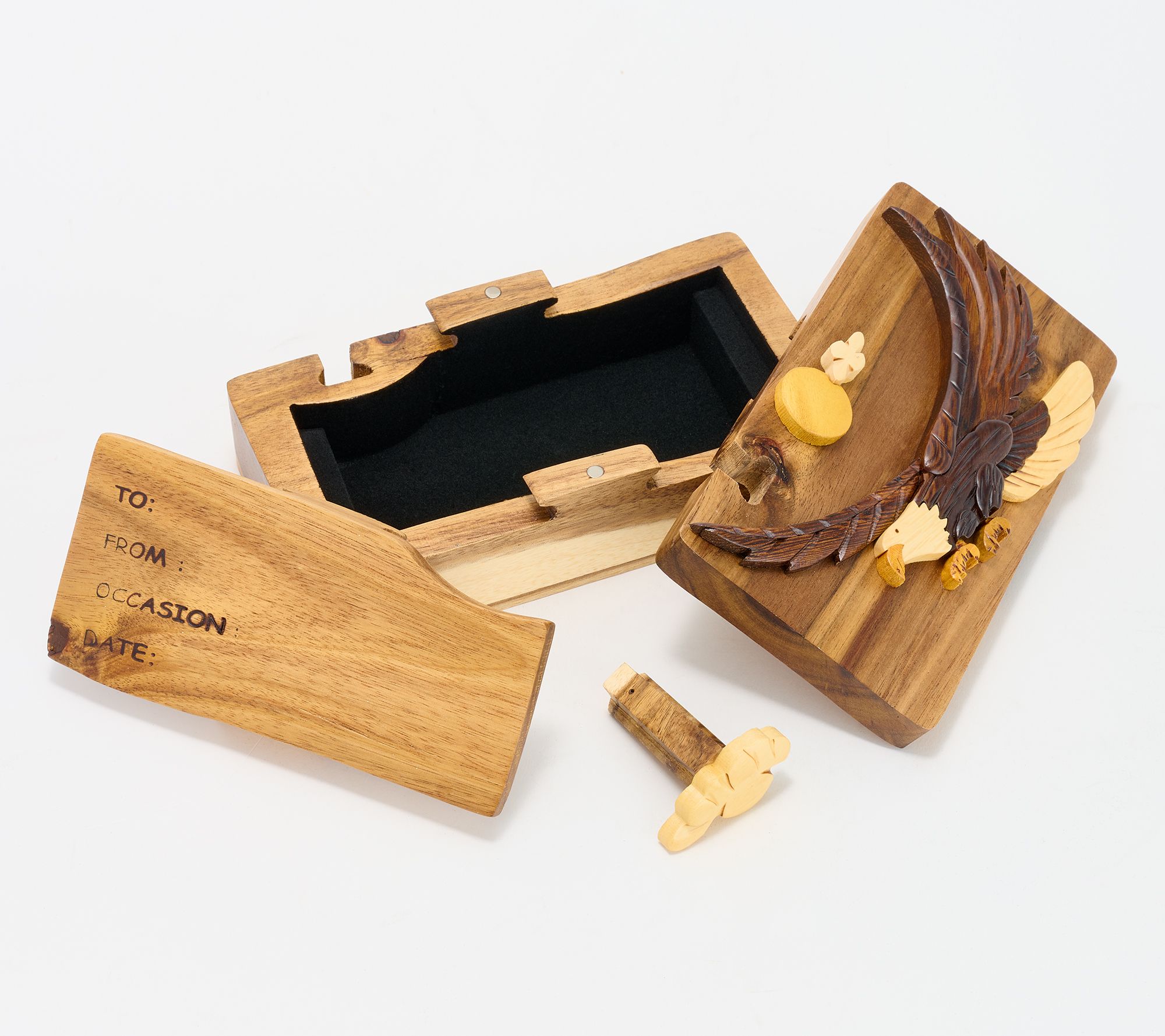 Imagine the joy of discovering hidden treasures in Carver Dan's Soaring Eagle puzzle box. Crafted from hardwoods and polished to perfection, this unique box features a magnetic closure to keep your trinkets, jewelry, and keepsakes secure. A great way to give someone a gift card, money, or small item -- no need to wrap! From Carver Dan.