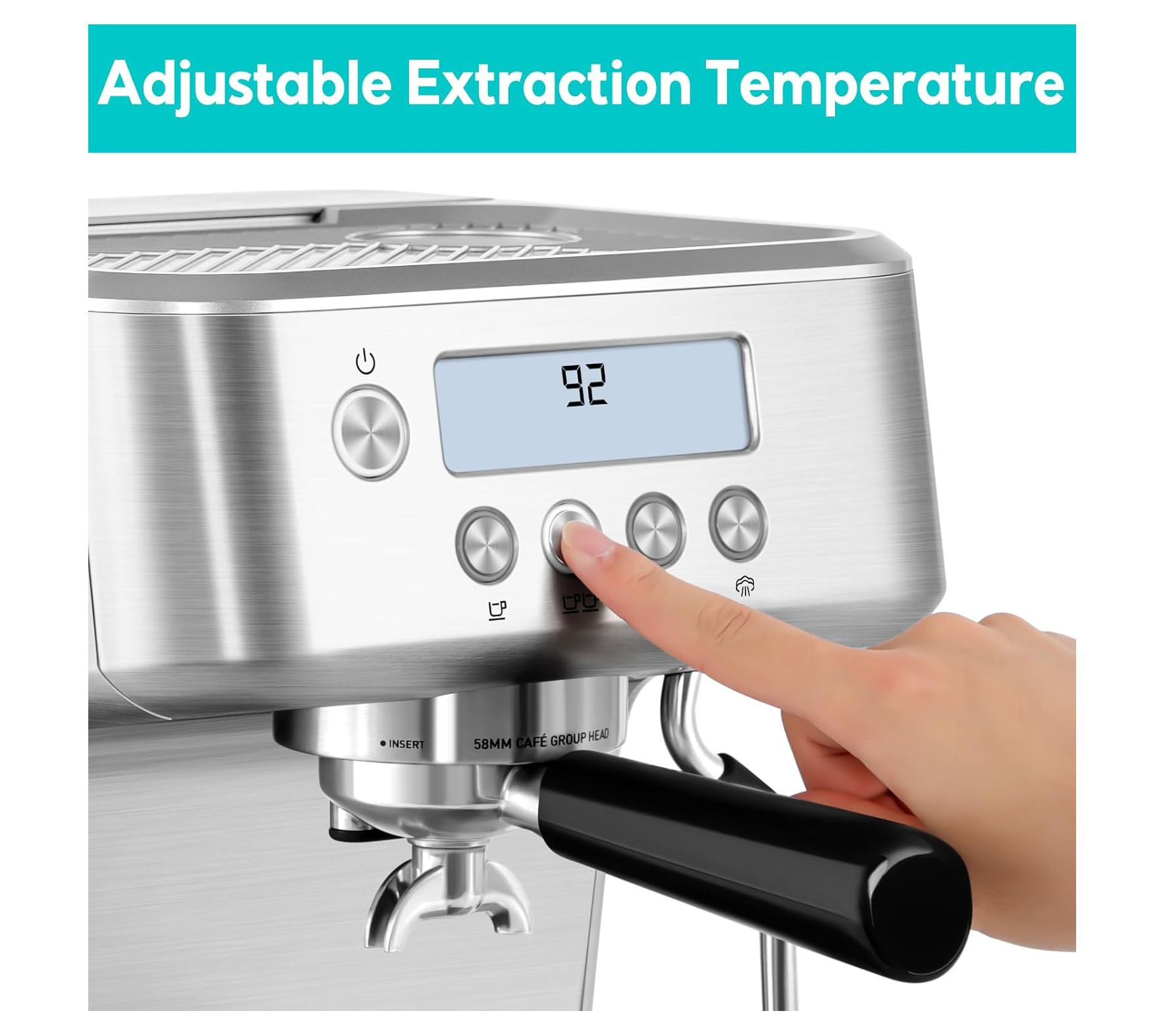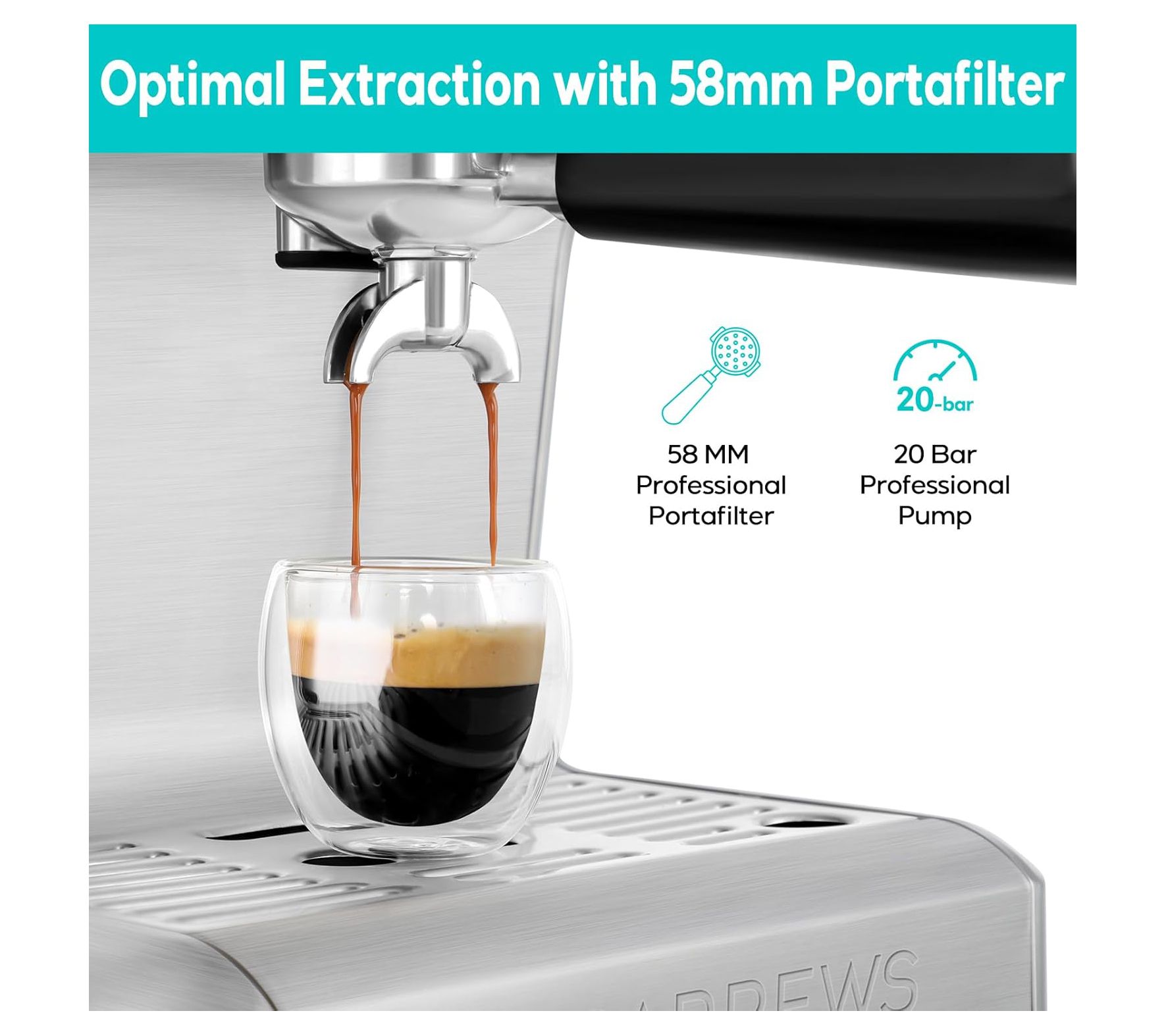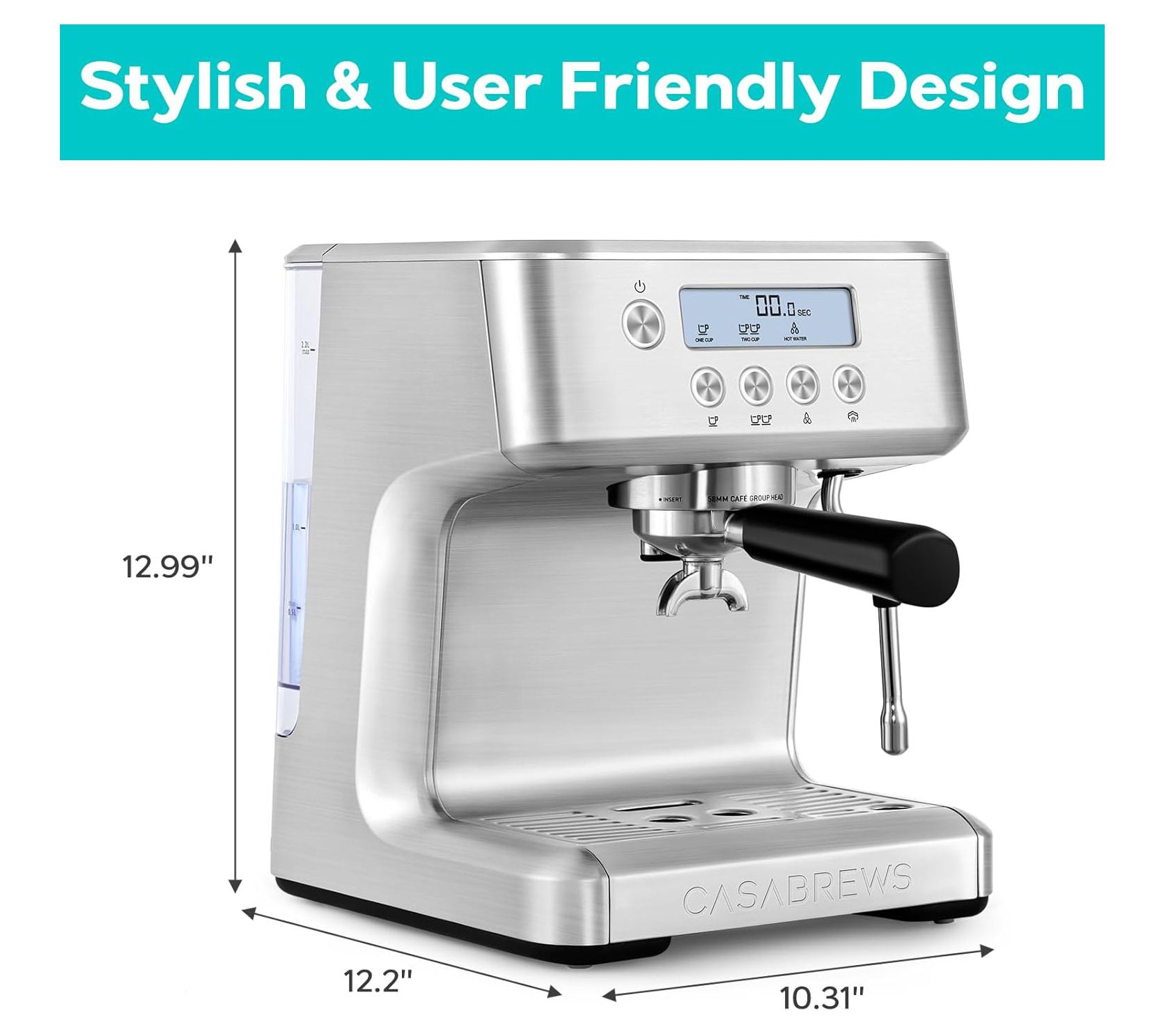 • Includes espresso machine with milk foaming steam wand, 58mm portafilter, two single cup filters, two double cup filters, cleaning needle, and 58mm tamper