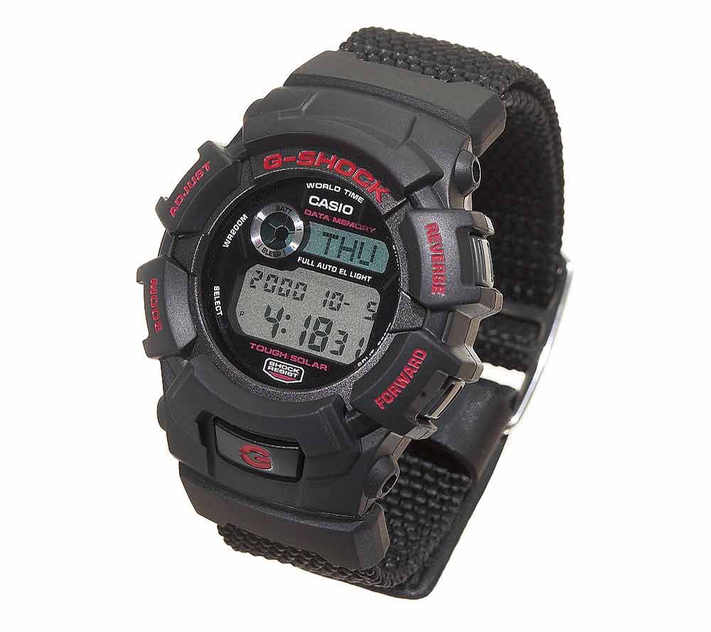 For the sports enthusiast. This cool Casio G-Shock sports watch is fashioned with a cool digital display so you'll always be on time. Nylon strap. Round stainless steel caseback. Buckle closure. Water resistant to 200M.