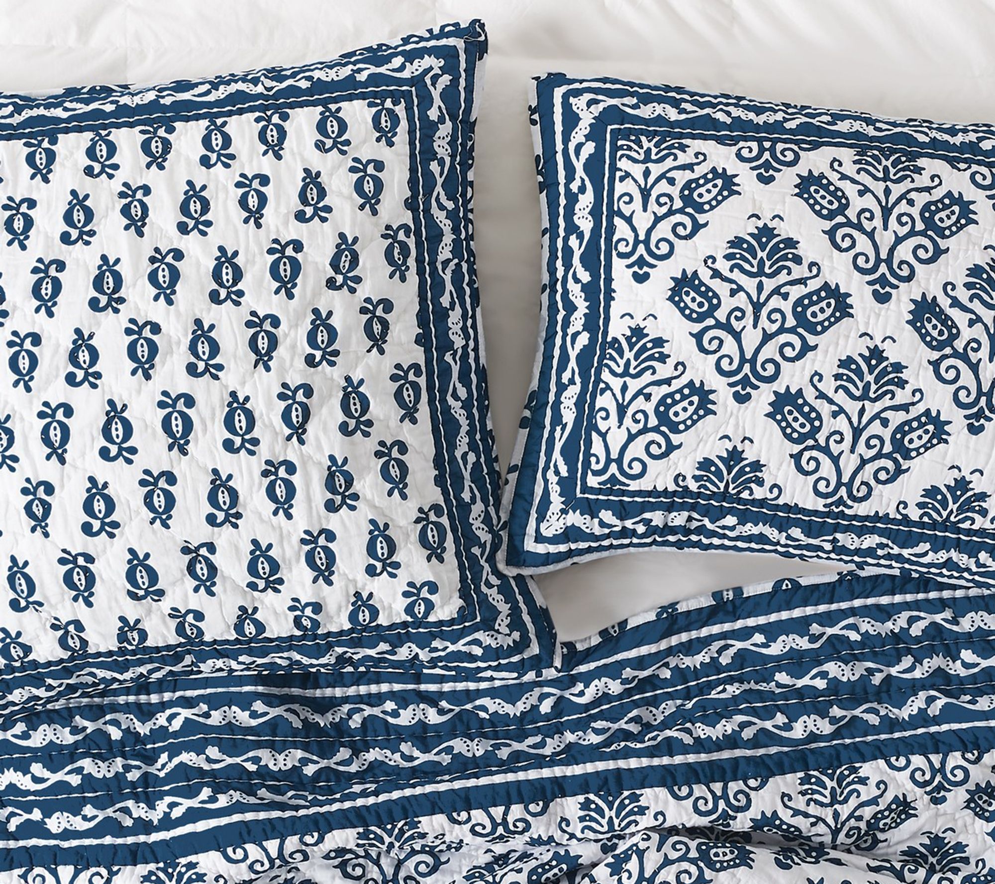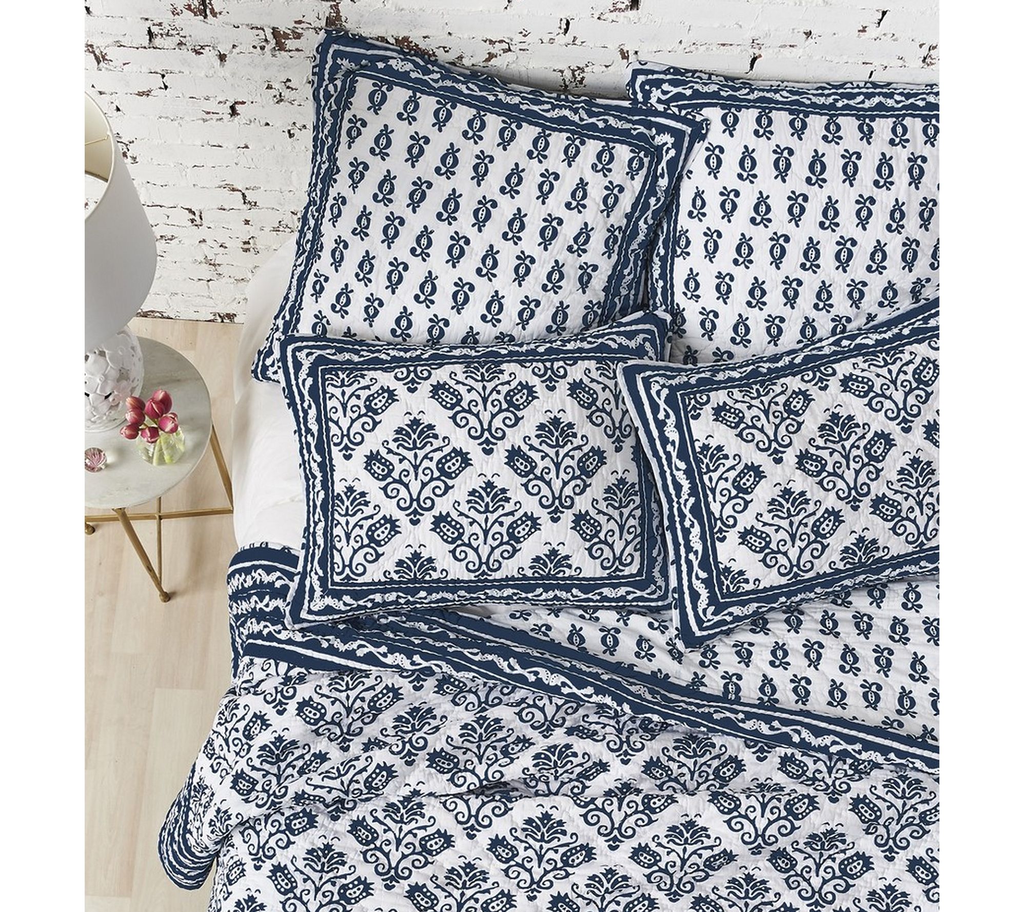 Inspired by 1800's wallpaper, the timeless design of this cotton quilt takes on boho appeal with its indigo-on-white tulip pattern and soft quilting.