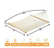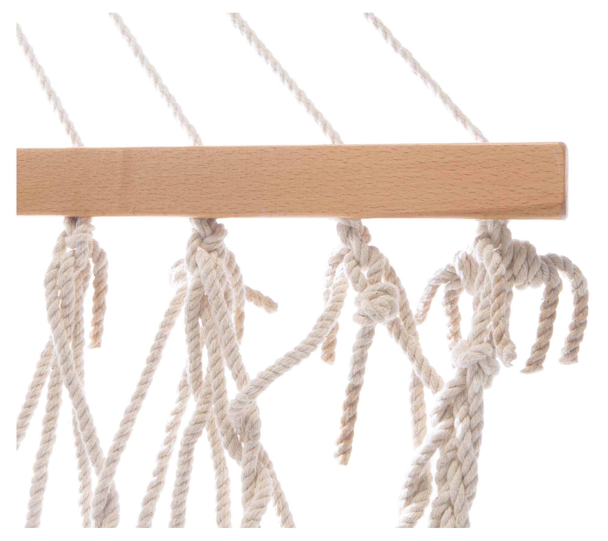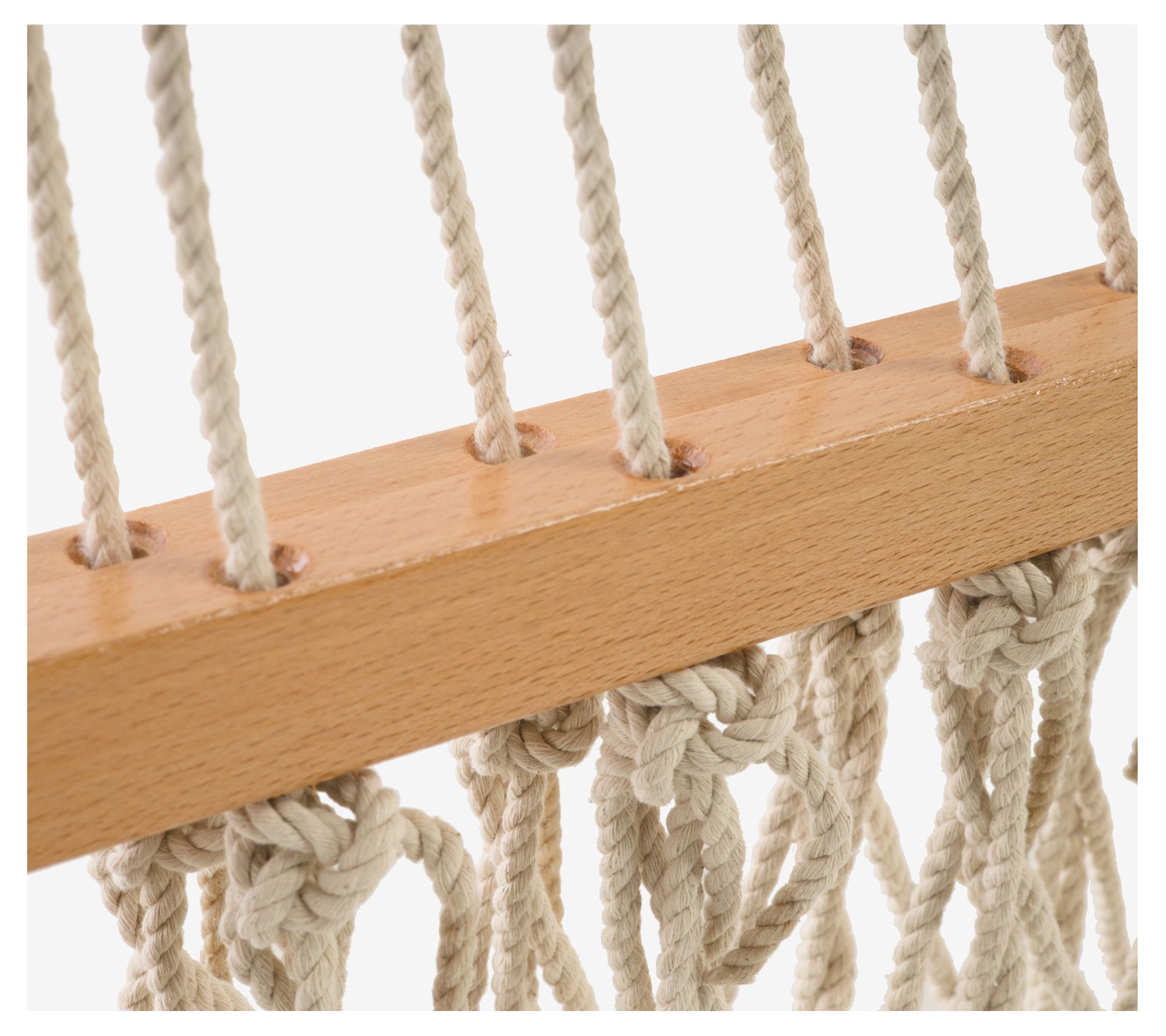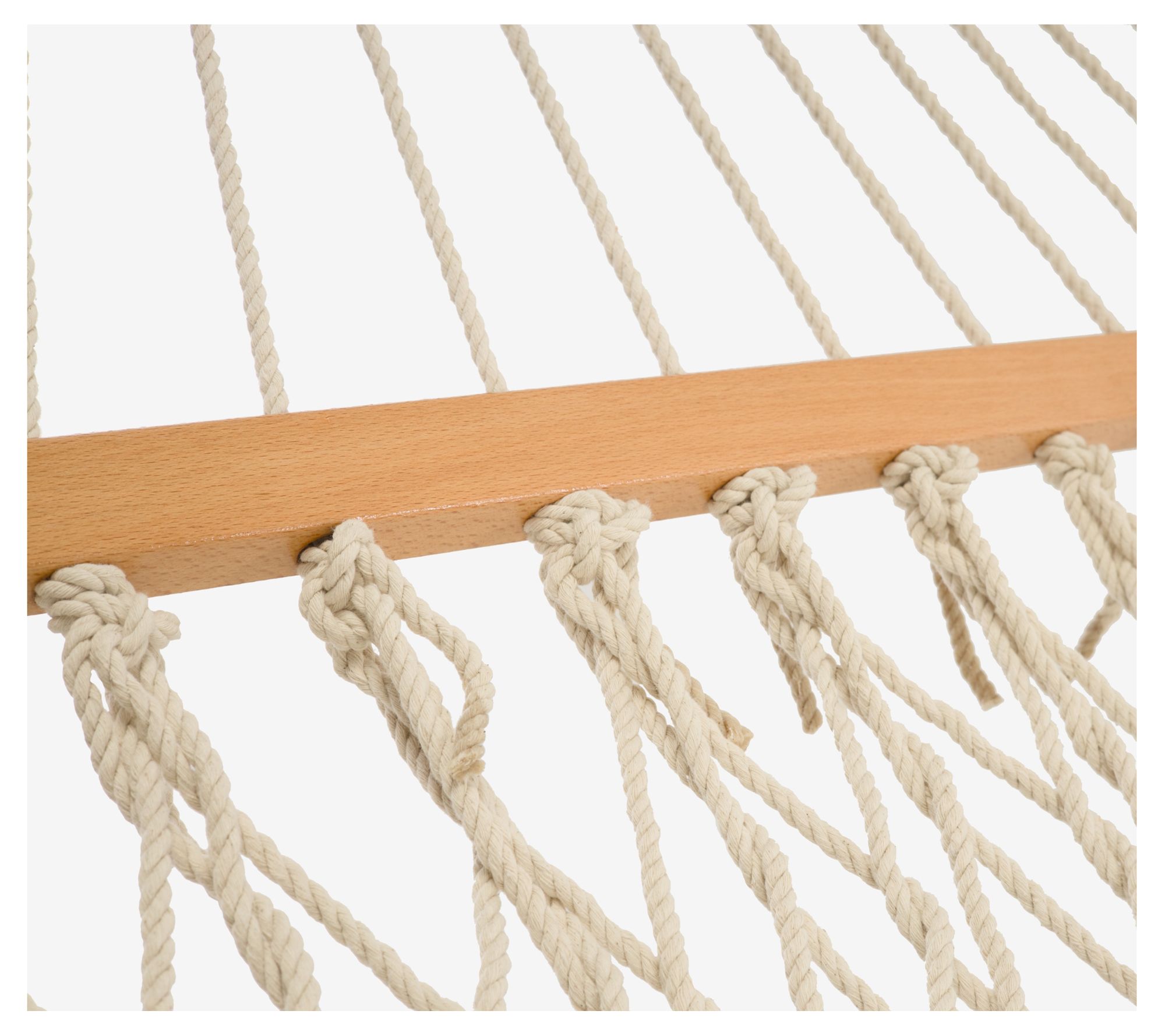Experience the ultimate relaxation with this rope hammock that's perfect for lounging outdoors. Its traditional design features a high-density weave for unparalleled comfort, supported by sturdy hardwood spreader bars. This hammock is ideal for stretching out alone or sharing a peaceful moment with someone special, easily accommodating two people. From Castaway Living.