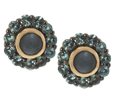 • Stud earrings with bezel-set cat's-eye alexandrite cabochons surrounded by a border of round, green alexandrite gemstones in black rhodium-plated prong settings; highly polished