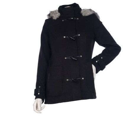 Coziness comes in quite the chic package this season--in the form of this hooded coat. Faux fur trims the hood, not only offering an extra layer of warmth, but adding some serious style, as well. From Centigrade(R) Outerwear.