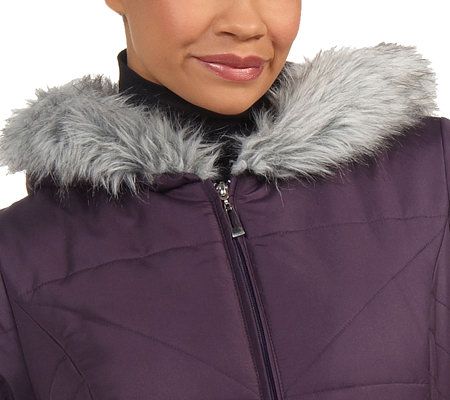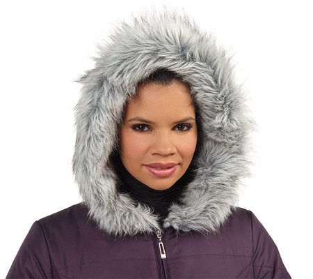 Fully lined, princess seams, hood with faux fur trim, quilted detail, two front pockets, and a silvertone zipper