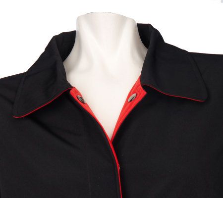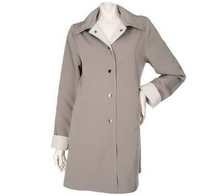 • Snap-front closure, shirt collar, 3/4 length silhouette, slit pockets