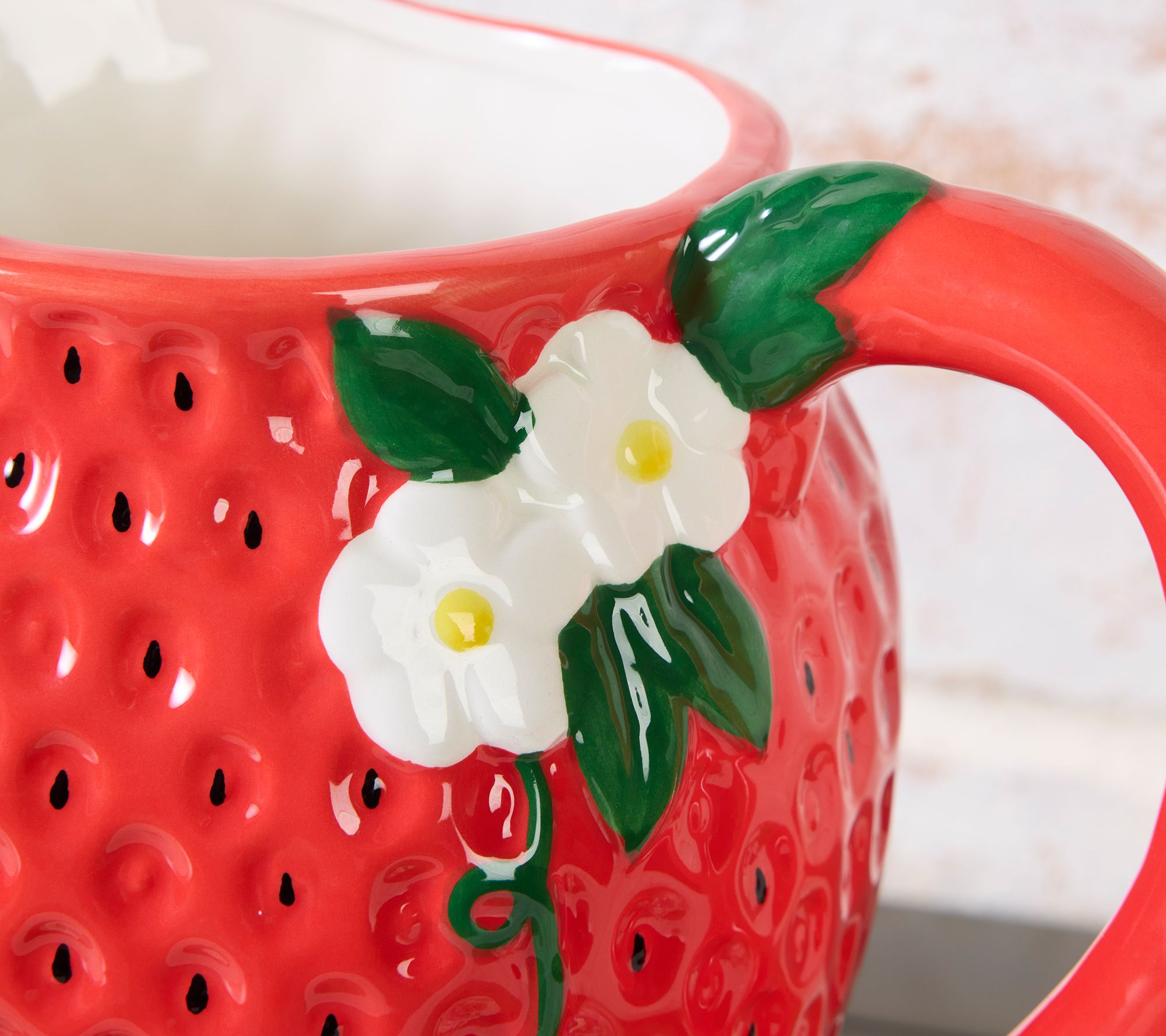 Freshly picked! Give your flavored water, fizzy drinks, or fruity sips a fun place to flow from with this strawberry-shaped ceramic pitcher. Whether you're entertaining or just enjoying a peaceful moment on the patio, its playful design inspires smiles with every pour. From the Valerie Parr Hill Collection.