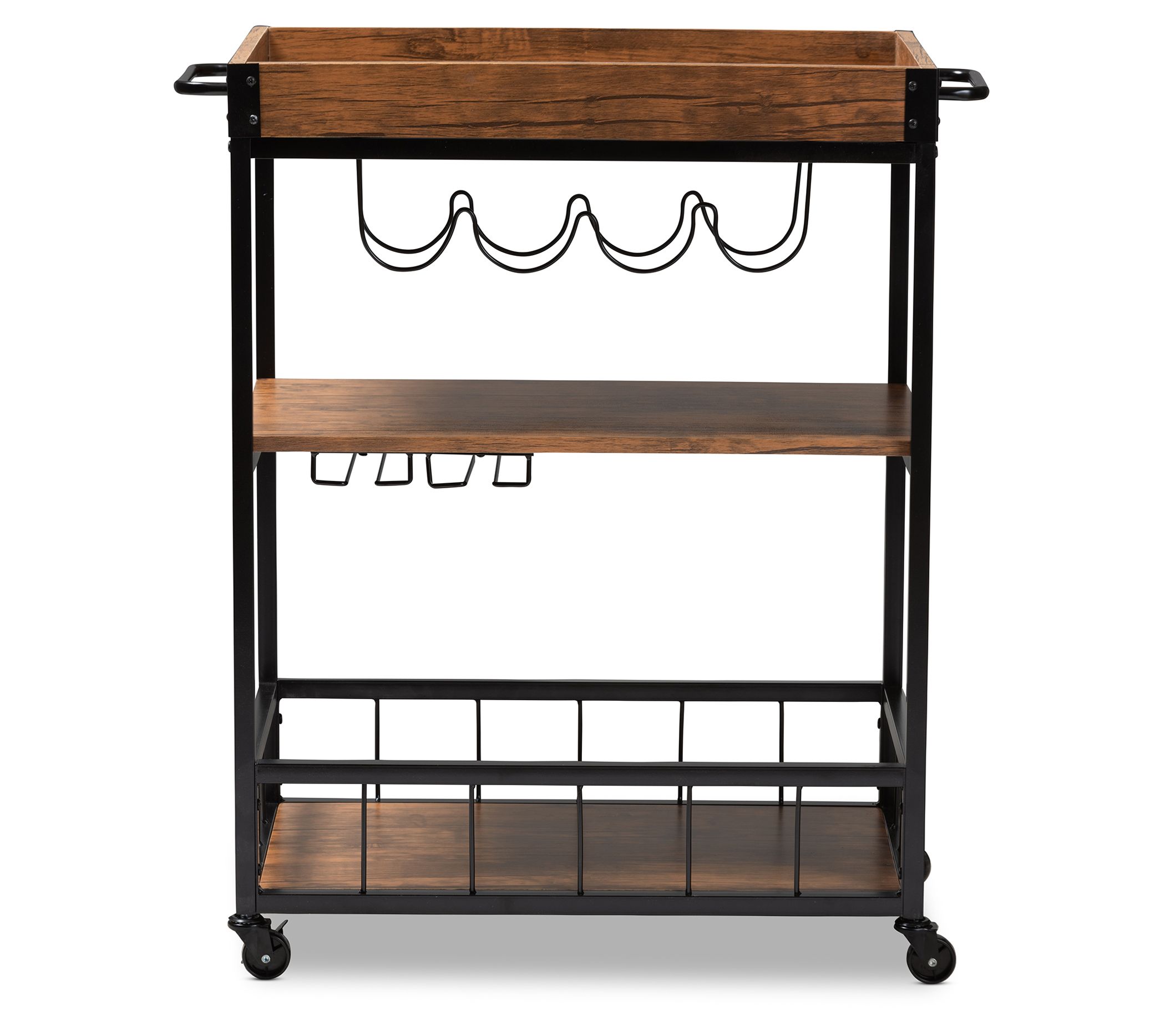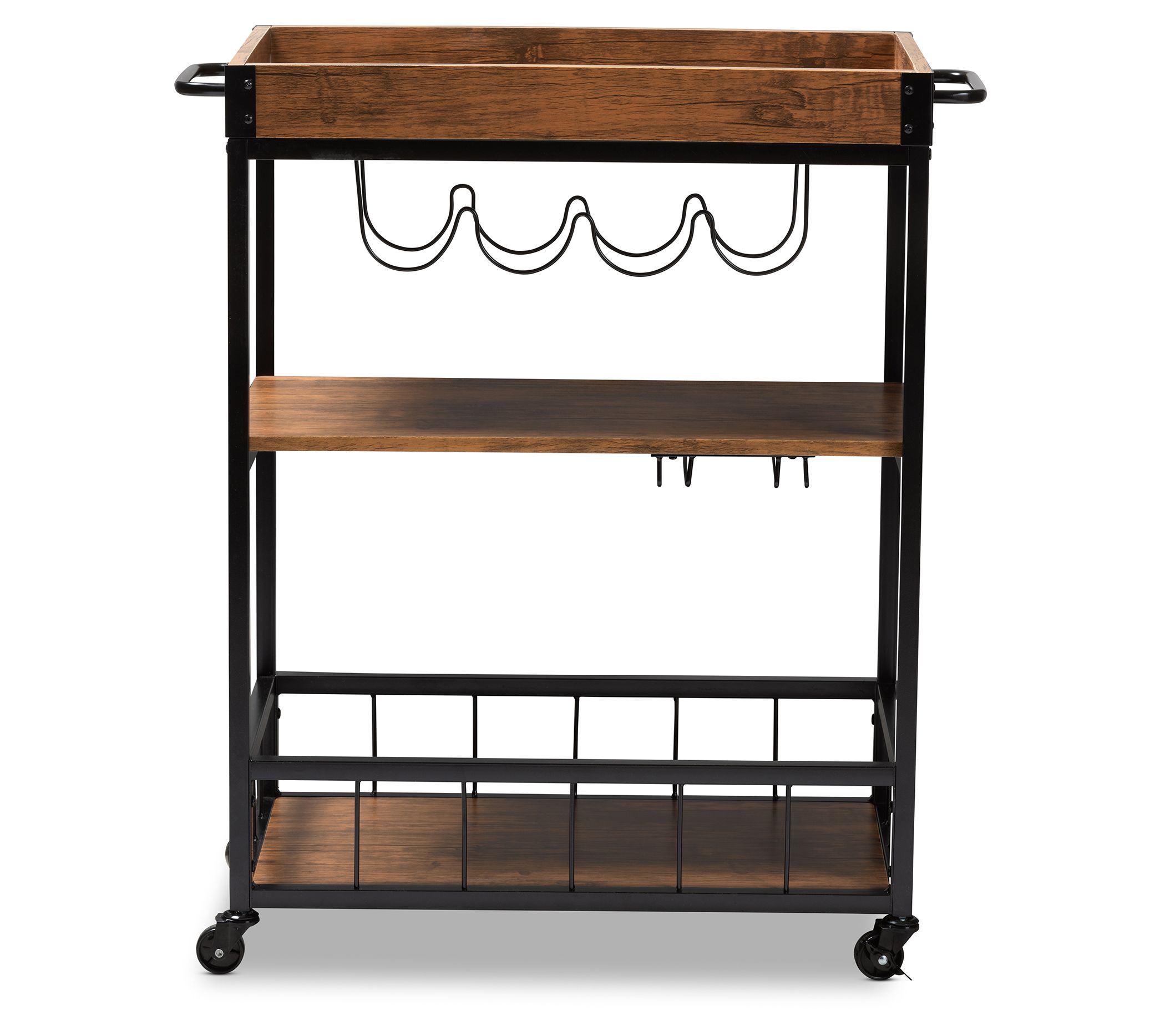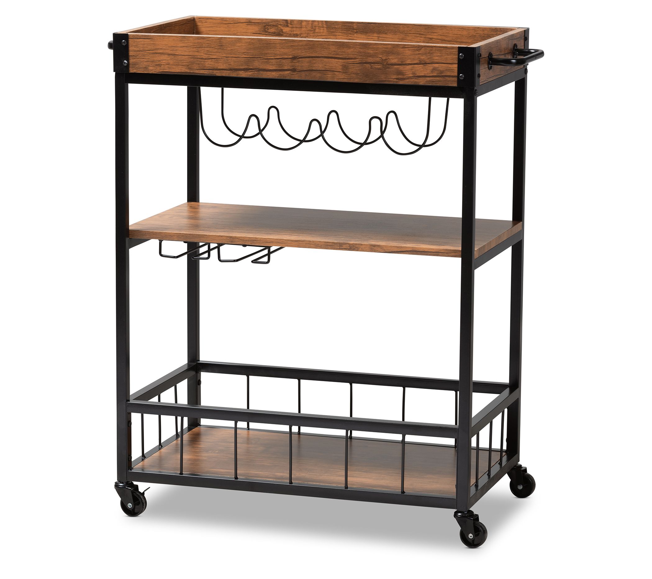 Featuring a built-in wine rack that holds up to four bottles, sturdy shelves, a handy tray top, and a stemware rack for up to four glasses, this sturdy bar cart is the perfect way to add storage and industrial-chic style to your space. From Baxton Studio.