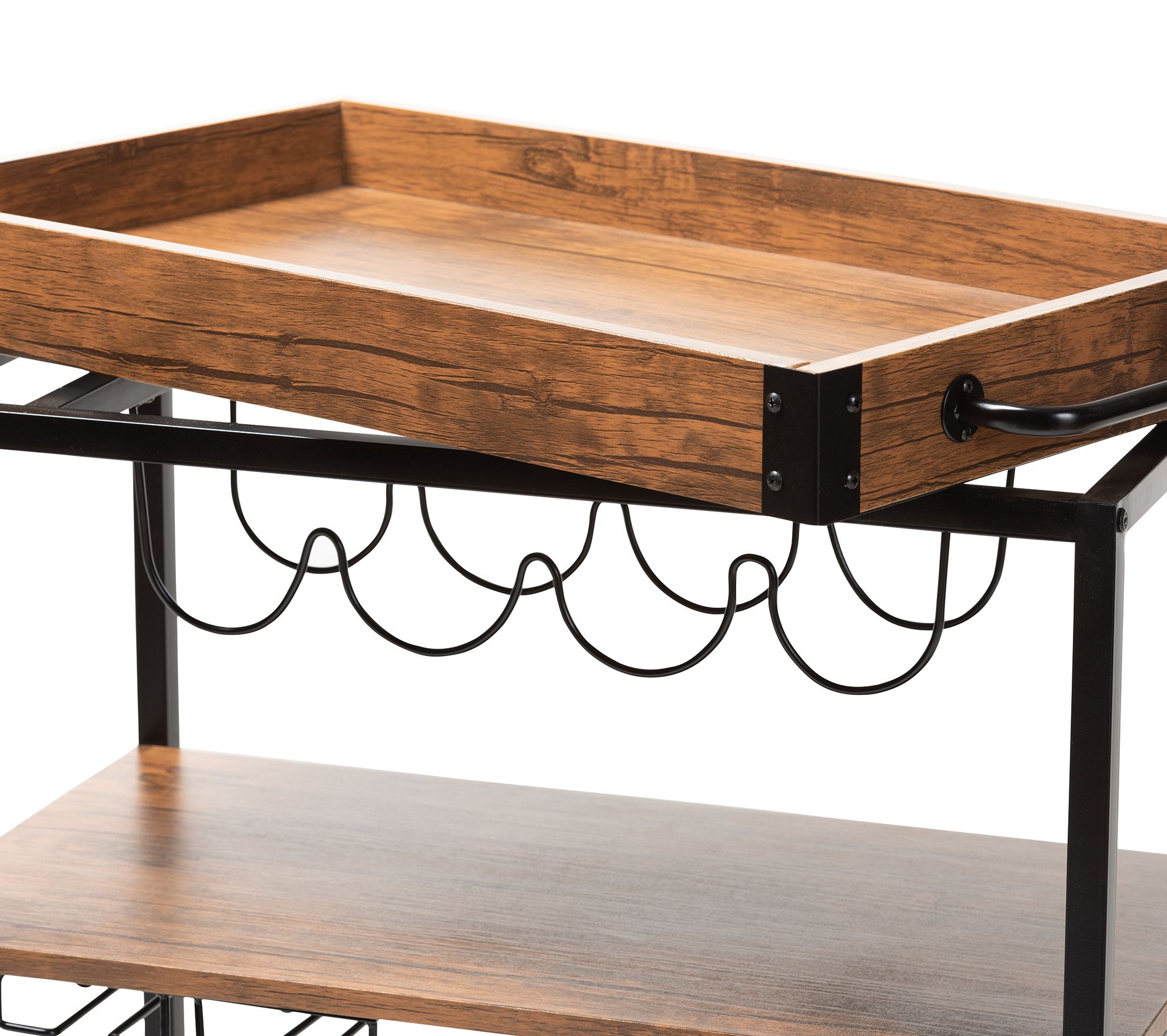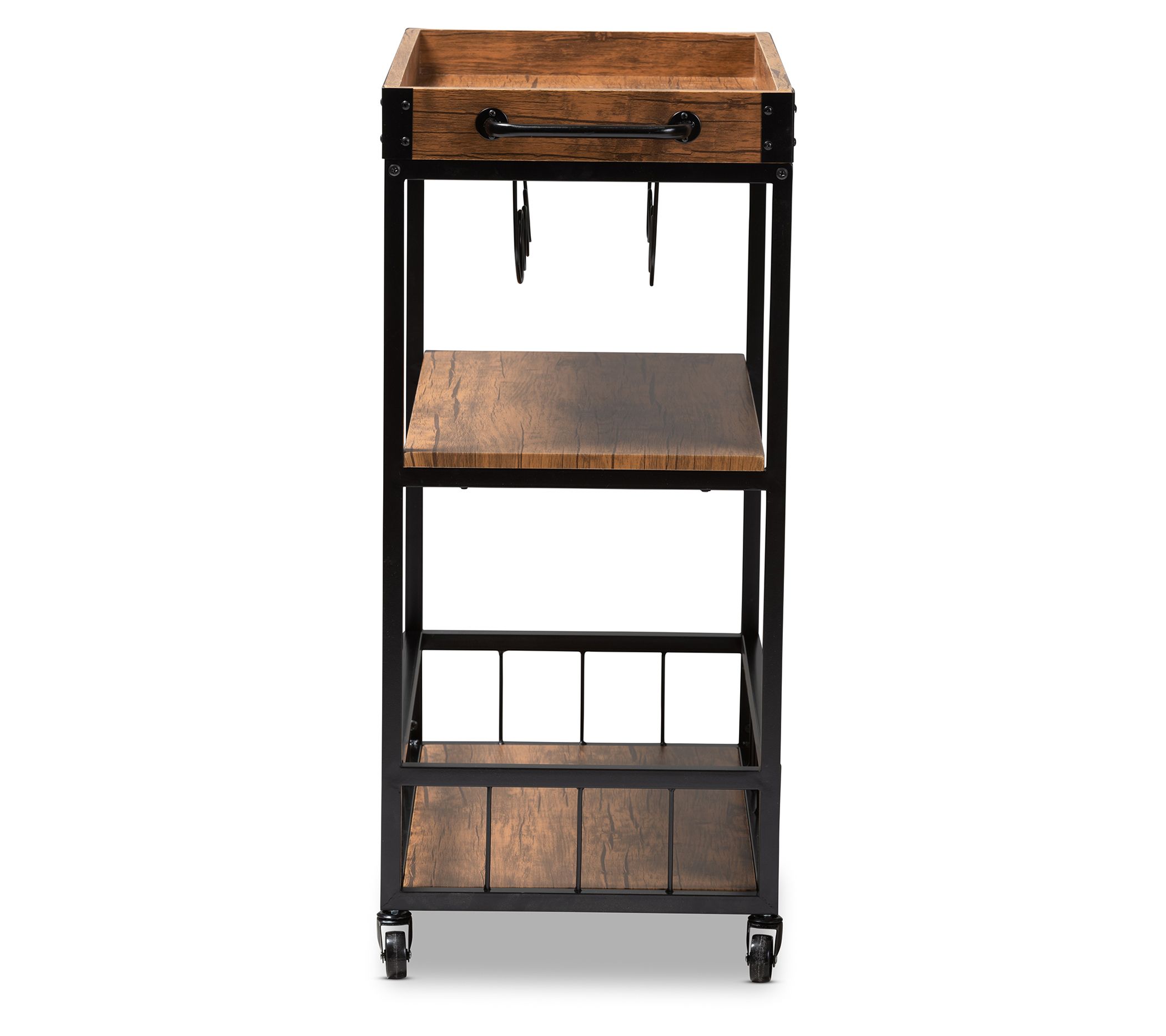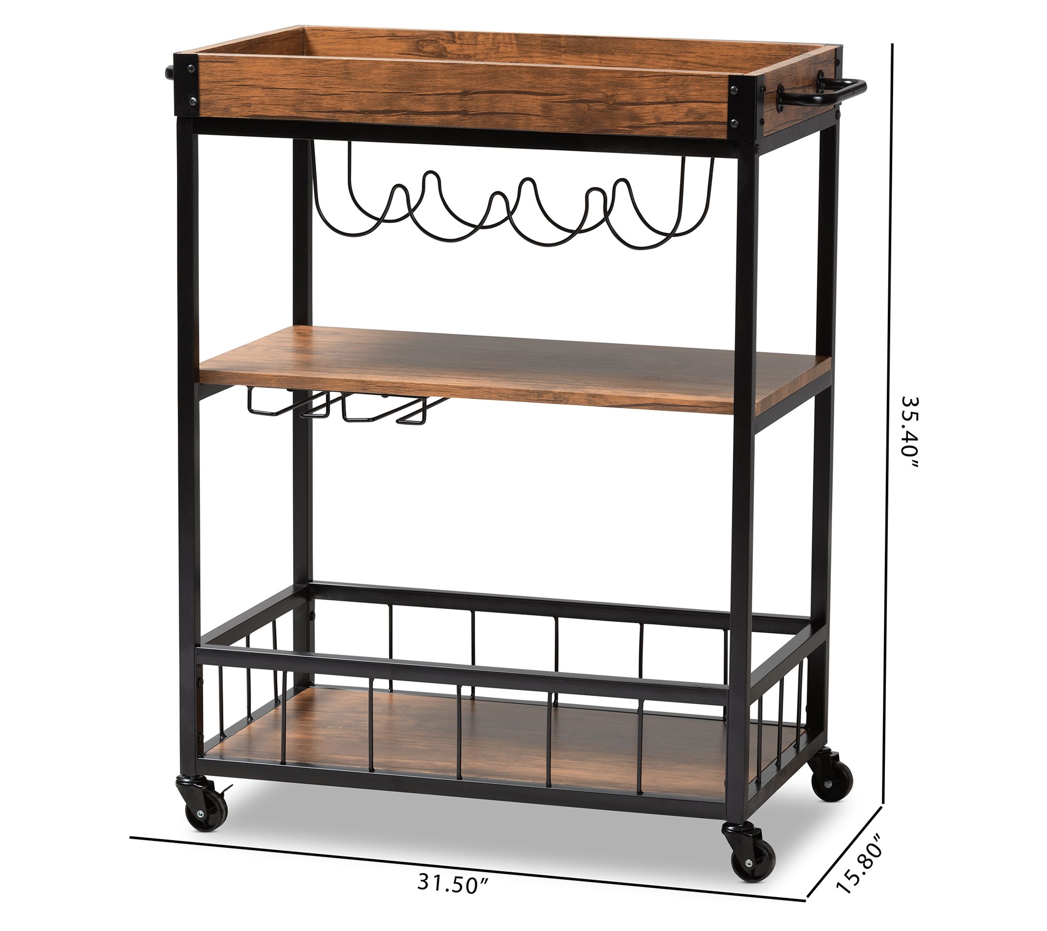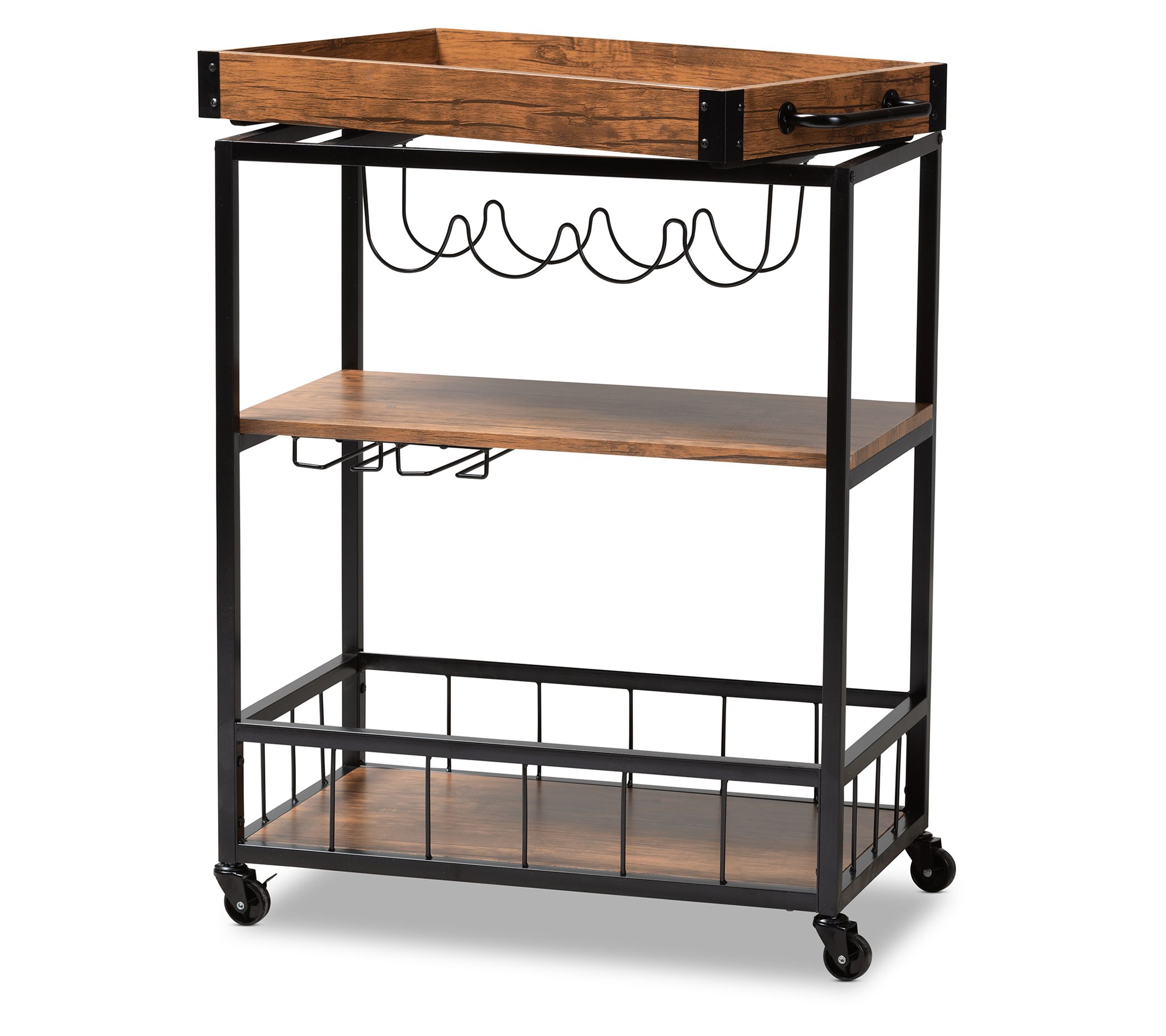 Featuring a built-in wine rack that holds up to four bottles, sturdy shelves, a handy tray top, and a stemware rack for up to four glasses, this sturdy bar cart is the perfect way to add storage and industrial-chic style to your space. From Baxton Studio.
