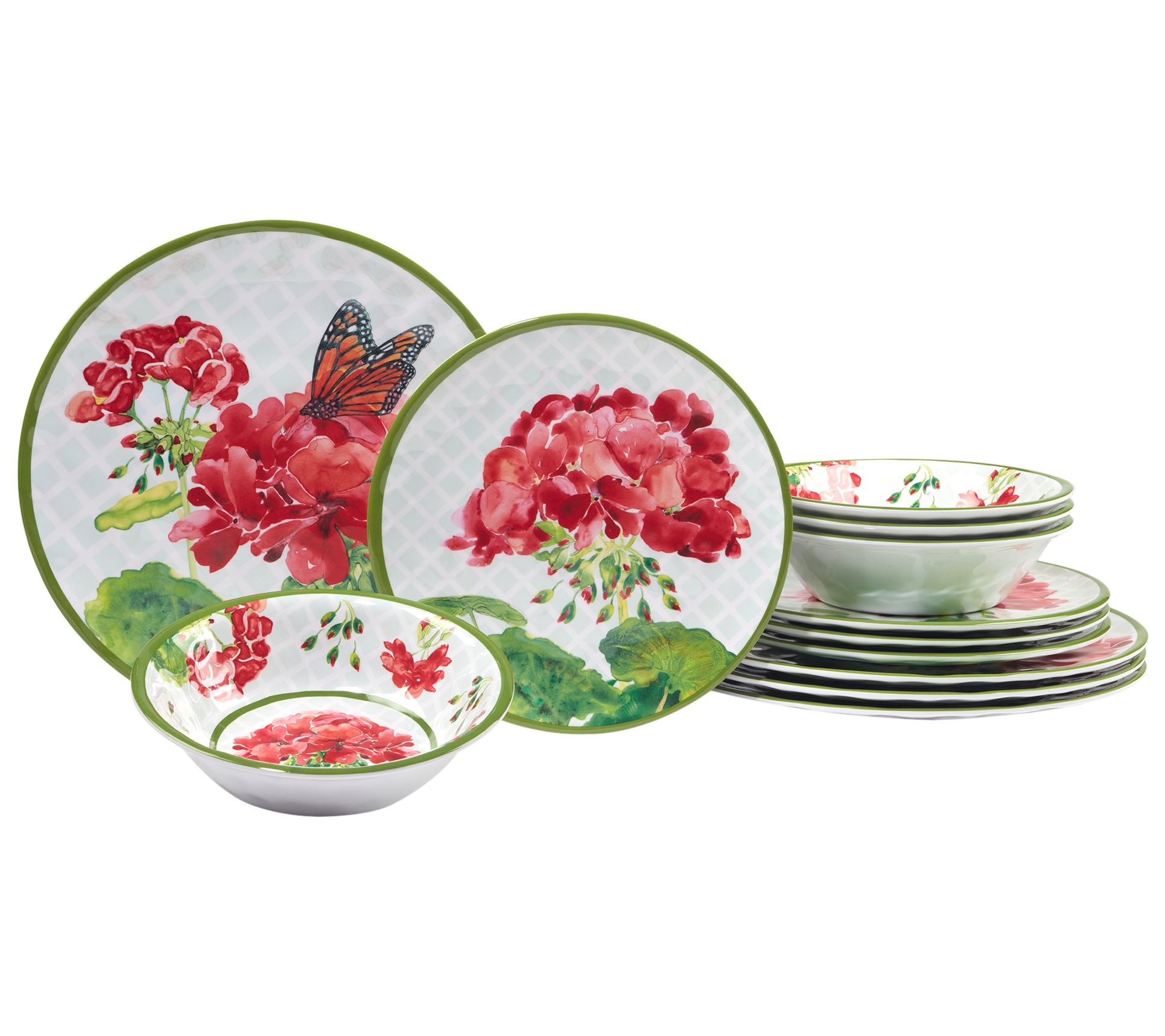 Bring blooming beauty to every meal with this 12-piece dinnerware set, featuring a design of bold red geraniums set against green and white lattice. From Certified International.