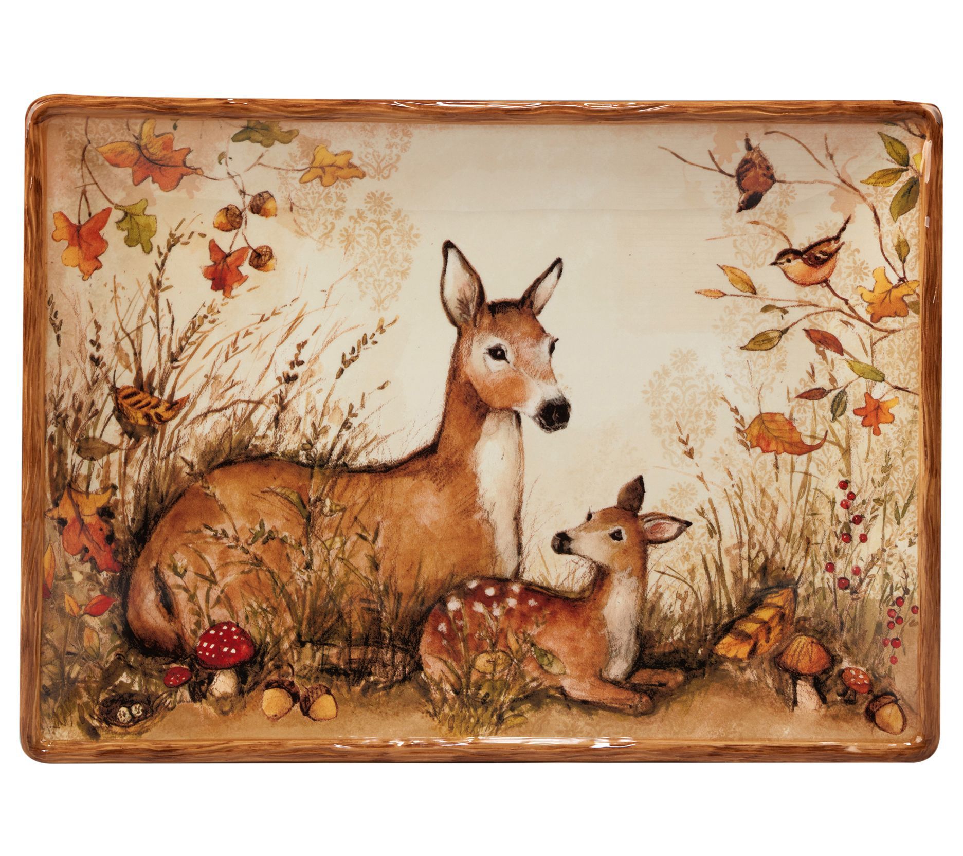 Add a charming accent to your decor with this rectangular platter featuring a peaceful deer and fawn in a forest setting. From the Certified International.