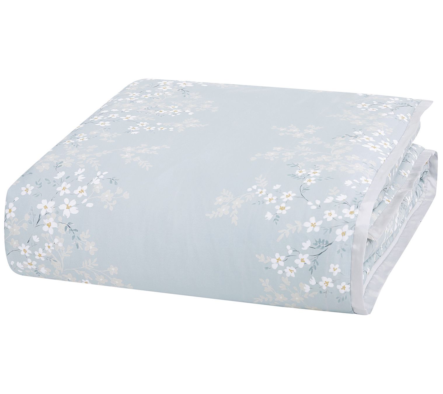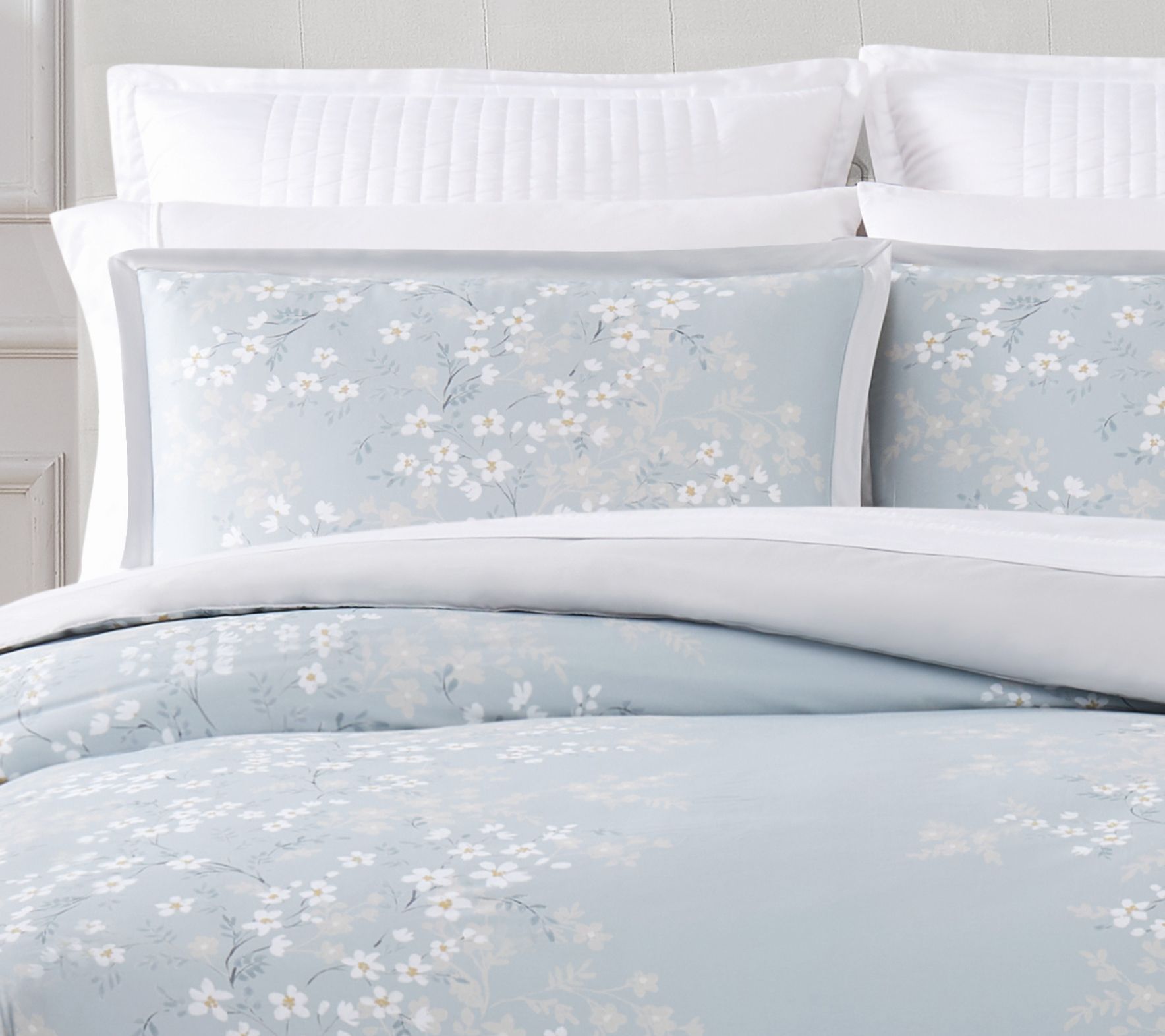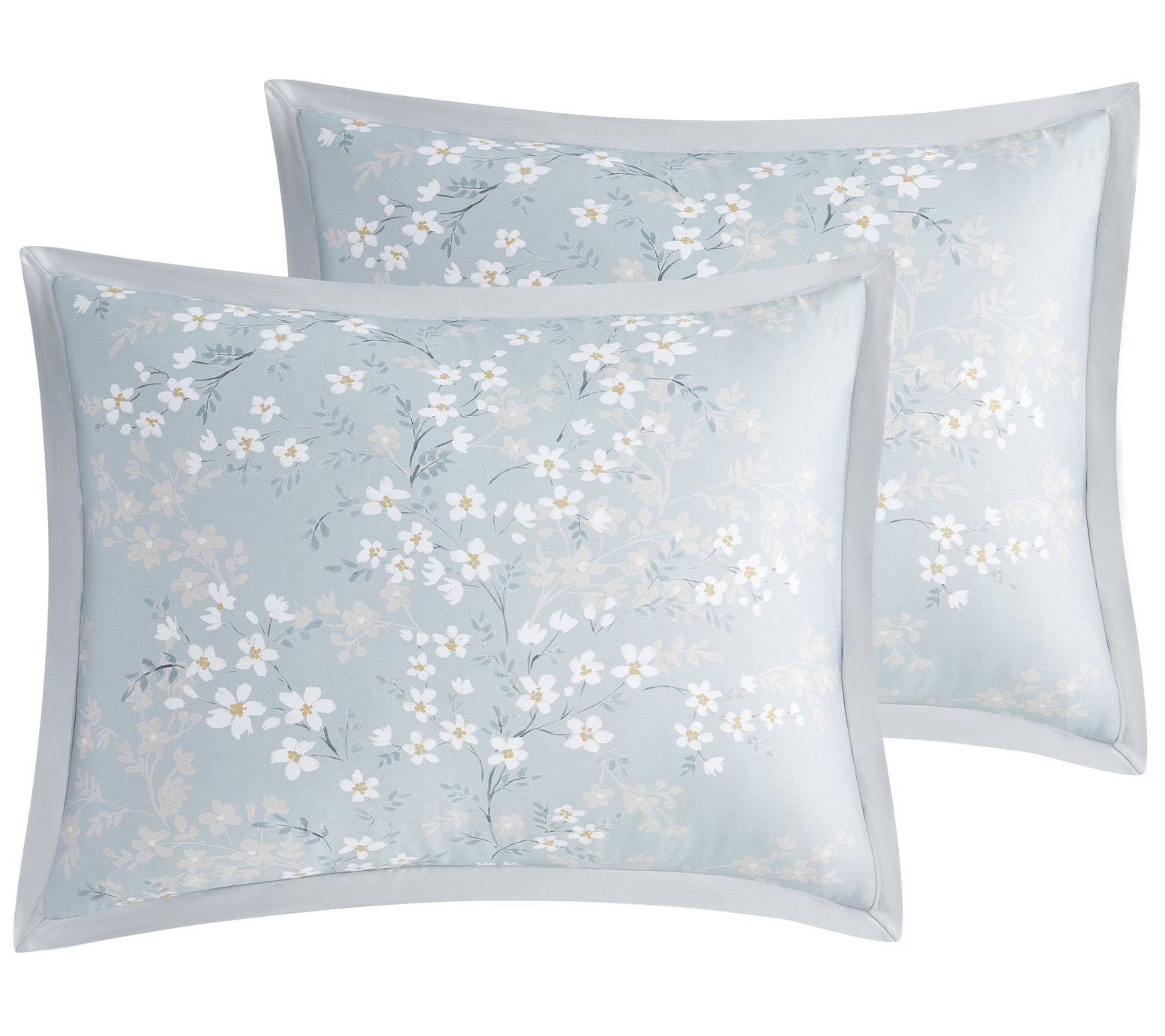 This queen-sized bedding set brings a modern look to the bedroom with its marvelous floral pattern and soft blue slate tone. From Charisma.