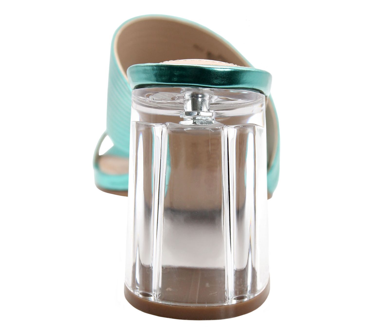 • Slip-on style, asymmetrical band with elastic inset at one side, clear heel, rounded toe