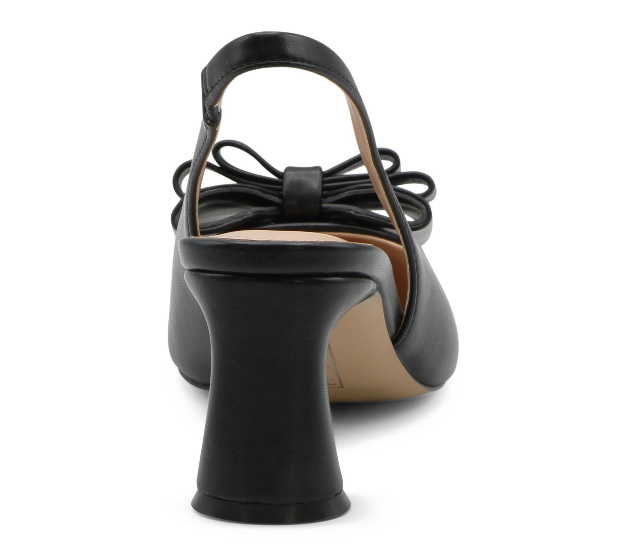 • Bow detail on upper, pointed toe, slip-on slingback design, tapered block heel