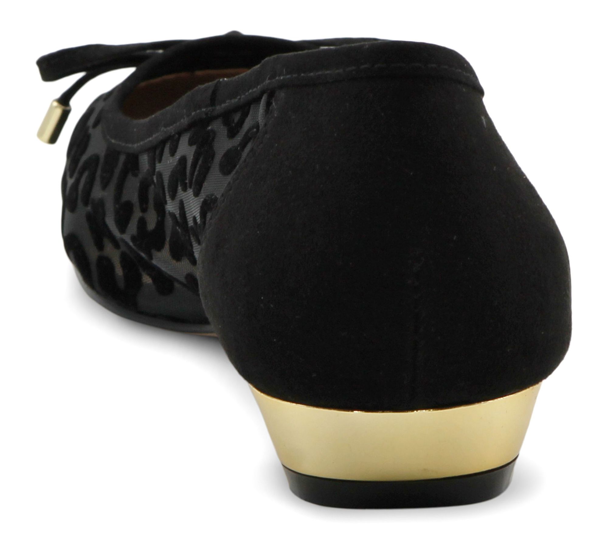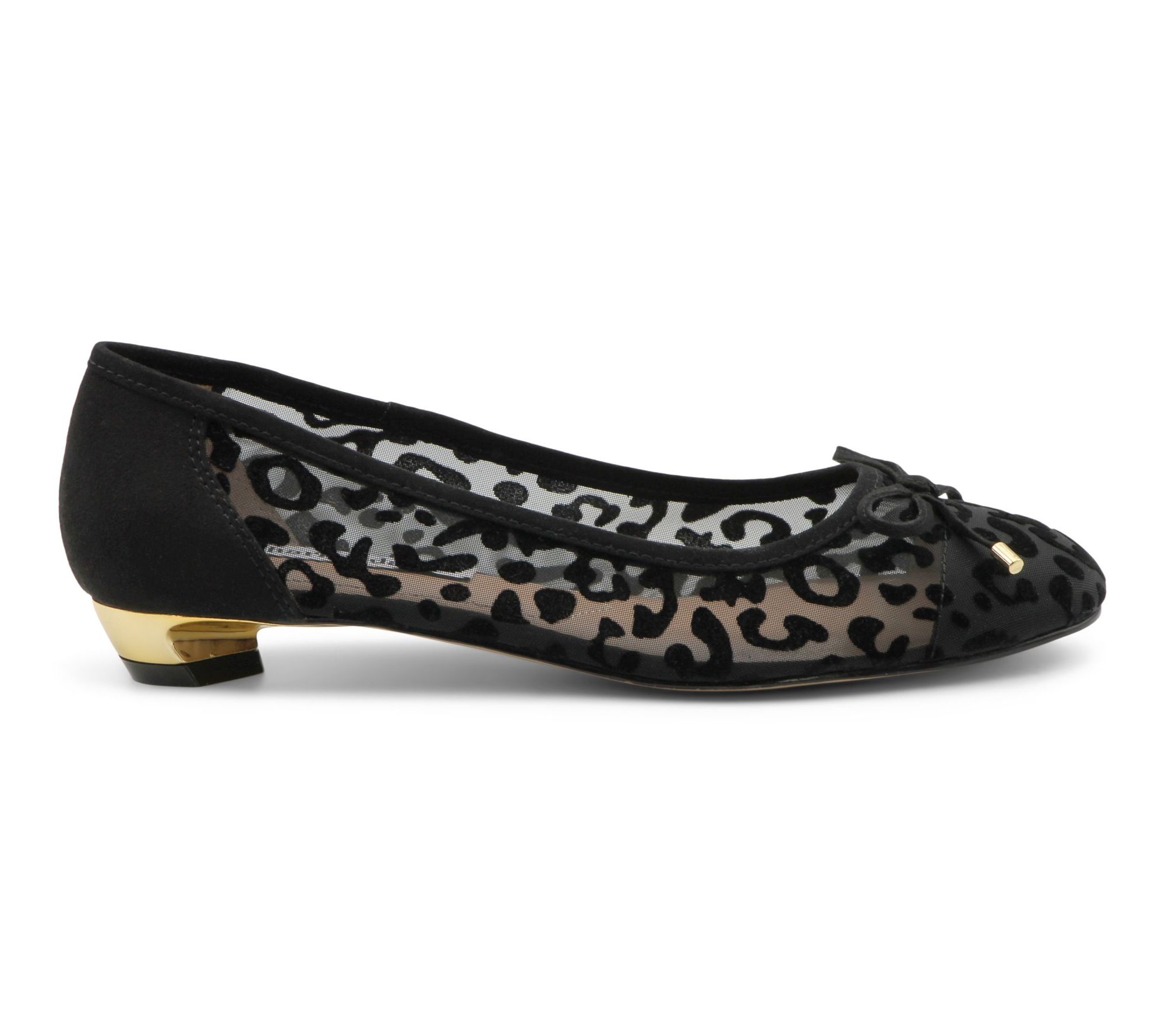 Slip-on design; rounded toe; leopard mesh upper; cap toe with delicate bow accent; low kitten heel